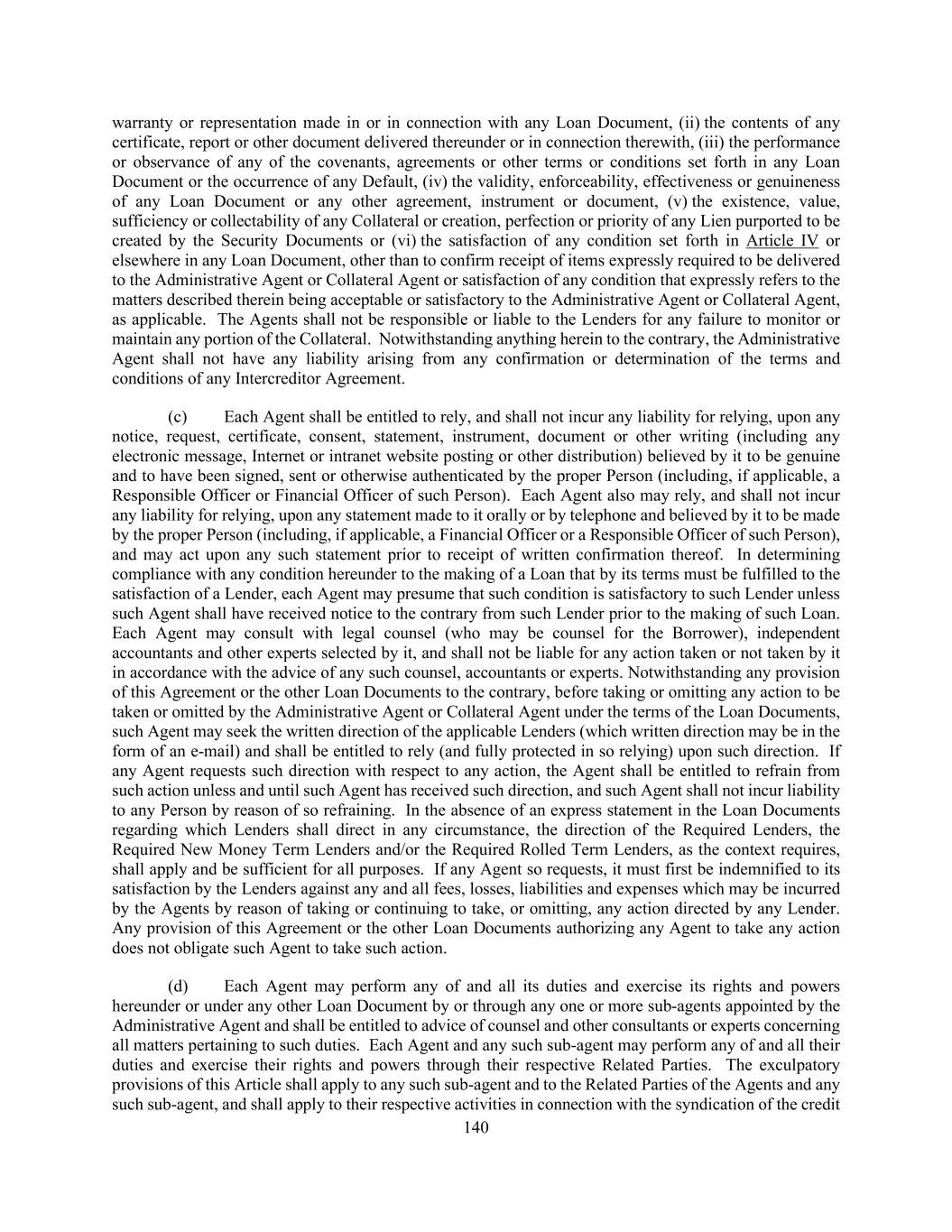 140 warranty or representation made in or in connection with any Loan Document, (ii) the contents of any certificate, report or other document delivered thereunder or in connection therewith, (iii) the performance or observance of any of the covenants, agreements or other terms or conditions set forth in any Loan Document or the occurrence of any Default, (iv) the validity, enforceability, effectiveness or genuineness of any Loan Document or any other agreement, instrument or document, (v) the existence, value, sufficiency or collectability of any Collateral or creation, perfection or priority of any Lien purported to be created by the Security Documents or (vi) the satisfaction of any condition set forth in Article IV or elsewhere in any Loan Document, other than to confirm receipt of items expressly required to be delivered to the Administrative Agent or Collateral Agent or satisfaction of any condition that expressly refers to the matters described therein being acceptable or satisfactory to the Administrative Agent or Collateral Agent, as applicable. The Agents shall not be responsible or liable to the Lenders for any failure to monitor or maintain any portion of the Collateral. Notwithstanding anything herein to the contrary, the Administrative Agent shall not have any liability arising from any confirmation or determination of the terms and conditions of any Intercreditor Agreement. (c) Each Agent shall be entitled to rely, and shall not incur any liability for relying, upon any notice, request, certificate, consent, statement, instrument, document or other writing (including any electronic message, Internet or intranet website posting or other distribution) believed by it to be genuine and to have been signed, sent or otherwise authenticated by the proper Person (including, if applicable, a Responsible Officer or Financial Officer of such Person). Each Agent also may rely, and shall not incur any liability for relying, upon any statement made to it orally or by telephone and believed by it to be made by the proper Person (including, if applicable, a Financial Officer or a Responsible Officer of such Person), and may act upon any such statement prior to receipt of written confirmation thereof. In determining compliance with any condition hereunder to the making of a Loan that by its terms must be fulfilled to the satisfaction of a Lender, each Agent may presume that such condition is satisfactory to such Lender unless such Agent shall have received notice to the contrary from such Lender prior to the making of such Loan. Each Agent may consult with legal counsel (who may be counsel for the Borrower), independent accountants and other experts selected by it, and shall not be liable for any action taken or not taken by it in accordance with the advice of any such counsel, accountants or experts. Notwithstanding any provision of this Agreement or the other Loan Documents to the contrary, before taking or omitting any action to be taken or omitted by the Administrative Agent or Collateral Agent under the terms of the Loan Documents, such Agent may seek the written direction of the applicable Lenders (which written direction may be in the form of an e-mail) and shall be entitled to rely (and fully protected in so relying) upon such direction. If any Agent requests such direction with respect to any action, the Agent shall be entitled to refrain from such action unless and until such Agent has received such direction, and such Agent shall not incur liability to any Person by reason of so refraining. In the absence of an express statement in the Loan Documents regarding which Lenders shall direct in any circumstance, the direction of the Required Lenders, the Required New Money Term Lenders and/or the Required Rolled Term Lenders, as the context requires, shall apply and be sufficient for all purposes. If any Agent so requests, it must first be indemnified to its satisfaction by the Lenders against any and all fees, losses, liabilities and expenses which may be incurred by the Agents by reason of taking or continuing to take, or omitting, any action directed by any Lender. Any provision of this Agreement or the other Loan Documents authorizing any Agent to take any action does not obligate such Agent to take such action. (d) Each Agent may perform any of and all its duties and exercise its rights and powers hereunder or under any other Loan Document by or through any one or more sub-agents appointed by the Administrative Agent and shall be entitled to advice of counsel and other consultants or experts concerning all matters pertaining to such duties. Each Agent and any such sub-agent may perform any of and all their duties and exercise their rights and powers through their respective Related Parties. The exculpatory provisions of this Article shall apply to any such sub-agent and to the Related Parties of the Agents and any such sub-agent, and shall apply to their respective activities in connection with the syndication of the credit