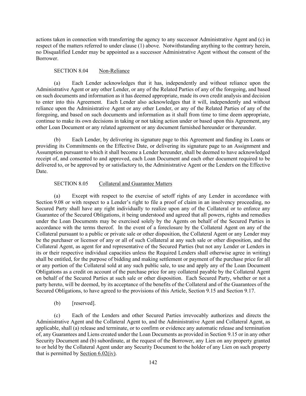 142 actions taken in connection with transferring the agency to any successor Administrative Agent and (c) in respect of the matters referred to under clause (1) above. Notwithstanding anything to the contrary herein, no Disqualified Lender may be appointed as a successor Administrative Agent without the consent of the Borrower. SECTION 8.04 Non-Reliance (a) Each Lender acknowledges that it has, independently and without reliance upon the Administrative Agent or any other Lender, or any of the Related Parties of any of the foregoing, and based on such documents and information as it has deemed appropriate, made its own credit analysis and decision to enter into this Agreement. Each Lender also acknowledges that it will, independently and without reliance upon the Administrative Agent or any other Lender, or any of the Related Parties of any of the foregoing, and based on such documents and information as it shall from time to time deem appropriate, continue to make its own decisions in taking or not taking action under or based upon this Agreement, any other Loan Document or any related agreement or any document furnished hereunder or thereunder. (b) Each Lender, by delivering its signature page to this Agreement and funding its Loans or providing its Commitments on the Effective Date, or delivering its signature page to an Assignment and Assumption pursuant to which it shall become a Lender hereunder, shall be deemed to have acknowledged receipt of, and consented to and approved, each Loan Document and each other document required to be delivered to, or be approved by or satisfactory to, the Administrative Agent or the Lenders on the Effective Date. SECTION 8.05 Collateral and Guarantee Matters (a) Except with respect to the exercise of setoff rights of any Lender in accordance with Section 9.08 or with respect to a Lender’s right to file a proof of claim in an insolvency proceeding, no Secured Party shall have any right individually to realize upon any of the Collateral or to enforce any Guarantee of the Secured Obligations, it being understood and agreed that all powers, rights and remedies under the Loan Documents may be exercised solely by the Agents on behalf of the Secured Parties in accordance with the terms thereof. In the event of a foreclosure by the Collateral Agent on any of the Collateral pursuant to a public or private sale or other disposition, the Collateral Agent or any Lender may be the purchaser or licensor of any or all of such Collateral at any such sale or other disposition, and the Collateral Agent, as agent for and representative of the Secured Parties (but not any Lender or Lenders in its or their respective individual capacities unless the Required Lenders shall otherwise agree in writing) shall be entitled, for the purpose of bidding and making settlement or payment of the purchase price for all or any portion of the Collateral sold at any such public sale, to use and apply any of the Loan Document Obligations as a credit on account of the purchase price for any collateral payable by the Collateral Agent on behalf of the Secured Parties at such sale or other disposition. Each Secured Party, whether or not a party hereto, will be deemed, by its acceptance of the benefits of the Collateral and of the Guarantees of the Secured Obligations, to have agreed to the provisions of this Article, Section 9.15 and Section 9.17. (b) [reserved]. (c) Each of the Lenders and other Secured Parties irrevocably authorizes and directs the Administrative Agent and the Collateral Agent to, and the Administrative Agent and Collateral Agent, as applicable, shall (a) release and terminate, or to confirm or evidence any automatic release and termination of, any Guarantees and Liens created under the Loan Documents as provided in Section 9.15 or in any other Security Document and (b) subordinate, at the request of the Borrower, any Lien on any property granted to or held by the Collateral Agent under any Security Document to the holder of any Lien on such property that is permitted by Section 6.02(iv).