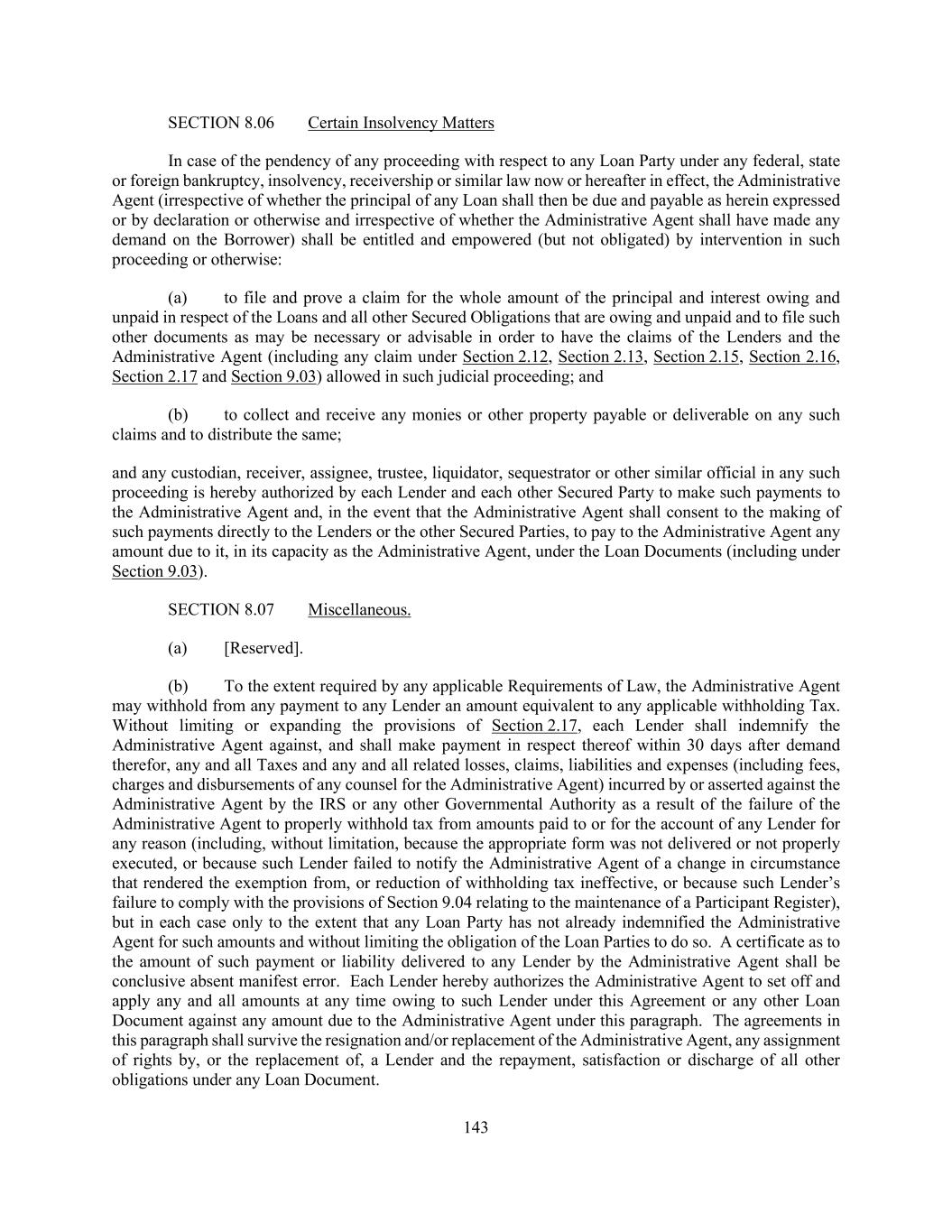 143 SECTION 8.06 Certain Insolvency Matters In case of the pendency of any proceeding with respect to any Loan Party under any federal, state or foreign bankruptcy, insolvency, receivership or similar law now or hereafter in effect, the Administrative Agent (irrespective of whether the principal of any Loan shall then be due and payable as herein expressed or by declaration or otherwise and irrespective of whether the Administrative Agent shall have made any demand on the Borrower) shall be entitled and empowered (but not obligated) by intervention in such proceeding or otherwise: (a) to file and prove a claim for the whole amount of the principal and interest owing and unpaid in respect of the Loans and all other Secured Obligations that are owing and unpaid and to file such other documents as may be necessary or advisable in order to have the claims of the Lenders and the Administrative Agent (including any claim under Section 2.12, Section 2.13, Section 2.15, Section 2.16, Section 2.17 and Section 9.03) allowed in such judicial proceeding; and (b) to collect and receive any monies or other property payable or deliverable on any such claims and to distribute the same; and any custodian, receiver, assignee, trustee, liquidator, sequestrator or other similar official in any such proceeding is hereby authorized by each Lender and each other Secured Party to make such payments to the Administrative Agent and, in the event that the Administrative Agent shall consent to the making of such payments directly to the Lenders or the other Secured Parties, to pay to the Administrative Agent any amount due to it, in its capacity as the Administrative Agent, under the Loan Documents (including under Section 9.03). SECTION 8.07 Miscellaneous. (a) [Reserved]. (b) To the extent required by any applicable Requirements of Law, the Administrative Agent may withhold from any payment to any Lender an amount equivalent to any applicable withholding Tax. Without limiting or expanding the provisions of Section 2.17, each Lender shall indemnify the Administrative Agent against, and shall make payment in respect thereof within 30 days after demand therefor, any and all Taxes and any and all related losses, claims, liabilities and expenses (including fees, charges and disbursements of any counsel for the Administrative Agent) incurred by or asserted against the Administrative Agent by the IRS or any other Governmental Authority as a result of the failure of the Administrative Agent to properly withhold tax from amounts paid to or for the account of any Lender for any reason (including, without limitation, because the appropriate form was not delivered or not properly executed, or because such Lender failed to notify the Administrative Agent of a change in circumstance that rendered the exemption from, or reduction of withholding tax ineffective, or because such Lender’s failure to comply with the provisions of Section 9.04 relating to the maintenance of a Participant Register), but in each case only to the extent that any Loan Party has not already indemnified the Administrative Agent for such amounts and without limiting the obligation of the Loan Parties to do so. A certificate as to the amount of such payment or liability delivered to any Lender by the Administrative Agent shall be conclusive absent manifest error. Each Lender hereby authorizes the Administrative Agent to set off and apply any and all amounts at any time owing to such Lender under this Agreement or any other Loan Document against any amount due to the Administrative Agent under this paragraph. The agreements in this paragraph shall survive the resignation and/or replacement of the Administrative Agent, any assignment of rights by, or the replacement of, a Lender and the repayment, satisfaction or discharge of all other obligations under any Loan Document.