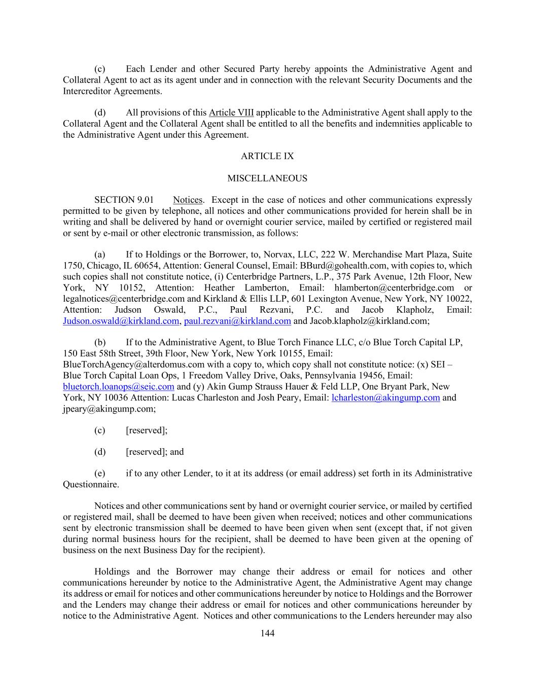 144 (c) Each Lender and other Secured Party hereby appoints the Administrative Agent and Collateral Agent to act as its agent under and in connection with the relevant Security Documents and the Intercreditor Agreements. (d) All provisions of this Article VIII applicable to the Administrative Agent shall apply to the Collateral Agent and the Collateral Agent shall be entitled to all the benefits and indemnities applicable to the Administrative Agent under this Agreement. ARTICLE IX MISCELLANEOUS SECTION 9.01 Notices. Except in the case of notices and other communications expressly permitted to be given by telephone, all notices and other communications provided for herein shall be in writing and shall be delivered by hand or overnight courier service, mailed by certified or registered mail or sent by e-mail or other electronic transmission, as follows: (a) If to Holdings or the Borrower, to, Norvax, LLC, 222 W. Merchandise Mart Plaza, Suite 1750, Chicago, IL 60654, Attention: General Counsel, Email: BBurd@gohealth.com, with copies to, which such copies shall not constitute notice, (i) Centerbridge Partners, L.P., 375 Park Avenue, 12th Floor, New York, NY 10152, Attention: Heather Lamberton, Email: hlamberton@centerbridge.com or legalnotices@centerbridge.com and Kirkland & Ellis LLP, 601 Lexington Avenue, New York, NY 10022, Attention: Judson Oswald, P.C., Paul Rezvani, P.C. and Jacob Klapholz, Email: Judson.oswald@kirkland.com, paul.rezvani@kirkland.com and Jacob.klapholz@kirkland.com; (b) If to the Administrative Agent, to Blue Torch Finance LLC, c/o Blue Torch Capital LP, 150 East 58th Street, 39th Floor, New York, New York 10155, Email: BlueTorchAgency@alterdomus.com with a copy to, which copy shall not constitute notice: (x) SEI – Blue Torch Capital Loan Ops, 1 Freedom Valley Drive, Oaks, Pennsylvania 19456, Email: bluetorch.loanops@seic.com and (y) Akin Gump Strauss Hauer & Feld LLP, One Bryant Park, New York, NY 10036 Attention: Lucas Charleston and Josh Peary, Email: lcharleston@akingump.com and jpeary@akingump.com; (c) [reserved]; (d) [reserved]; and (e) if to any other Lender, to it at its address (or email address) set forth in its Administrative Questionnaire. Notices and other communications sent by hand or overnight courier service, or mailed by certified or registered mail, shall be deemed to have been given when received; notices and other communications sent by electronic transmission shall be deemed to have been given when sent (except that, if not given during normal business hours for the recipient, shall be deemed to have been given at the opening of business on the next Business Day for the recipient). Holdings and the Borrower may change their address or email for notices and other communications hereunder by notice to the Administrative Agent, the Administrative Agent may change its address or email for notices and other communications hereunder by notice to Holdings and the Borrower and the Lenders may change their address or email for notices and other communications hereunder by notice to the Administrative Agent. Notices and other communications to the Lenders hereunder may also