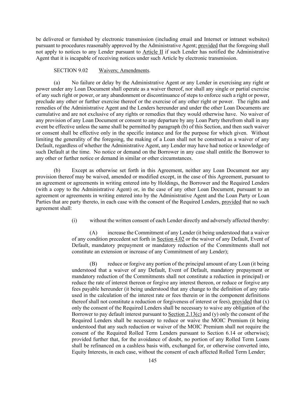 145 be delivered or furnished by electronic transmission (including email and Internet or intranet websites) pursuant to procedures reasonably approved by the Administrative Agent; provided that the foregoing shall not apply to notices to any Lender pursuant to Article II if such Lender has notified the Administrative Agent that it is incapable of receiving notices under such Article by electronic transmission. SECTION 9.02 Waivers; Amendments. (a) No failure or delay by the Administrative Agent or any Lender in exercising any right or power under any Loan Document shall operate as a waiver thereof, nor shall any single or partial exercise of any such right or power, or any abandonment or discontinuance of steps to enforce such a right or power, preclude any other or further exercise thereof or the exercise of any other right or power. The rights and remedies of the Administrative Agent and the Lenders hereunder and under the other Loan Documents are cumulative and are not exclusive of any rights or remedies that they would otherwise have. No waiver of any provision of any Loan Document or consent to any departure by any Loan Party therefrom shall in any event be effective unless the same shall be permitted by paragraph (b) of this Section, and then such waiver or consent shall be effective only in the specific instance and for the purpose for which given. Without limiting the generality of the foregoing, the making of a Loan shall not be construed as a waiver of any Default, regardless of whether the Administrative Agent, any Lender may have had notice or knowledge of such Default at the time. No notice or demand on the Borrower in any case shall entitle the Borrower to any other or further notice or demand in similar or other circumstances. (b) Except as otherwise set forth in this Agreement, neither any Loan Document nor any provision thereof may be waived, amended or modified except, in the case of this Agreement, pursuant to an agreement or agreements in writing entered into by Holdings, the Borrower and the Required Lenders (with a copy to the Administrative Agent) or, in the case of any other Loan Document, pursuant to an agreement or agreements in writing entered into by the Administrative Agent and the Loan Party or Loan Parties that are party thereto, in each case with the consent of the Required Lenders, provided that no such agreement shall: (i) without the written consent of each Lender directly and adversely affected thereby: (A) increase the Commitment of any Lender (it being understood that a waiver of any condition precedent set forth in Section 4.02 or the waiver of any Default, Event of Default, mandatory prepayment or mandatory reduction of the Commitments shall not constitute an extension or increase of any Commitment of any Lender); (B) reduce or forgive any portion of the principal amount of any Loan (it being understood that a waiver of any Default, Event of Default, mandatory prepayment or mandatory reduction of the Commitments shall not constitute a reduction in principal) or reduce the rate of interest thereon or forgive any interest thereon, or reduce or forgive any fees payable hereunder (it being understood that any change to the definition of any ratio used in the calculation of the interest rate or fees therein or in the component definitions thereof shall not constitute a reduction or forgiveness of interest or fees), provided that (x) only the consent of the Required Lenders shall be necessary to waive any obligation of the Borrower to pay default interest pursuant to Section 2.13(c) and (y) only the consent of the Required Lenders shall be necessary to reduce or waive the MOIC Premium (it being understood that any such reduction or waiver of the MOIC Premium shall not require the consent of the Required Rolled Term Lenders pursuant to Section 6.14 or otherwise); provided further that, for the avoidance of doubt, no portion of any Rolled Term Loans shall be refinanced on a cashless basis with, exchanged for, or otherwise converted into, Equity Interests, in each case, without the consent of each affected Rolled Term Lender;