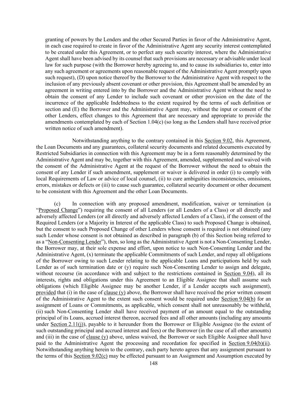 148 granting of powers by the Lenders and the other Secured Parties in favor of the Administrative Agent, in each case required to create in favor of the Administrative Agent any security interest contemplated to be created under this Agreement, or to perfect any such security interest, where the Administrative Agent shall have been advised by its counsel that such provisions are necessary or advisable under local law for such purpose (with the Borrower hereby agreeing to, and to cause its subsidiaries to, enter into any such agreement or agreements upon reasonable request of the Administrative Agent promptly upon such request), (D) upon notice thereof by the Borrower to the Administrative Agent with respect to the inclusion of any previously absent covenant or other provision, this Agreement shall be amended by an agreement in writing entered into by the Borrower and the Administrative Agent without the need to obtain the consent of any Lender to include such covenant or other provision on the date of the incurrence of the applicable Indebtedness to the extent required by the terms of such definition or section and (E) the Borrower and the Administrative Agent may, without the input or consent of the other Lenders, effect changes to this Agreement that are necessary and appropriate to provide the amendments contemplated by each of Section 1.04(c) (so long as the Lenders shall have received prior written notice of such amendment). Notwithstanding anything to the contrary contained in this Section 9.02, this Agreement, the Loan Documents and any guarantees, collateral security documents and related documents executed by Restricted Subsidiaries in connection with this Agreement may be in a form reasonably determined by the Administrative Agent and may be, together with this Agreement, amended, supplemented and waived with the consent of the Administrative Agent at the request of the Borrower without the need to obtain the consent of any Lender if such amendment, supplement or waiver is delivered in order (i) to comply with local Requirements of Law or advice of local counsel, (ii) to cure ambiguities inconsistencies, omissions, errors, mistakes or defects or (iii) to cause such guarantee, collateral security document or other document to be consistent with this Agreement and the other Loan Documents. (c) In connection with any proposed amendment, modification, waiver or termination (a “Proposed Change”) requiring the consent of all Lenders (or all Lenders of a Class) or all directly and adversely affected Lenders (or all directly and adversely affected Lenders of a Class), if the consent of the Required Lenders (or a Majority in Interest of the applicable Class) to such Proposed Change is obtained, but the consent to such Proposed Change of other Lenders whose consent is required is not obtained (any such Lender whose consent is not obtained as described in paragraph (b) of this Section being referred to as a “Non-Consenting Lender”), then, so long as the Administrative Agent is not a Non-Consenting Lender, the Borrower may, at their sole expense and effort, upon notice to such Non-Consenting Lender and the Administrative Agent, (x) terminate the applicable Commitments of such Lender, and repay all obligations of the Borrower owing to such Lender relating to the applicable Loans and participations held by such Lender as of such termination date or (y) require such Non-Consenting Lender to assign and delegate, without recourse (in accordance with and subject to the restrictions contained in Section 9.04), all its interests, rights and obligations under this Agreement to an Eligible Assignee that shall assume such obligations (which Eligible Assignee may be another Lender, if a Lender accepts such assignment), provided that (i) in the case of clause (y) above, the Borrower shall have received the prior written consent of the Administrative Agent to the extent such consent would be required under Section 9.04(b) for an assignment of Loans or Commitments, as applicable, which consent shall not unreasonably be withheld, (ii) such Non-Consenting Lender shall have received payment of an amount equal to the outstanding principal of its Loans, accrued interest thereon, accrued fees and all other amounts (including any amounts under Section 2.11(j)), payable to it hereunder from the Borrower or Eligible Assignee (to the extent of such outstanding principal and accrued interest and fees) or the Borrower (in the case of all other amounts) and (iii) in the case of clause (y) above, unless waived, the Borrower or such Eligible Assignee shall have paid to the Administrative Agent the processing and recordation fee specified in Section 9.04(b)(ii). Notwithstanding anything herein to the contrary, each party hereto agrees that any assignment pursuant to the terms of this Section 9.02(c) may be effected pursuant to an Assignment and Assumption executed by