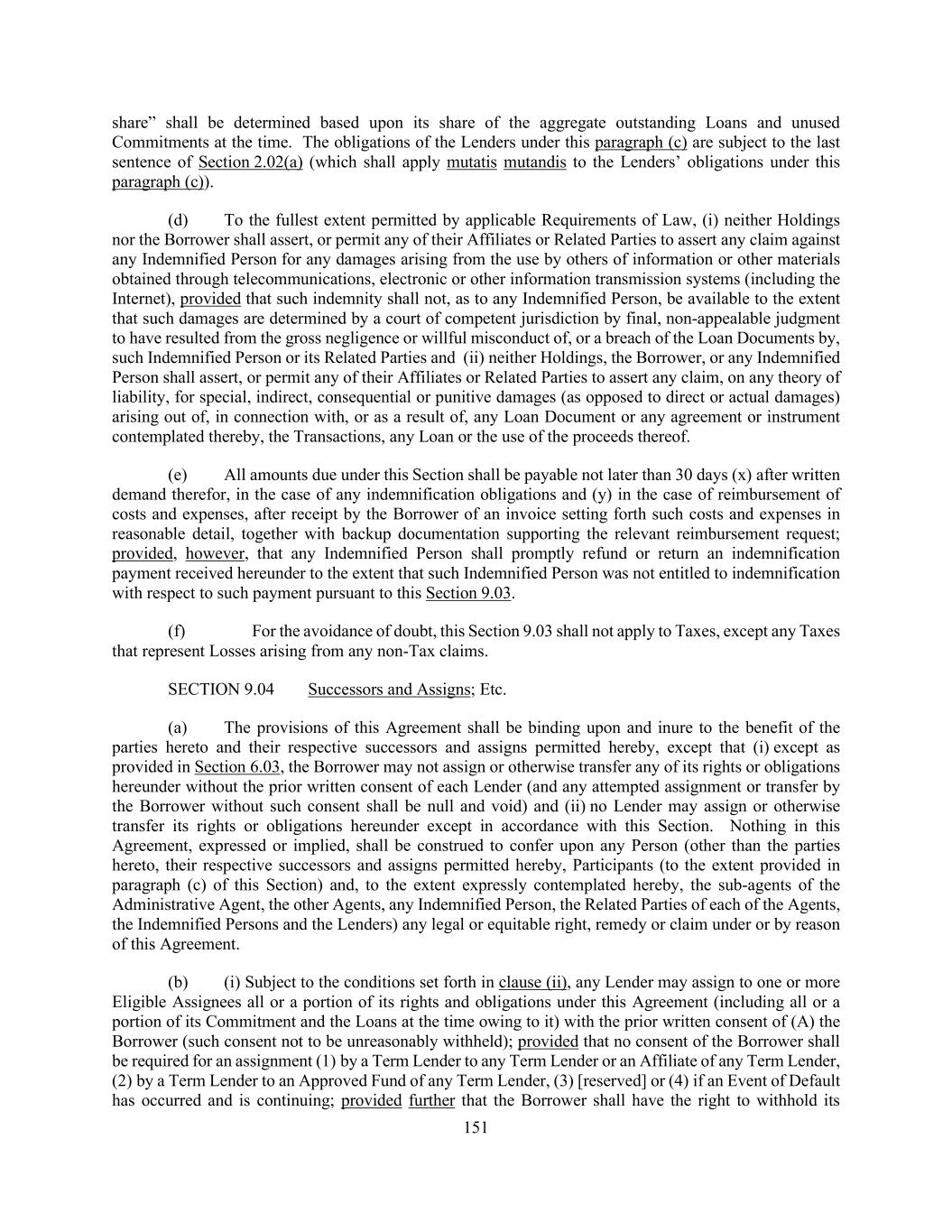 151 share” shall be determined based upon its share of the aggregate outstanding Loans and unused Commitments at the time. The obligations of the Lenders under this paragraph (c) are subject to the last sentence of Section 2.02(a) (which shall apply mutatis mutandis to the Lenders’ obligations under this paragraph (c)). (d) To the fullest extent permitted by applicable Requirements of Law, (i) neither Holdings nor the Borrower shall assert, or permit any of their Affiliates or Related Parties to assert any claim against any Indemnified Person for any damages arising from the use by others of information or other materials obtained through telecommunications, electronic or other information transmission systems (including the Internet), provided that such indemnity shall not, as to any Indemnified Person, be available to the extent that such damages are determined by a court of competent jurisdiction by final, non-appealable judgment to have resulted from the gross negligence or willful misconduct of, or a breach of the Loan Documents by, such Indemnified Person or its Related Parties and (ii) neither Holdings, the Borrower, or any Indemnified Person shall assert, or permit any of their Affiliates or Related Parties to assert any claim, on any theory of liability, for special, indirect, consequential or punitive damages (as opposed to direct or actual damages) arising out of, in connection with, or as a result of, any Loan Document or any agreement or instrument contemplated thereby, the Transactions, any Loan or the use of the proceeds thereof. (e) All amounts due under this Section shall be payable not later than 30 days (x) after written demand therefor, in the case of any indemnification obligations and (y) in the case of reimbursement of costs and expenses, after receipt by the Borrower of an invoice setting forth such costs and expenses in reasonable detail, together with backup documentation supporting the relevant reimbursement request; provided, however, that any Indemnified Person shall promptly refund or return an indemnification payment received hereunder to the extent that such Indemnified Person was not entitled to indemnification with respect to such payment pursuant to this Section 9.03. (f) For the avoidance of doubt, this Section 9.03 shall not apply to Taxes, except any Taxes that represent Losses arising from any non-Tax claims. SECTION 9.04 Successors and Assigns; Etc. (a) The provisions of this Agreement shall be binding upon and inure to the benefit of the parties hereto and their respective successors and assigns permitted hereby, except that (i) except as provided in Section 6.03, the Borrower may not assign or otherwise transfer any of its rights or obligations hereunder without the prior written consent of each Lender (and any attempted assignment or transfer by the Borrower without such consent shall be null and void) and (ii) no Lender may assign or otherwise transfer its rights or obligations hereunder except in accordance with this Section. Nothing in this Agreement, expressed or implied, shall be construed to confer upon any Person (other than the parties hereto, their respective successors and assigns permitted hereby, Participants (to the extent provided in paragraph (c) of this Section) and, to the extent expressly contemplated hereby, the sub-agents of the Administrative Agent, the other Agents, any Indemnified Person, the Related Parties of each of the Agents, the Indemnified Persons and the Lenders) any legal or equitable right, remedy or claim under or by reason of this Agreement. (b) (i) Subject to the conditions set forth in clause (ii), any Lender may assign to one or more Eligible Assignees all or a portion of its rights and obligations under this Agreement (including all or a portion of its Commitment and the Loans at the time owing to it) with the prior written consent of (A) the Borrower (such consent not to be unreasonably withheld); provided that no consent of the Borrower shall be required for an assignment (1) by a Term Lender to any Term Lender or an Affiliate of any Term Lender, (2) by a Term Lender to an Approved Fund of any Term Lender, (3) [reserved] or (4) if an Event of Default has occurred and is continuing; provided further that the Borrower shall have the right to withhold its