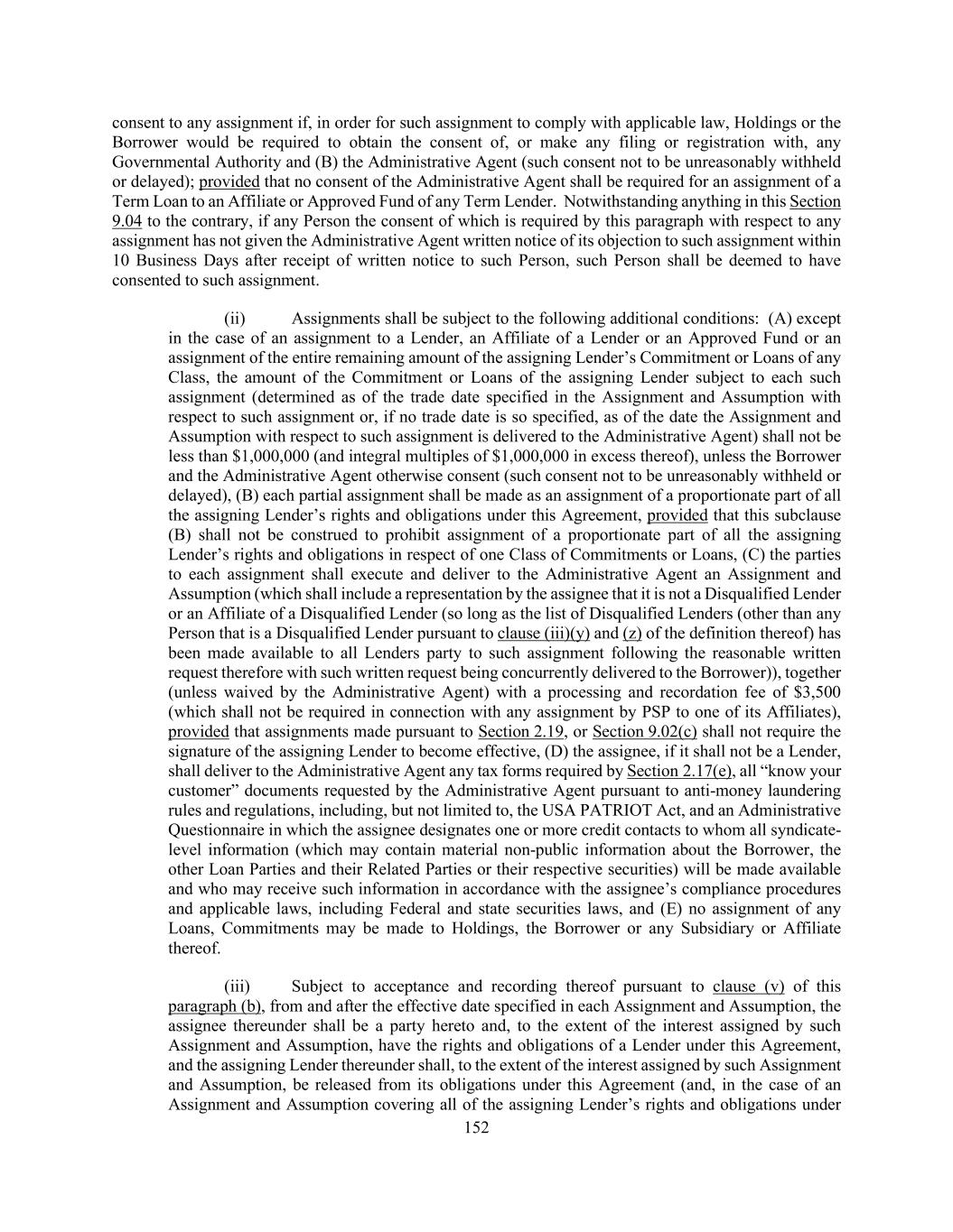 152 consent to any assignment if, in order for such assignment to comply with applicable law, Holdings or the Borrower would be required to obtain the consent of, or make any filing or registration with, any Governmental Authority and (B) the Administrative Agent (such consent not to be unreasonably withheld or delayed); provided that no consent of the Administrative Agent shall be required for an assignment of a Term Loan to an Affiliate or Approved Fund of any Term Lender. Notwithstanding anything in this Section 9.04 to the contrary, if any Person the consent of which is required by this paragraph with respect to any assignment has not given the Administrative Agent written notice of its objection to such assignment within 10 Business Days after receipt of written notice to such Person, such Person shall be deemed to have consented to such assignment. (ii) Assignments shall be subject to the following additional conditions: (A) except in the case of an assignment to a Lender, an Affiliate of a Lender or an Approved Fund or an assignment of the entire remaining amount of the assigning Lender’s Commitment or Loans of any Class, the amount of the Commitment or Loans of the assigning Lender subject to each such assignment (determined as of the trade date specified in the Assignment and Assumption with respect to such assignment or, if no trade date is so specified, as of the date the Assignment and Assumption with respect to such assignment is delivered to the Administrative Agent) shall not be less than $1,000,000 (and integral multiples of $1,000,000 in excess thereof), unless the Borrower and the Administrative Agent otherwise consent (such consent not to be unreasonably withheld or delayed), (B) each partial assignment shall be made as an assignment of a proportionate part of all the assigning Lender’s rights and obligations under this Agreement, provided that this subclause (B) shall not be construed to prohibit assignment of a proportionate part of all the assigning Lender’s rights and obligations in respect of one Class of Commitments or Loans, (C) the parties to each assignment shall execute and deliver to the Administrative Agent an Assignment and Assumption (which shall include a representation by the assignee that it is not a Disqualified Lender or an Affiliate of a Disqualified Lender (so long as the list of Disqualified Lenders (other than any Person that is a Disqualified Lender pursuant to clause (iii)(y) and (z) of the definition thereof) has been made available to all Lenders party to such assignment following the reasonable written request therefore with such written request being concurrently delivered to the Borrower)), together (unless waived by the Administrative Agent) with a processing and recordation fee of $3,500 (which shall not be required in connection with any assignment by PSP to one of its Affiliates), provided that assignments made pursuant to Section 2.19, or Section 9.02(c) shall not require the signature of the assigning Lender to become effective, (D) the assignee, if it shall not be a Lender, shall deliver to the Administrative Agent any tax forms required by Section 2.17(e), all “know your customer” documents requested by the Administrative Agent pursuant to anti-money laundering rules and regulations, including, but not limited to, the USA PATRIOT Act, and an Administrative Questionnaire in which the assignee designates one or more credit contacts to whom all syndicate- level information (which may contain material non-public information about the Borrower, the other Loan Parties and their Related Parties or their respective securities) will be made available and who may receive such information in accordance with the assignee’s compliance procedures and applicable laws, including Federal and state securities laws, and (E) no assignment of any Loans, Commitments may be made to Holdings, the Borrower or any Subsidiary or Affiliate thereof. (iii) Subject to acceptance and recording thereof pursuant to clause (v) of this paragraph (b), from and after the effective date specified in each Assignment and Assumption, the assignee thereunder shall be a party hereto and, to the extent of the interest assigned by such Assignment and Assumption, have the rights and obligations of a Lender under this Agreement, and the assigning Lender thereunder shall, to the extent of the interest assigned by such Assignment and Assumption, be released from its obligations under this Agreement (and, in the case of an Assignment and Assumption covering all of the assigning Lender’s rights and obligations under