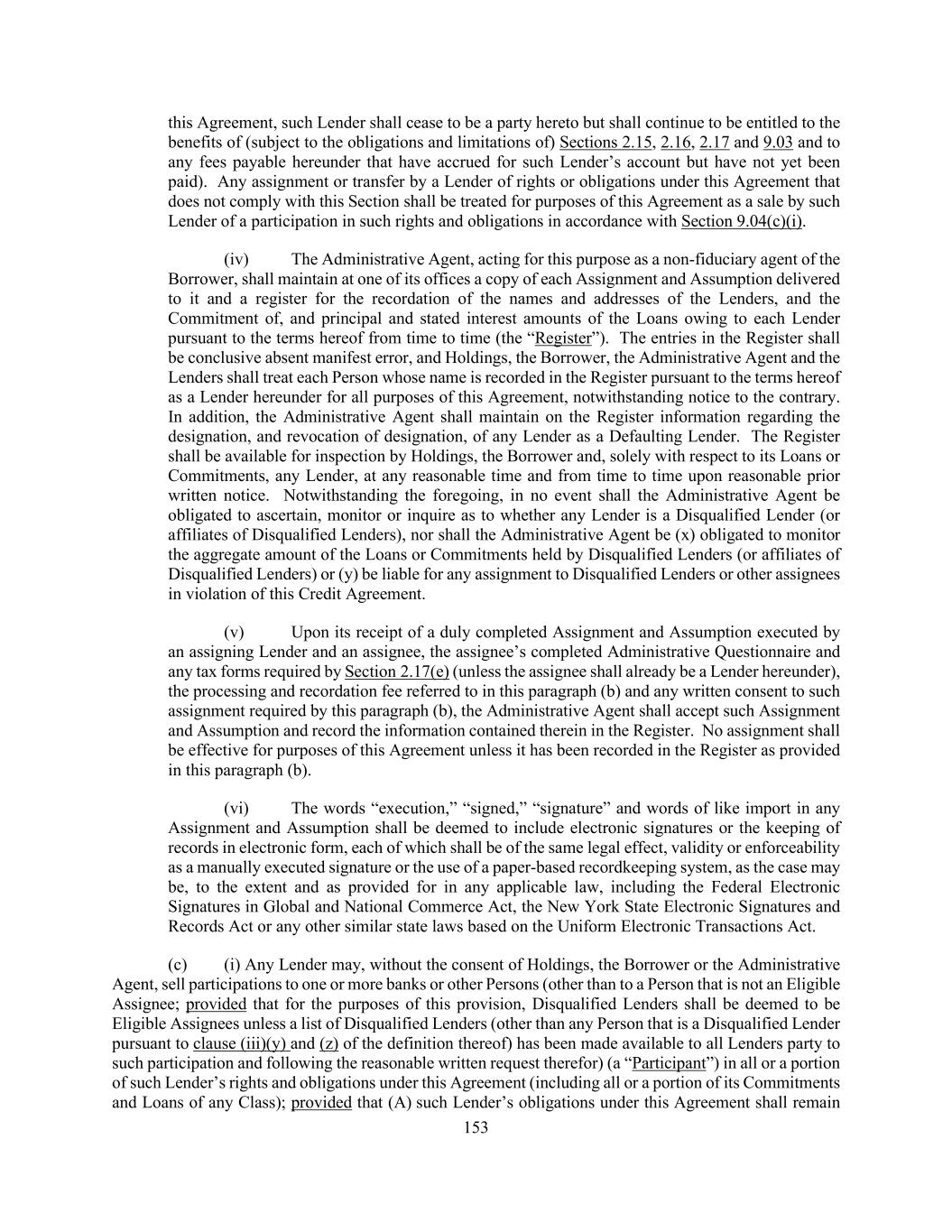 153 this Agreement, such Lender shall cease to be a party hereto but shall continue to be entitled to the benefits of (subject to the obligations and limitations of) Sections 2.15, 2.16, 2.17 and 9.03 and to any fees payable hereunder that have accrued for such Lender’s account but have not yet been paid). Any assignment or transfer by a Lender of rights or obligations under this Agreement that does not comply with this Section shall be treated for purposes of this Agreement as a sale by such Lender of a participation in such rights and obligations in accordance with Section 9.04(c)(i). (iv) The Administrative Agent, acting for this purpose as a non-fiduciary agent of the Borrower, shall maintain at one of its offices a copy of each Assignment and Assumption delivered to it and a register for the recordation of the names and addresses of the Lenders, and the Commitment of, and principal and stated interest amounts of the Loans owing to each Lender pursuant to the terms hereof from time to time (the “Register”). The entries in the Register shall be conclusive absent manifest error, and Holdings, the Borrower, the Administrative Agent and the Lenders shall treat each Person whose name is recorded in the Register pursuant to the terms hereof as a Lender hereunder for all purposes of this Agreement, notwithstanding notice to the contrary. In addition, the Administrative Agent shall maintain on the Register information regarding the designation, and revocation of designation, of any Lender as a Defaulting Lender. The Register shall be available for inspection by Holdings, the Borrower and, solely with respect to its Loans or Commitments, any Lender, at any reasonable time and from time to time upon reasonable prior written notice. Notwithstanding the foregoing, in no event shall the Administrative Agent be obligated to ascertain, monitor or inquire as to whether any Lender is a Disqualified Lender (or affiliates of Disqualified Lenders), nor shall the Administrative Agent be (x) obligated to monitor the aggregate amount of the Loans or Commitments held by Disqualified Lenders (or affiliates of Disqualified Lenders) or (y) be liable for any assignment to Disqualified Lenders or other assignees in violation of this Credit Agreement. (v) Upon its receipt of a duly completed Assignment and Assumption executed by an assigning Lender and an assignee, the assignee’s completed Administrative Questionnaire and any tax forms required by Section 2.17(e) (unless the assignee shall already be a Lender hereunder), the processing and recordation fee referred to in this paragraph (b) and any written consent to such assignment required by this paragraph (b), the Administrative Agent shall accept such Assignment and Assumption and record the information contained therein in the Register. No assignment shall be effective for purposes of this Agreement unless it has been recorded in the Register as provided in this paragraph (b). (vi) The words “execution,” “signed,” “signature” and words of like import in any Assignment and Assumption shall be deemed to include electronic signatures or the keeping of records in electronic form, each of which shall be of the same legal effect, validity or enforceability as a manually executed signature or the use of a paper-based recordkeeping system, as the case may be, to the extent and as provided for in any applicable law, including the Federal Electronic Signatures in Global and National Commerce Act, the New York State Electronic Signatures and Records Act or any other similar state laws based on the Uniform Electronic Transactions Act. (c) (i) Any Lender may, without the consent of Holdings, the Borrower or the Administrative Agent, sell participations to one or more banks or other Persons (other than to a Person that is not an Eligible Assignee; provided that for the purposes of this provision, Disqualified Lenders shall be deemed to be Eligible Assignees unless a list of Disqualified Lenders (other than any Person that is a Disqualified Lender pursuant to clause (iii)(y) and (z) of the definition thereof) has been made available to all Lenders party to such participation and following the reasonable written request therefor) (a “Participant”) in all or a portion of such Lender’s rights and obligations under this Agreement (including all or a portion of its Commitments and Loans of any Class); provided that (A) such Lender’s obligations under this Agreement shall remain