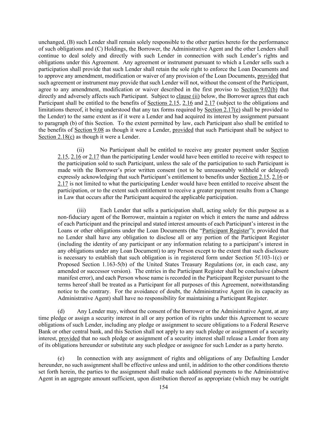 154 unchanged, (B) such Lender shall remain solely responsible to the other parties hereto for the performance of such obligations and (C) Holdings, the Borrower, the Administrative Agent and the other Lenders shall continue to deal solely and directly with such Lender in connection with such Lender’s rights and obligations under this Agreement. Any agreement or instrument pursuant to which a Lender sells such a participation shall provide that such Lender shall retain the sole right to enforce the Loan Documents and to approve any amendment, modification or waiver of any provision of the Loan Documents, provided that such agreement or instrument may provide that such Lender will not, without the consent of the Participant, agree to any amendment, modification or waiver described in the first proviso to Section 9.02(b) that directly and adversely affects such Participant. Subject to clause (ii) below, the Borrower agrees that each Participant shall be entitled to the benefits of Sections 2.15, 2.16 and 2.17 (subject to the obligations and limitations thereof, it being understood that any tax forms required by Section 2.17(e) shall be provided to the Lender) to the same extent as if it were a Lender and had acquired its interest by assignment pursuant to paragraph (b) of this Section. To the extent permitted by law, each Participant also shall be entitled to the benefits of Section 9.08 as though it were a Lender, provided that such Participant shall be subject to Section 2.18(c) as though it were a Lender. (ii) No Participant shall be entitled to receive any greater payment under Section 2.15, 2.16 or 2.17 than the participating Lender would have been entitled to receive with respect to the participation sold to such Participant, unless the sale of the participation to such Participant is made with the Borrower’s prior written consent (not to be unreasonably withheld or delayed) expressly acknowledging that such Participant’s entitlement to benefits under Section 2.15, 2.16 or 2.17 is not limited to what the participating Lender would have been entitled to receive absent the participation, or to the extent such entitlement to receive a greater payment results from a Change in Law that occurs after the Participant acquired the applicable participation. (iii) Each Lender that sells a participation shall, acting solely for this purpose as a non-fiduciary agent of the Borrower, maintain a register on which it enters the name and address of each Participant and the principal and stated interest amounts of each Participant’s interest in the Loans or other obligations under the Loan Documents (the “Participant Register”); provided that no Lender shall have any obligation to disclose all or any portion of the Participant Register (including the identity of any participant or any information relating to a participant’s interest in any obligations under any Loan Document) to any Person except to the extent that such disclosure is necessary to establish that such obligation is in registered form under Section 5f.103-1(c) or Proposed Section 1.163-5(b) of the United States Treasury Regulations (or, in each case, any amended or successor version). The entries in the Participant Register shall be conclusive (absent manifest error), and each Person whose name is recorded in the Participant Register pursuant to the terms hereof shall be treated as a Participant for all purposes of this Agreement, notwithstanding notice to the contrary. For the avoidance of doubt, the Administrative Agent (in its capacity as Administrative Agent) shall have no responsibility for maintaining a Participant Register. (d) Any Lender may, without the consent of the Borrower or the Administrative Agent, at any time pledge or assign a security interest in all or any portion of its rights under this Agreement to secure obligations of such Lender, including any pledge or assignment to secure obligations to a Federal Reserve Bank or other central bank, and this Section shall not apply to any such pledge or assignment of a security interest, provided that no such pledge or assignment of a security interest shall release a Lender from any of its obligations hereunder or substitute any such pledgee or assignee for such Lender as a party hereto. (e) In connection with any assignment of rights and obligations of any Defaulting Lender hereunder, no such assignment shall be effective unless and until, in addition to the other conditions thereto set forth herein, the parties to the assignment shall make such additional payments to the Administrative Agent in an aggregate amount sufficient, upon distribution thereof as appropriate (which may be outright
