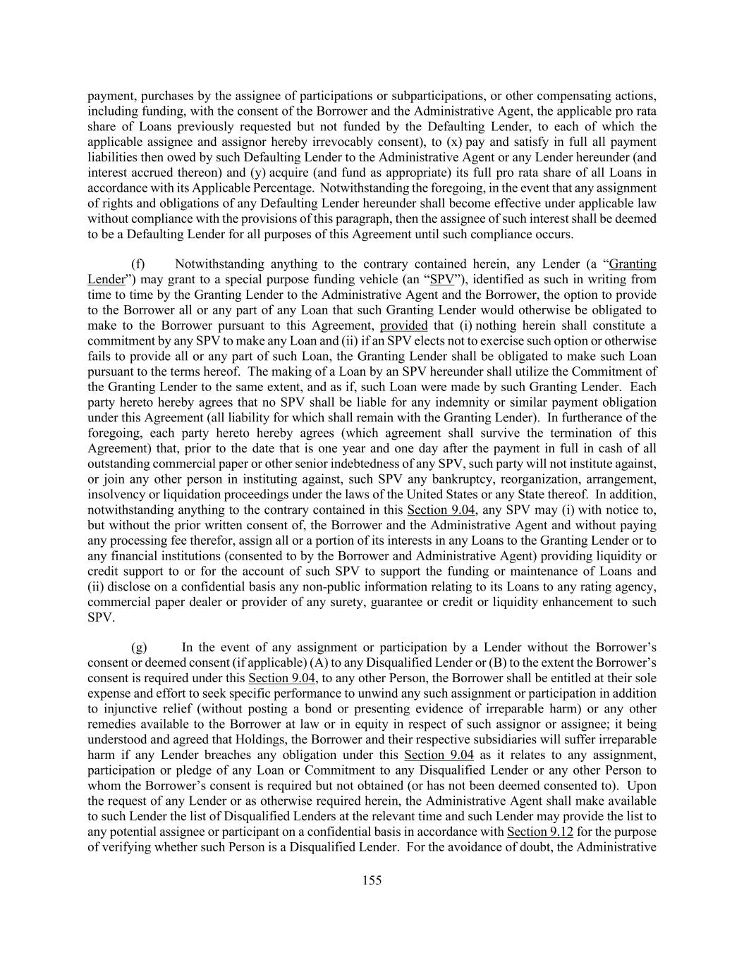 155 payment, purchases by the assignee of participations or subparticipations, or other compensating actions, including funding, with the consent of the Borrower and the Administrative Agent, the applicable pro rata share of Loans previously requested but not funded by the Defaulting Lender, to each of which the applicable assignee and assignor hereby irrevocably consent), to (x) pay and satisfy in full all payment liabilities then owed by such Defaulting Lender to the Administrative Agent or any Lender hereunder (and interest accrued thereon) and (y) acquire (and fund as appropriate) its full pro rata share of all Loans in accordance with its Applicable Percentage. Notwithstanding the foregoing, in the event that any assignment of rights and obligations of any Defaulting Lender hereunder shall become effective under applicable law without compliance with the provisions of this paragraph, then the assignee of such interest shall be deemed to be a Defaulting Lender for all purposes of this Agreement until such compliance occurs. (f) Notwithstanding anything to the contrary contained herein, any Lender (a “Granting Lender”) may grant to a special purpose funding vehicle (an “SPV”), identified as such in writing from time to time by the Granting Lender to the Administrative Agent and the Borrower, the option to provide to the Borrower all or any part of any Loan that such Granting Lender would otherwise be obligated to make to the Borrower pursuant to this Agreement, provided that (i) nothing herein shall constitute a commitment by any SPV to make any Loan and (ii) if an SPV elects not to exercise such option or otherwise fails to provide all or any part of such Loan, the Granting Lender shall be obligated to make such Loan pursuant to the terms hereof. The making of a Loan by an SPV hereunder shall utilize the Commitment of the Granting Lender to the same extent, and as if, such Loan were made by such Granting Lender. Each party hereto hereby agrees that no SPV shall be liable for any indemnity or similar payment obligation under this Agreement (all liability for which shall remain with the Granting Lender). In furtherance of the foregoing, each party hereto hereby agrees (which agreement shall survive the termination of this Agreement) that, prior to the date that is one year and one day after the payment in full in cash of all outstanding commercial paper or other senior indebtedness of any SPV, such party will not institute against, or join any other person in instituting against, such SPV any bankruptcy, reorganization, arrangement, insolvency or liquidation proceedings under the laws of the United States or any State thereof. In addition, notwithstanding anything to the contrary contained in this Section 9.04, any SPV may (i) with notice to, but without the prior written consent of, the Borrower and the Administrative Agent and without paying any processing fee therefor, assign all or a portion of its interests in any Loans to the Granting Lender or to any financial institutions (consented to by the Borrower and Administrative Agent) providing liquidity or credit support to or for the account of such SPV to support the funding or maintenance of Loans and (ii) disclose on a confidential basis any non-public information relating to its Loans to any rating agency, commercial paper dealer or provider of any surety, guarantee or credit or liquidity enhancement to such SPV. (g) In the event of any assignment or participation by a Lender without the Borrower’s consent or deemed consent (if applicable) (A) to any Disqualified Lender or (B) to the extent the Borrower’s consent is required under this Section 9.04, to any other Person, the Borrower shall be entitled at their sole expense and effort to seek specific performance to unwind any such assignment or participation in addition to injunctive relief (without posting a bond or presenting evidence of irreparable harm) or any other remedies available to the Borrower at law or in equity in respect of such assignor or assignee; it being understood and agreed that Holdings, the Borrower and their respective subsidiaries will suffer irreparable harm if any Lender breaches any obligation under this Section 9.04 as it relates to any assignment, participation or pledge of any Loan or Commitment to any Disqualified Lender or any other Person to whom the Borrower’s consent is required but not obtained (or has not been deemed consented to). Upon the request of any Lender or as otherwise required herein, the Administrative Agent shall make available to such Lender the list of Disqualified Lenders at the relevant time and such Lender may provide the list to any potential assignee or participant on a confidential basis in accordance with Section 9.12 for the purpose of verifying whether such Person is a Disqualified Lender. For the avoidance of doubt, the Administrative