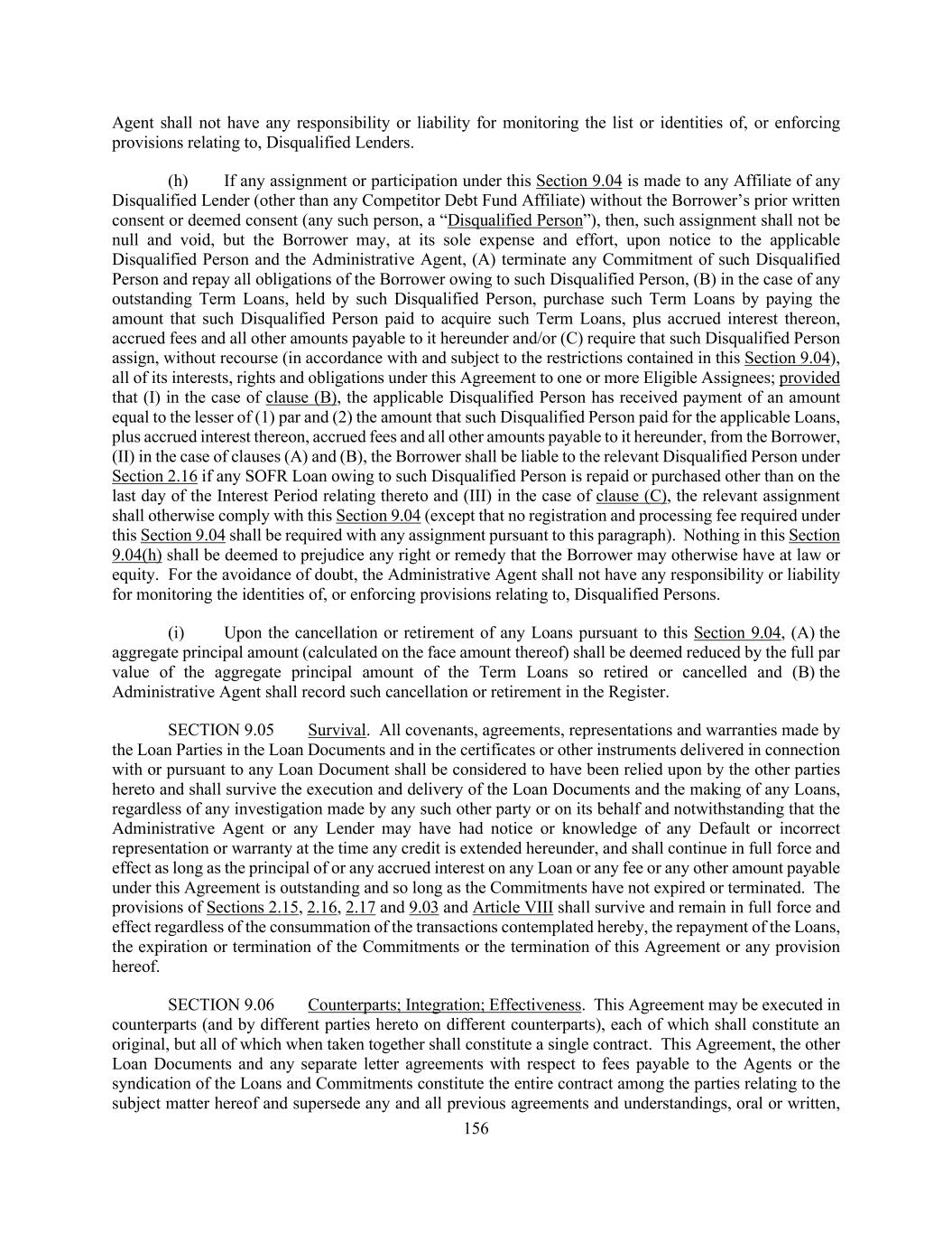 156 Agent shall not have any responsibility or liability for monitoring the list or identities of, or enforcing provisions relating to, Disqualified Lenders. (h) If any assignment or participation under this Section 9.04 is made to any Affiliate of any Disqualified Lender (other than any Competitor Debt Fund Affiliate) without the Borrower’s prior written consent or deemed consent (any such person, a “Disqualified Person”), then, such assignment shall not be null and void, but the Borrower may, at its sole expense and effort, upon notice to the applicable Disqualified Person and the Administrative Agent, (A) terminate any Commitment of such Disqualified Person and repay all obligations of the Borrower owing to such Disqualified Person, (B) in the case of any outstanding Term Loans, held by such Disqualified Person, purchase such Term Loans by paying the amount that such Disqualified Person paid to acquire such Term Loans, plus accrued interest thereon, accrued fees and all other amounts payable to it hereunder and/or (C) require that such Disqualified Person assign, without recourse (in accordance with and subject to the restrictions contained in this Section 9.04), all of its interests, rights and obligations under this Agreement to one or more Eligible Assignees; provided that (I) in the case of clause (B), the applicable Disqualified Person has received payment of an amount equal to the lesser of (1) par and (2) the amount that such Disqualified Person paid for the applicable Loans, plus accrued interest thereon, accrued fees and all other amounts payable to it hereunder, from the Borrower, (II) in the case of clauses (A) and (B), the Borrower shall be liable to the relevant Disqualified Person under Section 2.16 if any SOFR Loan owing to such Disqualified Person is repaid or purchased other than on the last day of the Interest Period relating thereto and (III) in the case of clause (C), the relevant assignment shall otherwise comply with this Section 9.04 (except that no registration and processing fee required under this Section 9.04 shall be required with any assignment pursuant to this paragraph). Nothing in this Section 9.04(h) shall be deemed to prejudice any right or remedy that the Borrower may otherwise have at law or equity. For the avoidance of doubt, the Administrative Agent shall not have any responsibility or liability for monitoring the identities of, or enforcing provisions relating to, Disqualified Persons. (i) Upon the cancellation or retirement of any Loans pursuant to this Section 9.04, (A) the aggregate principal amount (calculated on the face amount thereof) shall be deemed reduced by the full par value of the aggregate principal amount of the Term Loans so retired or cancelled and (B) the Administrative Agent shall record such cancellation or retirement in the Register. SECTION 9.05 Survival. All covenants, agreements, representations and warranties made by the Loan Parties in the Loan Documents and in the certificates or other instruments delivered in connection with or pursuant to any Loan Document shall be considered to have been relied upon by the other parties hereto and shall survive the execution and delivery of the Loan Documents and the making of any Loans, regardless of any investigation made by any such other party or on its behalf and notwithstanding that the Administrative Agent or any Lender may have had notice or knowledge of any Default or incorrect representation or warranty at the time any credit is extended hereunder, and shall continue in full force and effect as long as the principal of or any accrued interest on any Loan or any fee or any other amount payable under this Agreement is outstanding and so long as the Commitments have not expired or terminated. The provisions of Sections 2.15, 2.16, 2.17 and 9.03 and Article VIII shall survive and remain in full force and effect regardless of the consummation of the transactions contemplated hereby, the repayment of the Loans, the expiration or termination of the Commitments or the termination of this Agreement or any provision hereof. SECTION 9.06 Counterparts; Integration; Effectiveness. This Agreement may be executed in counterparts (and by different parties hereto on different counterparts), each of which shall constitute an original, but all of which when taken together shall constitute a single contract. This Agreement, the other Loan Documents and any separate letter agreements with respect to fees payable to the Agents or the syndication of the Loans and Commitments constitute the entire contract among the parties relating to the subject matter hereof and supersede any and all previous agreements and understandings, oral or written,