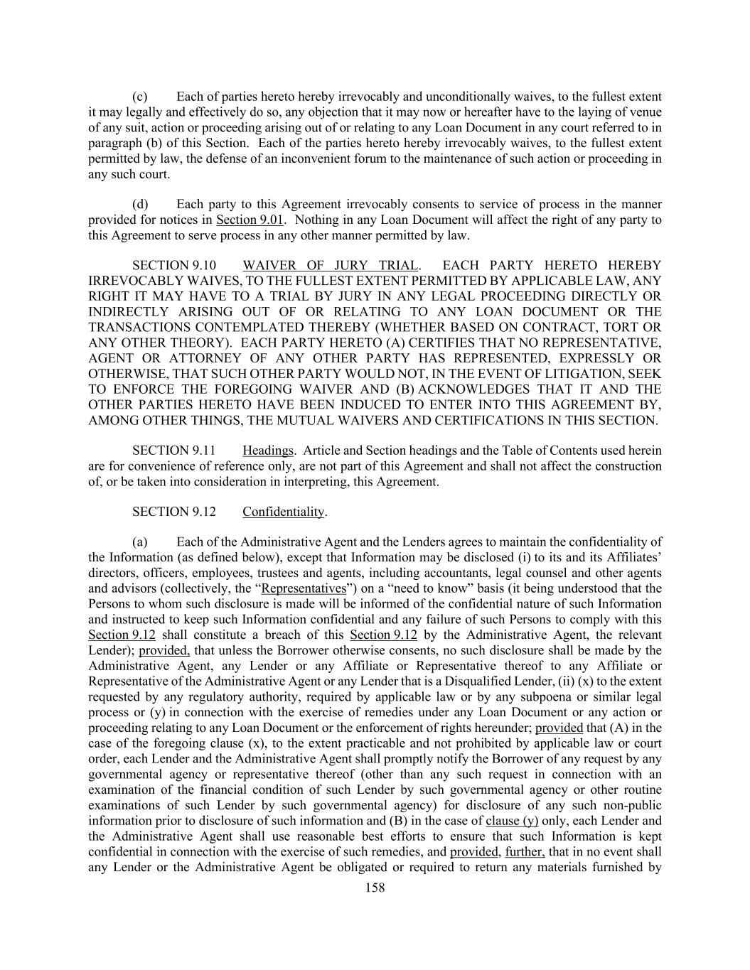 158 (c) Each of parties hereto hereby irrevocably and unconditionally waives, to the fullest extent it may legally and effectively do so, any objection that it may now or hereafter have to the laying of venue of any suit, action or proceeding arising out of or relating to any Loan Document in any court referred to in paragraph (b) of this Section. Each of the parties hereto hereby irrevocably waives, to the fullest extent permitted by law, the defense of an inconvenient forum to the maintenance of such action or proceeding in any such court. (d) Each party to this Agreement irrevocably consents to service of process in the manner provided for notices in Section 9.01. Nothing in any Loan Document will affect the right of any party to this Agreement to serve process in any other manner permitted by law. SECTION 9.10 WAIVER OF JURY TRIAL. EACH PARTY HERETO HEREBY IRREVOCABLY WAIVES, TO THE FULLEST EXTENT PERMITTED BY APPLICABLE LAW, ANY RIGHT IT MAY HAVE TO A TRIAL BY JURY IN ANY LEGAL PROCEEDING DIRECTLY OR INDIRECTLY ARISING OUT OF OR RELATING TO ANY LOAN DOCUMENT OR THE TRANSACTIONS CONTEMPLATED THEREBY (WHETHER BASED ON CONTRACT, TORT OR ANY OTHER THEORY). EACH PARTY HERETO (A) CERTIFIES THAT NO REPRESENTATIVE, AGENT OR ATTORNEY OF ANY OTHER PARTY HAS REPRESENTED, EXPRESSLY OR OTHERWISE, THAT SUCH OTHER PARTY WOULD NOT, IN THE EVENT OF LITIGATION, SEEK TO ENFORCE THE FOREGOING WAIVER AND (B) ACKNOWLEDGES THAT IT AND THE OTHER PARTIES HERETO HAVE BEEN INDUCED TO ENTER INTO THIS AGREEMENT BY, AMONG OTHER THINGS, THE MUTUAL WAIVERS AND CERTIFICATIONS IN THIS SECTION. SECTION 9.11 Headings. Article and Section headings and the Table of Contents used herein are for convenience of reference only, are not part of this Agreement and shall not affect the construction of, or be taken into consideration in interpreting, this Agreement. SECTION 9.12 Confidentiality. (a) Each of the Administrative Agent and the Lenders agrees to maintain the confidentiality of the Information (as defined below), except that Information may be disclosed (i) to its and its Affiliates’ directors, officers, employees, trustees and agents, including accountants, legal counsel and other agents and advisors (collectively, the “Representatives”) on a “need to know” basis (it being understood that the Persons to whom such disclosure is made will be informed of the confidential nature of such Information and instructed to keep such Information confidential and any failure of such Persons to comply with this Section 9.12 shall constitute a breach of this Section 9.12 by the Administrative Agent, the relevant Lender); provided, that unless the Borrower otherwise consents, no such disclosure shall be made by the Administrative Agent, any Lender or any Affiliate or Representative thereof to any Affiliate or Representative of the Administrative Agent or any Lender that is a Disqualified Lender, (ii) (x) to the extent requested by any regulatory authority, required by applicable law or by any subpoena or similar legal process or (y) in connection with the exercise of remedies under any Loan Document or any action or proceeding relating to any Loan Document or the enforcement of rights hereunder; provided that (A) in the case of the foregoing clause (x), to the extent practicable and not prohibited by applicable law or court order, each Lender and the Administrative Agent shall promptly notify the Borrower of any request by any governmental agency or representative thereof (other than any such request in connection with an examination of the financial condition of such Lender by such governmental agency or other routine examinations of such Lender by such governmental agency) for disclosure of any such non-public information prior to disclosure of such information and (B) in the case of clause (y) only, each Lender and the Administrative Agent shall use reasonable best efforts to ensure that such Information is kept confidential in connection with the exercise of such remedies, and provided, further, that in no event shall any Lender or the Administrative Agent be obligated or required to return any materials furnished by
