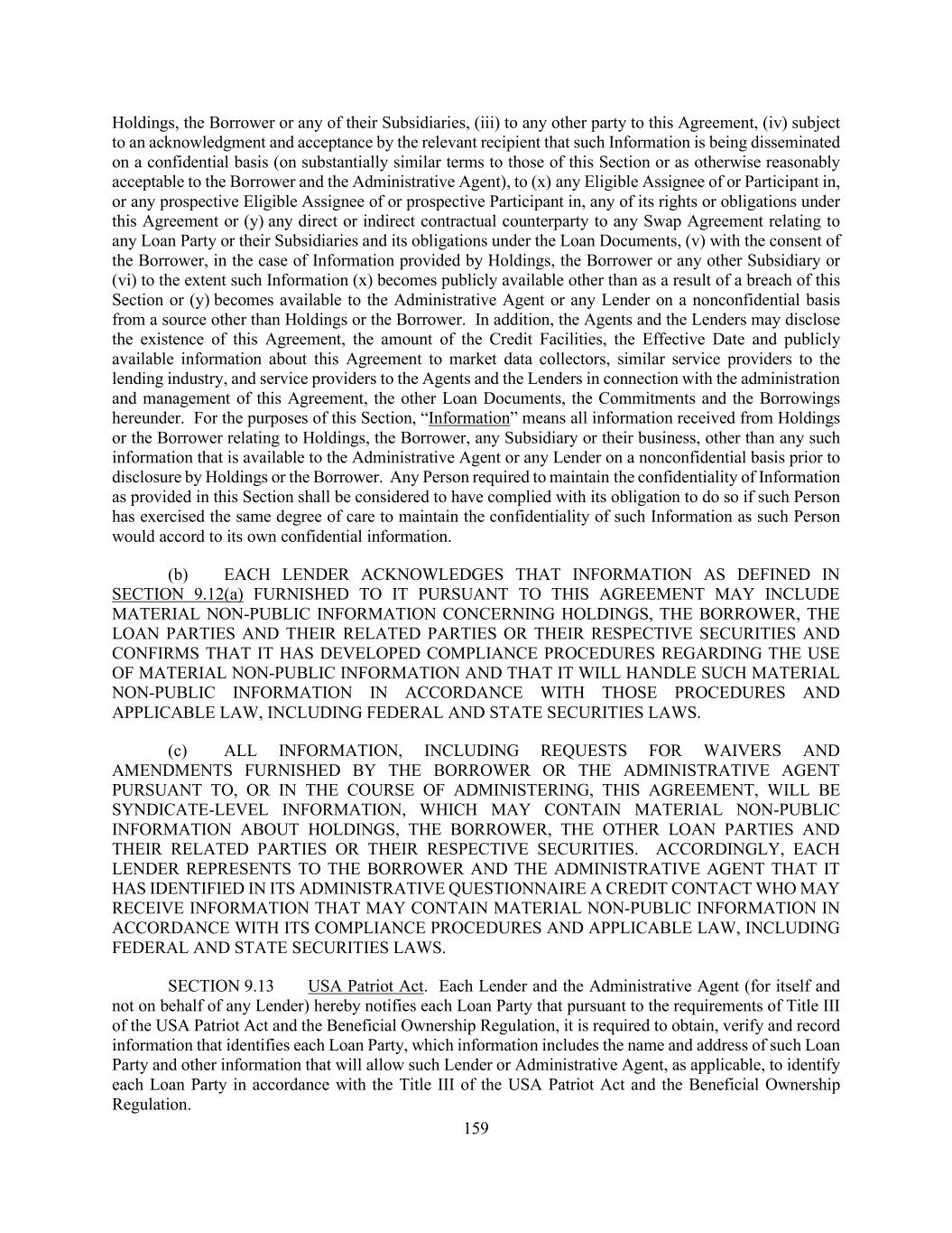 159 Holdings, the Borrower or any of their Subsidiaries, (iii) to any other party to this Agreement, (iv) subject to an acknowledgment and acceptance by the relevant recipient that such Information is being disseminated on a confidential basis (on substantially similar terms to those of this Section or as otherwise reasonably acceptable to the Borrower and the Administrative Agent), to (x) any Eligible Assignee of or Participant in, or any prospective Eligible Assignee of or prospective Participant in, any of its rights or obligations under this Agreement or (y) any direct or indirect contractual counterparty to any Swap Agreement relating to any Loan Party or their Subsidiaries and its obligations under the Loan Documents, (v) with the consent of the Borrower, in the case of Information provided by Holdings, the Borrower or any other Subsidiary or (vi) to the extent such Information (x) becomes publicly available other than as a result of a breach of this Section or (y) becomes available to the Administrative Agent or any Lender on a nonconfidential basis from a source other than Holdings or the Borrower. In addition, the Agents and the Lenders may disclose the existence of this Agreement, the amount of the Credit Facilities, the Effective Date and publicly available information about this Agreement to market data collectors, similar service providers to the lending industry, and service providers to the Agents and the Lenders in connection with the administration and management of this Agreement, the other Loan Documents, the Commitments and the Borrowings hereunder. For the purposes of this Section, “Information” means all information received from Holdings or the Borrower relating to Holdings, the Borrower, any Subsidiary or their business, other than any such information that is available to the Administrative Agent or any Lender on a nonconfidential basis prior to disclosure by Holdings or the Borrower. Any Person required to maintain the confidentiality of Information as provided in this Section shall be considered to have complied with its obligation to do so if such Person has exercised the same degree of care to maintain the confidentiality of such Information as such Person would accord to its own confidential information. (b) EACH LENDER ACKNOWLEDGES THAT INFORMATION AS DEFINED IN SECTION 9.12(a) FURNISHED TO IT PURSUANT TO THIS AGREEMENT MAY INCLUDE MATERIAL NON-PUBLIC INFORMATION CONCERNING HOLDINGS, THE BORROWER, THE LOAN PARTIES AND THEIR RELATED PARTIES OR THEIR RESPECTIVE SECURITIES AND CONFIRMS THAT IT HAS DEVELOPED COMPLIANCE PROCEDURES REGARDING THE USE OF MATERIAL NON-PUBLIC INFORMATION AND THAT IT WILL HANDLE SUCH MATERIAL NON-PUBLIC INFORMATION IN ACCORDANCE WITH THOSE PROCEDURES AND APPLICABLE LAW, INCLUDING FEDERAL AND STATE SECURITIES LAWS. (c) ALL INFORMATION, INCLUDING REQUESTS FOR WAIVERS AND AMENDMENTS FURNISHED BY THE BORROWER OR THE ADMINISTRATIVE AGENT PURSUANT TO, OR IN THE COURSE OF ADMINISTERING, THIS AGREEMENT, WILL BE SYNDICATE-LEVEL INFORMATION, WHICH MAY CONTAIN MATERIAL NON-PUBLIC INFORMATION ABOUT HOLDINGS, THE BORROWER, THE OTHER LOAN PARTIES AND THEIR RELATED PARTIES OR THEIR RESPECTIVE SECURITIES. ACCORDINGLY, EACH LENDER REPRESENTS TO THE BORROWER AND THE ADMINISTRATIVE AGENT THAT IT HAS IDENTIFIED IN ITS ADMINISTRATIVE QUESTIONNAIRE A CREDIT CONTACT WHO MAY RECEIVE INFORMATION THAT MAY CONTAIN MATERIAL NON-PUBLIC INFORMATION IN ACCORDANCE WITH ITS COMPLIANCE PROCEDURES AND APPLICABLE LAW, INCLUDING FEDERAL AND STATE SECURITIES LAWS. SECTION 9.13 USA Patriot Act. Each Lender and the Administrative Agent (for itself and not on behalf of any Lender) hereby notifies each Loan Party that pursuant to the requirements of Title III of the USA Patriot Act and the Beneficial Ownership Regulation, it is required to obtain, verify and record information that identifies each Loan Party, which information includes the name and address of such Loan Party and other information that will allow such Lender or Administrative Agent, as applicable, to identify each Loan Party in accordance with the Title III of the USA Patriot Act and the Beneficial Ownership Regulation.