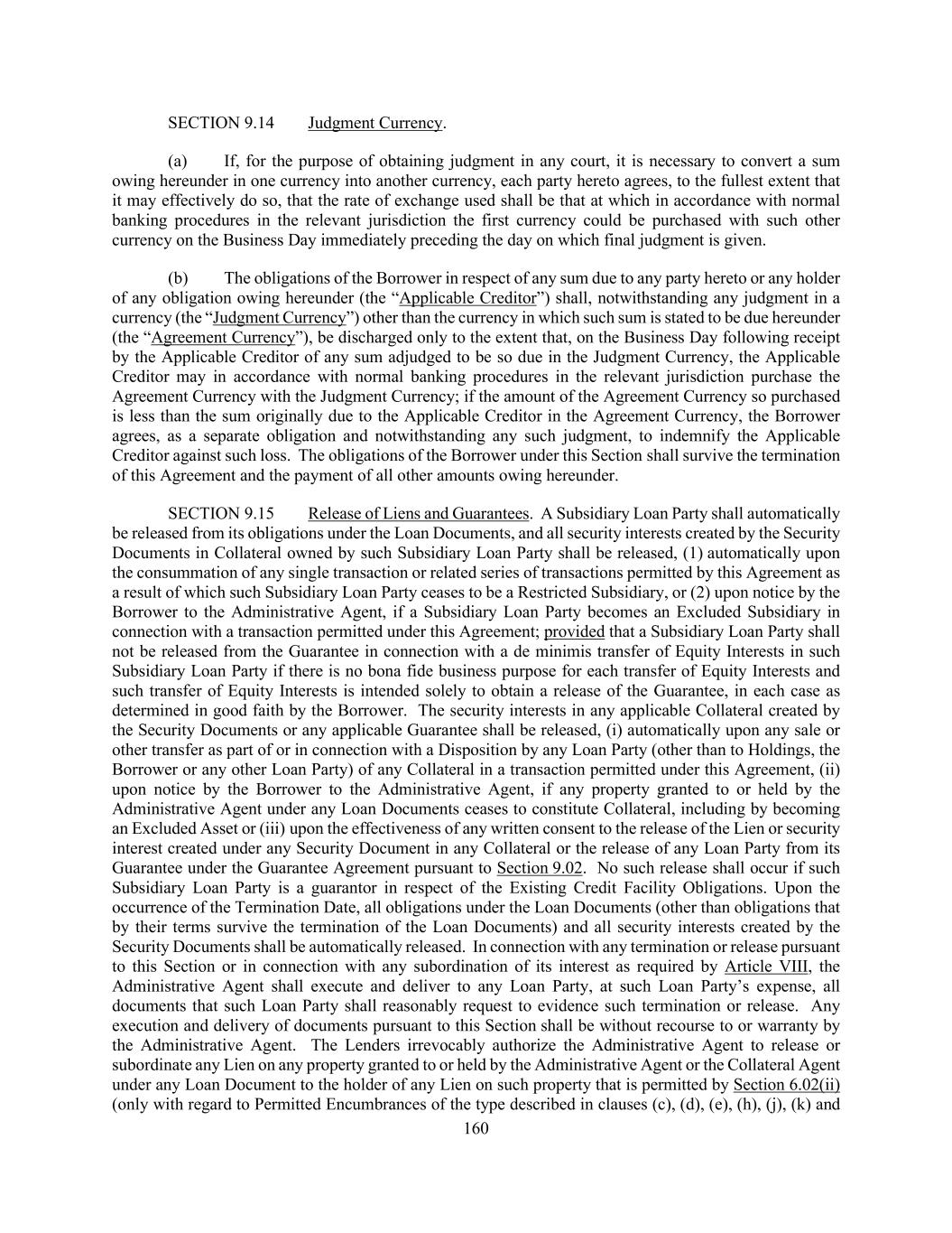 160 SECTION 9.14 Judgment Currency. (a) If, for the purpose of obtaining judgment in any court, it is necessary to convert a sum owing hereunder in one currency into another currency, each party hereto agrees, to the fullest extent that it may effectively do so, that the rate of exchange used shall be that at which in accordance with normal banking procedures in the relevant jurisdiction the first currency could be purchased with such other currency on the Business Day immediately preceding the day on which final judgment is given. (b) The obligations of the Borrower in respect of any sum due to any party hereto or any holder of any obligation owing hereunder (the “Applicable Creditor”) shall, notwithstanding any judgment in a currency (the “Judgment Currency”) other than the currency in which such sum is stated to be due hereunder (the “Agreement Currency”), be discharged only to the extent that, on the Business Day following receipt by the Applicable Creditor of any sum adjudged to be so due in the Judgment Currency, the Applicable Creditor may in accordance with normal banking procedures in the relevant jurisdiction purchase the Agreement Currency with the Judgment Currency; if the amount of the Agreement Currency so purchased is less than the sum originally due to the Applicable Creditor in the Agreement Currency, the Borrower agrees, as a separate obligation and notwithstanding any such judgment, to indemnify the Applicable Creditor against such loss. The obligations of the Borrower under this Section shall survive the termination of this Agreement and the payment of all other amounts owing hereunder. SECTION 9.15 Release of Liens and Guarantees. A Subsidiary Loan Party shall automatically be released from its obligations under the Loan Documents, and all security interests created by the Security Documents in Collateral owned by such Subsidiary Loan Party shall be released, (1) automatically upon the consummation of any single transaction or related series of transactions permitted by this Agreement as a result of which such Subsidiary Loan Party ceases to be a Restricted Subsidiary, or (2) upon notice by the Borrower to the Administrative Agent, if a Subsidiary Loan Party becomes an Excluded Subsidiary in connection with a transaction permitted under this Agreement; provided that a Subsidiary Loan Party shall not be released from the Guarantee in connection with a de minimis transfer of Equity Interests in such Subsidiary Loan Party if there is no bona fide business purpose for each transfer of Equity Interests and such transfer of Equity Interests is intended solely to obtain a release of the Guarantee, in each case as determined in good faith by the Borrower. The security interests in any applicable Collateral created by the Security Documents or any applicable Guarantee shall be released, (i) automatically upon any sale or other transfer as part of or in connection with a Disposition by any Loan Party (other than to Holdings, the Borrower or any other Loan Party) of any Collateral in a transaction permitted under this Agreement, (ii) upon notice by the Borrower to the Administrative Agent, if any property granted to or held by the Administrative Agent under any Loan Documents ceases to constitute Collateral, including by becoming an Excluded Asset or (iii) upon the effectiveness of any written consent to the release of the Lien or security interest created under any Security Document in any Collateral or the release of any Loan Party from its Guarantee under the Guarantee Agreement pursuant to Section 9.02. No such release shall occur if such Subsidiary Loan Party is a guarantor in respect of the Existing Credit Facility Obligations. Upon the occurrence of the Termination Date, all obligations under the Loan Documents (other than obligations that by their terms survive the termination of the Loan Documents) and all security interests created by the Security Documents shall be automatically released. In connection with any termination or release pursuant to this Section or in connection with any subordination of its interest as required by Article VIII, the Administrative Agent shall execute and deliver to any Loan Party, at such Loan Party’s expense, all documents that such Loan Party shall reasonably request to evidence such termination or release. Any execution and delivery of documents pursuant to this Section shall be without recourse to or warranty by the Administrative Agent. The Lenders irrevocably authorize the Administrative Agent to release or subordinate any Lien on any property granted to or held by the Administrative Agent or the Collateral Agent under any Loan Document to the holder of any Lien on such property that is permitted by Section 6.02(ii) (only with regard to Permitted Encumbrances of the type described in clauses (c), (d), (e), (h), (j), (k) and