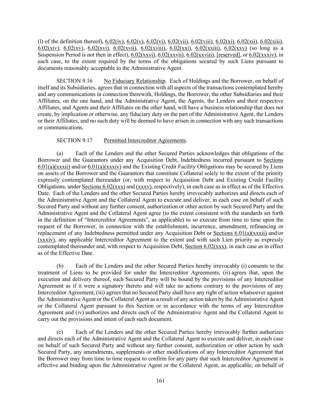 161 (l) of the definition thereof), 6.02(iv), 6.02(v), 6.02(vi), 6.02(vii), 6.02(viii), 6.02(xi), 6.02(xii), 6.02(xiii), 6.02(xiv), 6.02(xv), 6.02(xvi), 6.02(xvii), 6.02(xviii), 6.02(xxi), 6.02(xxiii), 6.02(xxv) (so long as a Suspension Period is not then in effect), 6.02(xxvi), 6.02(xxvii), 6.02(xxviii), [reserved], or 6.02(xxxiv), in each case, to the extent required by the terms of the obligations secured by such Liens pursuant to documents reasonably acceptable to the Administrative Agent. SECTION 9.16 No Fiduciary Relationship. Each of Holdings and the Borrower, on behalf of itself and its Subsidiaries, agrees that in connection with all aspects of the transactions contemplated hereby and any communications in connection therewith, Holdings, the Borrower, the other Subsidiaries and their Affiliates, on the one hand, and the Administrative Agent, the Agents, the Lenders and their respective Affiliates, and Agents and their Affiliates on the other hand, will have a business relationship that does not create, by implication or otherwise, any fiduciary duty on the part of the Administrative Agent, the Lenders or their Affiliates, and no such duty will be deemed to have arisen in connection with any such transactions or communications. SECTION 9.17 Permitted Intercreditor Agreements. (a) Each of the Lenders and the other Secured Parties acknowledges that obligations of the Borrower and the Guarantors under any Acquisition Debt, Indebtedness incurred pursuant to Sections 6.01(a)(xxxii) and/or 6.01(a)(xxxiv) and the Existing Credit Facility Obligations may be secured by Liens on assets of the Borrower and the Guarantors that constitute Collateral solely to the extent of the priority expressly contemplated thereunder (or, with respect to Acquisition Debt and Existing Credit Facility Obligations, under Sections 6.02(xxx) and (xxxv), respectively), in each case as in effect as of the Effective Date. Each of the Lenders and the other Secured Parties hereby irrevocably authorizes and directs each of the Administrative Agent and the Collateral Agent to execute and deliver, in each case on behalf of such Secured Party and without any further consent, authorization or other action by such Secured Party and the Administrative Agent and the Collateral Agent agree (to the extent consistent with the standards set forth in the definition of “Intercreditor Agreements”, as applicable) to so execute from time to time upon the request of the Borrower, in connection with the establishment, incurrence, amendment, refinancing or replacement of any Indebtedness permitted under any Acquisition Debt or Sections 6.01(a)(xxxii) and/or (xxxiv), any applicable Intercreditor Agreement to the extent and with such Lien priority as expressly contemplated thereunder and, with respect to Acquisition Debt, Section 6.02(xxx), in each case as in effect as of the Effective Date. (b) Each of the Lenders and the other Secured Parties hereby irrevocably (i) consents to the treatment of Liens to be provided for under the Intercreditor Agreements, (ii) agrees that, upon the execution and delivery thereof, such Secured Party will be bound by the provisions of any Intercreditor Agreement as if it were a signatory thereto and will take no actions contrary to the provisions of any Intercreditor Agreement, (iii) agrees that no Secured Party shall have any right of action whatsoever against the Administrative Agent or the Collateral Agent as a result of any action taken by the Administrative Agent or the Collateral Agent pursuant to this Section or in accordance with the terms of any Intercreditor Agreement and (iv) authorizes and directs each of the Administrative Agent and the Collateral Agent to carry out the provisions and intent of each such document. (c) Each of the Lenders and the other Secured Parties hereby irrevocably further authorizes and directs each of the Administrative Agent and the Collateral Agent to execute and deliver, in each case on behalf of such Secured Party and without any further consent, authorization or other action by such Secured Party, any amendments, supplements or other modifications of any Intercreditor Agreement that the Borrower may from time to time request to confirm for any party that such Intercreditor Agreement is effective and binding upon the Administrative Agent or the Collateral Agent, as applicable, on behalf of