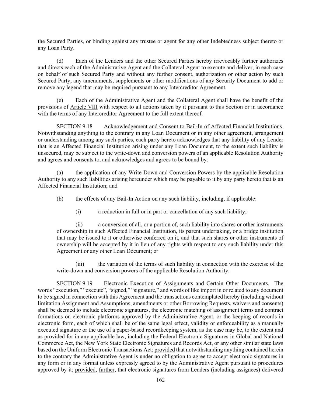 162 the Secured Parties, or binding against any trustee or agent for any other Indebtedness subject thereto or any Loan Party. (d) Each of the Lenders and the other Secured Parties hereby irrevocably further authorizes and directs each of the Administrative Agent and the Collateral Agent to execute and deliver, in each case on behalf of such Secured Party and without any further consent, authorization or other action by such Secured Party, any amendments, supplements or other modifications of any Security Document to add or remove any legend that may be required pursuant to any Intercreditor Agreement. (e) Each of the Administrative Agent and the Collateral Agent shall have the benefit of the provisions of Article VIII with respect to all actions taken by it pursuant to this Section or in accordance with the terms of any Intercreditor Agreement to the full extent thereof. SECTION 9.18 Acknowledgement and Consent to Bail-In of Affected Financial Institutions. Notwithstanding anything to the contrary in any Loan Document or in any other agreement, arrangement or understanding among any such parties, each party hereto acknowledges that any liability of any Lender that is an Affected Financial Institution arising under any Loan Document, to the extent such liability is unsecured, may be subject to the write-down and conversion powers of an applicable Resolution Authority and agrees and consents to, and acknowledges and agrees to be bound by: (a) the application of any Write-Down and Conversion Powers by the applicable Resolution Authority to any such liabilities arising hereunder which may be payable to it by any party hereto that is an Affected Financial Institution; and (b) the effects of any Bail-In Action on any such liability, including, if applicable: (i) a reduction in full or in part or cancellation of any such liability; (ii) a conversion of all, or a portion of, such liability into shares or other instruments of ownership in such Affected Financial Institution, its parent undertaking, or a bridge institution that may be issued to it or otherwise conferred on it, and that such shares or other instruments of ownership will be accepted by it in lieu of any rights with respect to any such liability under this Agreement or any other Loan Document; or (iii) the variation of the terms of such liability in connection with the exercise of the write-down and conversion powers of the applicable Resolution Authority. SECTION 9.19 Electronic Execution of Assignments and Certain Other Documents. The words “execution,” “execute”, “signed,” “signature,” and words of like import in or related to any document to be signed in connection with this Agreement and the transactions contemplated hereby (including without limitation Assignment and Assumptions, amendments or other Borrowing Requests, waivers and consents) shall be deemed to include electronic signatures, the electronic matching of assignment terms and contract formations on electronic platforms approved by the Administrative Agent, or the keeping of records in electronic form, each of which shall be of the same legal effect, validity or enforceability as a manually executed signature or the use of a paper-based recordkeeping system, as the case may be, to the extent and as provided for in any applicable law, including the Federal Electronic Signatures in Global and National Commerce Act, the New York State Electronic Signatures and Records Act, or any other similar state laws based on the Uniform Electronic Transactions Act; provided that notwithstanding anything contained herein to the contrary the Administrative Agent is under no obligation to agree to accept electronic signatures in any form or in any format unless expressly agreed to by the Administrative Agent pursuant to procedures approved by it; provided, further, that electronic signatures from Lenders (including assignees) delivered