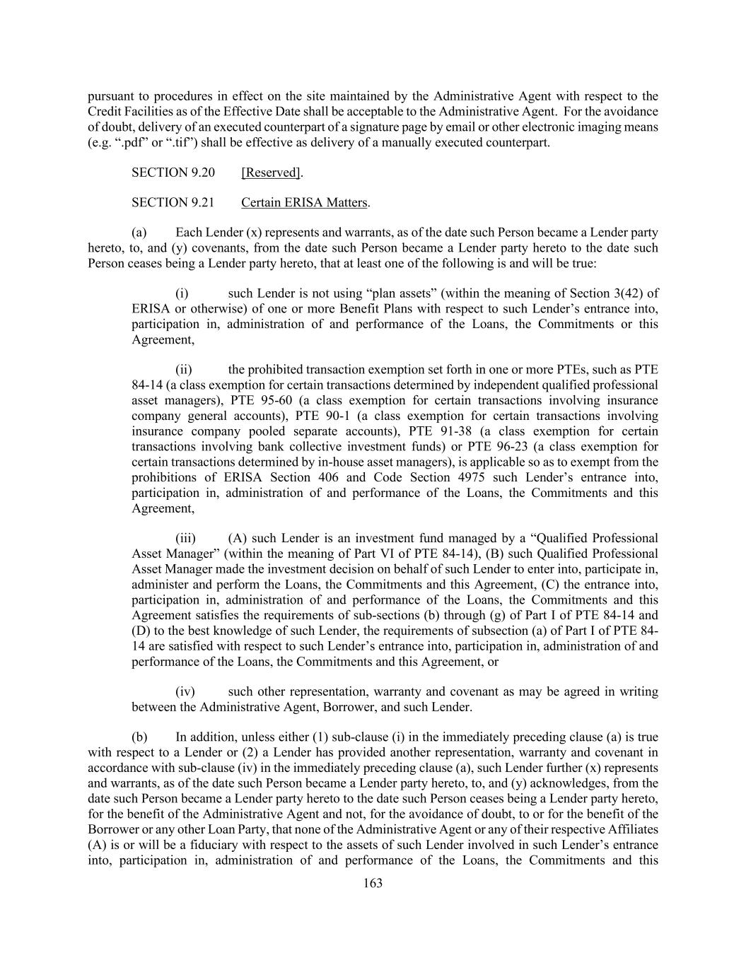 163 pursuant to procedures in effect on the site maintained by the Administrative Agent with respect to the Credit Facilities as of the Effective Date shall be acceptable to the Administrative Agent. For the avoidance of doubt, delivery of an executed counterpart of a signature page by email or other electronic imaging means (e.g. “.pdf” or “.tif”) shall be effective as delivery of a manually executed counterpart. SECTION 9.20 [Reserved]. SECTION 9.21 Certain ERISA Matters. (a) Each Lender (x) represents and warrants, as of the date such Person became a Lender party hereto, to, and (y) covenants, from the date such Person became a Lender party hereto to the date such Person ceases being a Lender party hereto, that at least one of the following is and will be true: (i) such Lender is not using “plan assets” (within the meaning of Section 3(42) of ERISA or otherwise) of one or more Benefit Plans with respect to such Lender’s entrance into, participation in, administration of and performance of the Loans, the Commitments or this Agreement, (ii) the prohibited transaction exemption set forth in one or more PTEs, such as PTE 84-14 (a class exemption for certain transactions determined by independent qualified professional asset managers), PTE 95-60 (a class exemption for certain transactions involving insurance company general accounts), PTE 90-1 (a class exemption for certain transactions involving insurance company pooled separate accounts), PTE 91-38 (a class exemption for certain transactions involving bank collective investment funds) or PTE 96-23 (a class exemption for certain transactions determined by in-house asset managers), is applicable so as to exempt from the prohibitions of ERISA Section 406 and Code Section 4975 such Lender’s entrance into, participation in, administration of and performance of the Loans, the Commitments and this Agreement, (iii) (A) such Lender is an investment fund managed by a “Qualified Professional Asset Manager” (within the meaning of Part VI of PTE 84-14), (B) such Qualified Professional Asset Manager made the investment decision on behalf of such Lender to enter into, participate in, administer and perform the Loans, the Commitments and this Agreement, (C) the entrance into, participation in, administration of and performance of the Loans, the Commitments and this Agreement satisfies the requirements of sub-sections (b) through (g) of Part I of PTE 84-14 and (D) to the best knowledge of such Lender, the requirements of subsection (a) of Part I of PTE 84- 14 are satisfied with respect to such Lender’s entrance into, participation in, administration of and performance of the Loans, the Commitments and this Agreement, or (iv) such other representation, warranty and covenant as may be agreed in writing between the Administrative Agent, Borrower, and such Lender. (b) In addition, unless either (1) sub-clause (i) in the immediately preceding clause (a) is true with respect to a Lender or (2) a Lender has provided another representation, warranty and covenant in accordance with sub-clause (iv) in the immediately preceding clause (a), such Lender further (x) represents and warrants, as of the date such Person became a Lender party hereto, to, and (y) acknowledges, from the date such Person became a Lender party hereto to the date such Person ceases being a Lender party hereto, for the benefit of the Administrative Agent and not, for the avoidance of doubt, to or for the benefit of the Borrower or any other Loan Party, that none of the Administrative Agent or any of their respective Affiliates (A) is or will be a fiduciary with respect to the assets of such Lender involved in such Lender’s entrance into, participation in, administration of and performance of the Loans, the Commitments and this