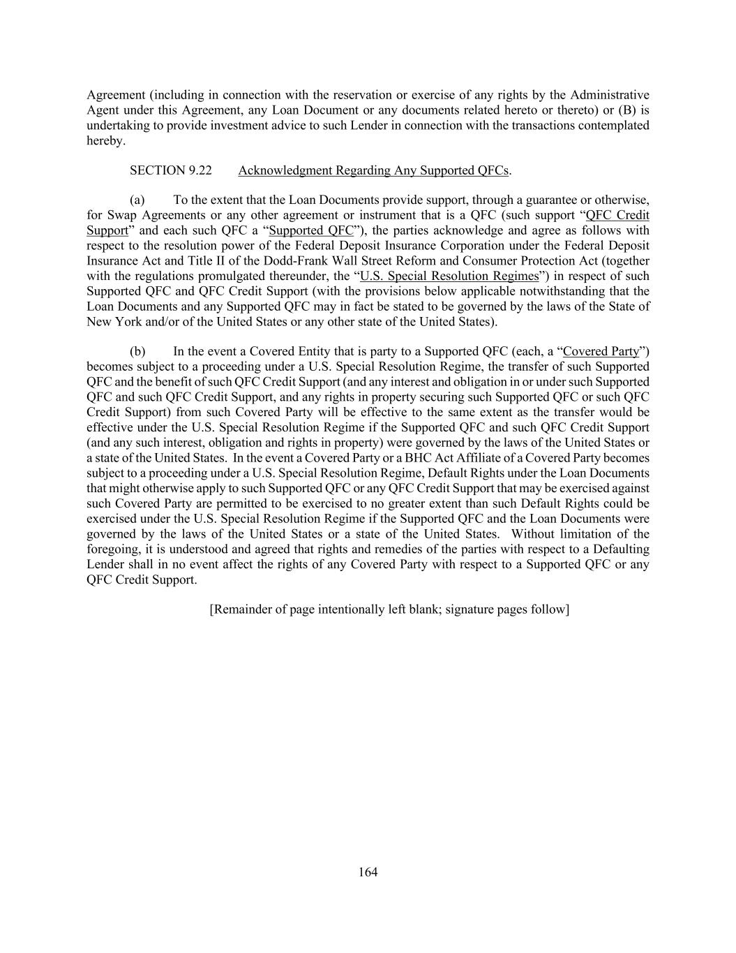 164 Agreement (including in connection with the reservation or exercise of any rights by the Administrative Agent under this Agreement, any Loan Document or any documents related hereto or thereto) or (B) is undertaking to provide investment advice to such Lender in connection with the transactions contemplated hereby. SECTION 9.22 Acknowledgment Regarding Any Supported QFCs. (a) To the extent that the Loan Documents provide support, through a guarantee or otherwise, for Swap Agreements or any other agreement or instrument that is a QFC (such support “QFC Credit Support” and each such QFC a “Supported QFC”), the parties acknowledge and agree as follows with respect to the resolution power of the Federal Deposit Insurance Corporation under the Federal Deposit Insurance Act and Title II of the Dodd-Frank Wall Street Reform and Consumer Protection Act (together with the regulations promulgated thereunder, the “U.S. Special Resolution Regimes”) in respect of such Supported QFC and QFC Credit Support (with the provisions below applicable notwithstanding that the Loan Documents and any Supported QFC may in fact be stated to be governed by the laws of the State of New York and/or of the United States or any other state of the United States). (b) In the event a Covered Entity that is party to a Supported QFC (each, a “Covered Party”) becomes subject to a proceeding under a U.S. Special Resolution Regime, the transfer of such Supported QFC and the benefit of such QFC Credit Support (and any interest and obligation in or under such Supported QFC and such QFC Credit Support, and any rights in property securing such Supported QFC or such QFC Credit Support) from such Covered Party will be effective to the same extent as the transfer would be effective under the U.S. Special Resolution Regime if the Supported QFC and such QFC Credit Support (and any such interest, obligation and rights in property) were governed by the laws of the United States or a state of the United States. In the event a Covered Party or a BHC Act Affiliate of a Covered Party becomes subject to a proceeding under a U.S. Special Resolution Regime, Default Rights under the Loan Documents that might otherwise apply to such Supported QFC or any QFC Credit Support that may be exercised against such Covered Party are permitted to be exercised to no greater extent than such Default Rights could be exercised under the U.S. Special Resolution Regime if the Supported QFC and the Loan Documents were governed by the laws of the United States or a state of the United States. Without limitation of the foregoing, it is understood and agreed that rights and remedies of the parties with respect to a Defaulting Lender shall in no event affect the rights of any Covered Party with respect to a Supported QFC or any QFC Credit Support. [Remainder of page intentionally left blank; signature pages follow]