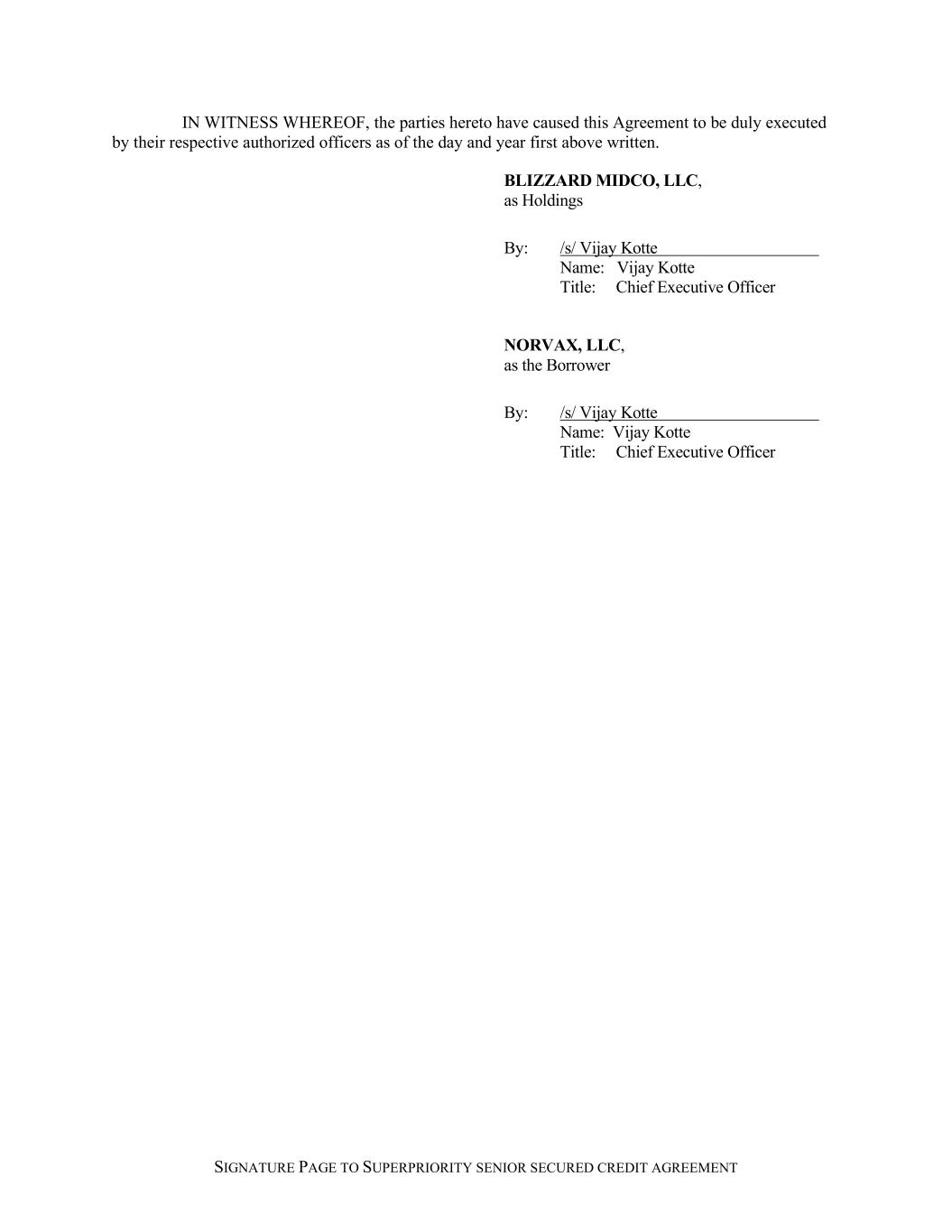 SIGNATURE PAGE TO SUPERPRIORITY SENIOR SECURED CREDIT AGREEMENT IN WITNESS WHEREOF, the parties hereto have caused this Agreement to be duly executed by their respective authorized officers as of the day and year first above written. BLIZZARD MIDCO, LLC, as Holdings By: /s/ Vijay Kotte Name: Vijay Kotte Title: Chief Executive Officer NORVAX, LLC, as the Borrower By: /s/ Vijay Kotte Name: Vijay Kotte Title: Chief Executive Officer