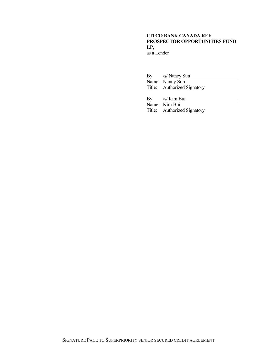 SIGNATURE PAGE TO SUPERPRIORITY SENIOR SECURED CREDIT AGREEMENT CITCO BANK CANADA REF PROSPECTOR OPPORTUNITIES FUND LP, as a Lender By: /s/ Nancy Sun Name: Nancy Sun Title: Authorized Signatory By: /s/ Kim Bui Name: Kim Bui Title: Authorized Signatory