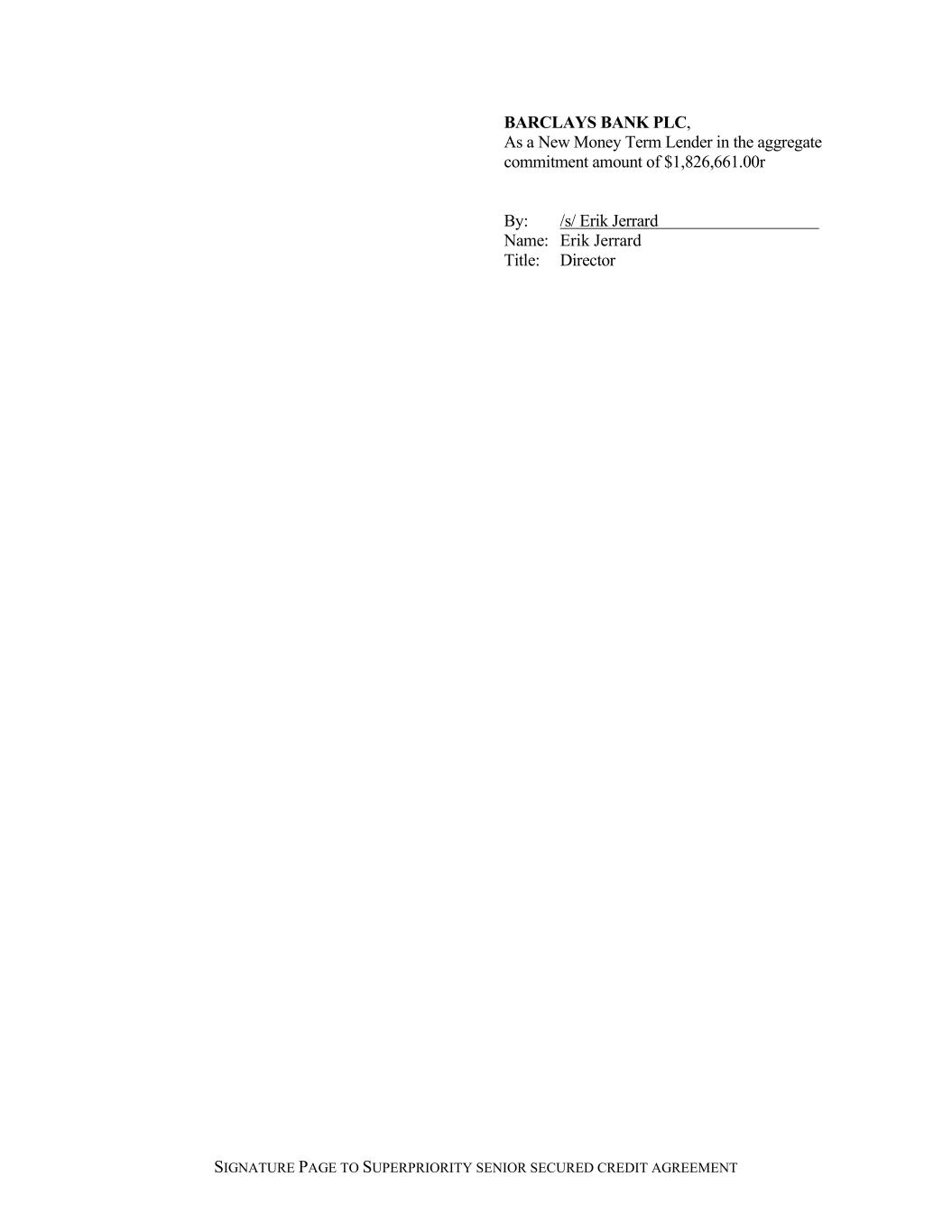 SIGNATURE PAGE TO SUPERPRIORITY SENIOR SECURED CREDIT AGREEMENT BARCLAYS BANK PLC, As a New Money Term Lender in the aggregate commitment amount of $1,826,661.00r By: /s/ Erik Jerrard Name: Erik Jerrard Title: Director