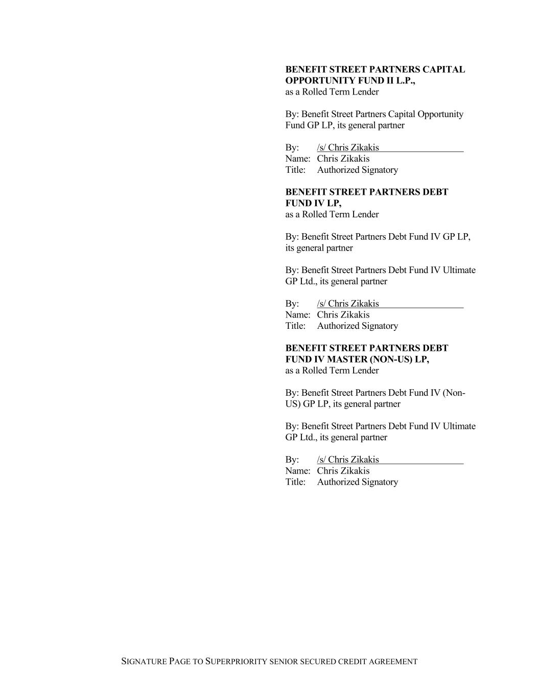 SIGNATURE PAGE TO SUPERPRIORITY SENIOR SECURED CREDIT AGREEMENT BENEFIT STREET PARTNERS CAPITAL OPPORTUNITY FUND II L.P., as a Rolled Term Lender By: Benefit Street Partners Capital Opportunity Fund GP LP, its general partner By: /s/ Chris Zikakis Name: Chris Zikakis Title: Authorized Signatory BENEFIT STREET PARTNERS DEBT FUND IV LP, as a Rolled Term Lender By: Benefit Street Partners Debt Fund IV GP LP, its general partner By: Benefit Street Partners Debt Fund IV Ultimate GP Ltd., its general partner By: /s/ Chris Zikakis Name: Chris Zikakis Title: Authorized Signatory BENEFIT STREET PARTNERS DEBT FUND IV MASTER (NON-US) LP, as a Rolled Term Lender By: Benefit Street Partners Debt Fund IV (Non- US) GP LP, its general partner By: Benefit Street Partners Debt Fund IV Ultimate GP Ltd., its general partner By: /s/ Chris Zikakis Name: Chris Zikakis Title: Authorized Signatory