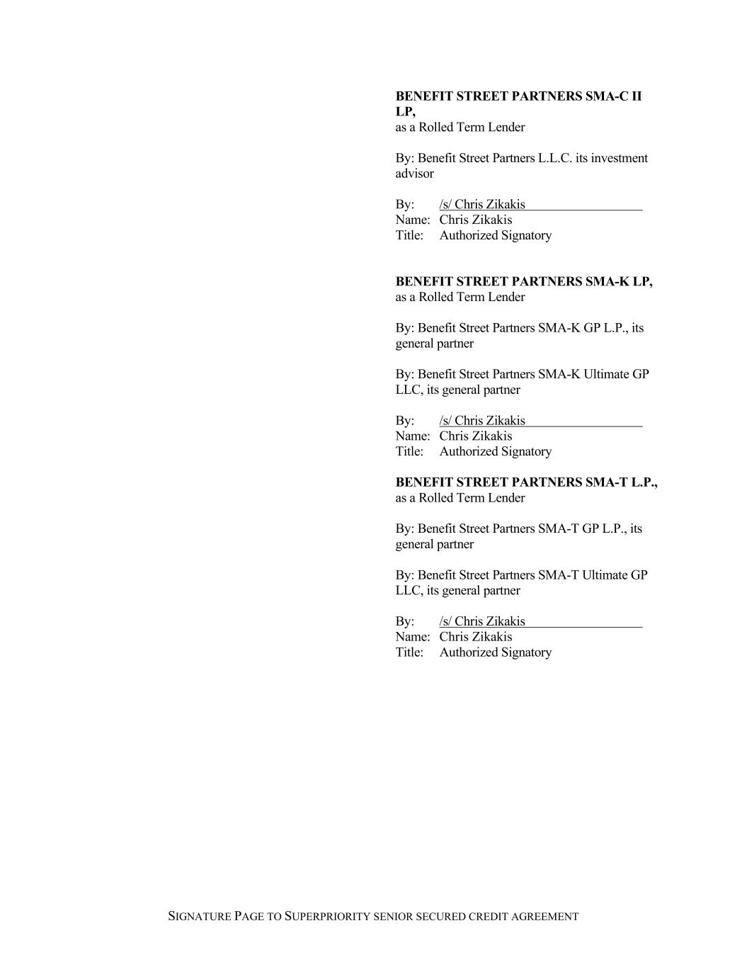 SIGNATURE PAGE TO SUPERPRIORITY SENIOR SECURED CREDIT AGREEMENT BENEFIT STREET PARTNERS SMA-C II LP, as a Rolled Term Lender By: Benefit Street Partners L.L.C. its investment advisor By: /s/ Chris Zikakis Name: Chris Zikakis Title: Authorized Signatory BENEFIT STREET PARTNERS SMA-K LP, as a Rolled Term Lender By: Benefit Street Partners SMA-K GP L.P., its general partner By: Benefit Street Partners SMA-K Ultimate GP LLC, its general partner By: /s/ Chris Zikakis Name: Chris Zikakis Title: Authorized Signatory BENEFIT STREET PARTNERS SMA-T L.P., as a Rolled Term Lender By: Benefit Street Partners SMA-T GP L.P., its general partner By: Benefit Street Partners SMA-T Ultimate GP LLC, its general partner By: /s/ Chris Zikakis Name: Chris Zikakis Title: Authorized Signatory