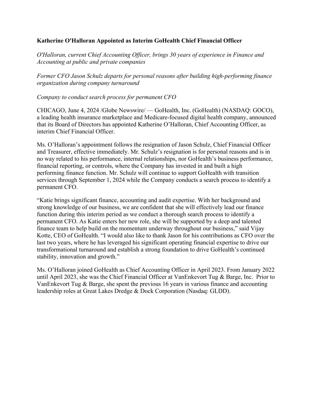 Katherine O'Halloran Appointed as Interim GoHealth Chief Financial Officer O'Halloran, current Chief Accounting Officer, brings 30 years of experience in Finance and Accounting at public and private companies Former CFO Jason Schulz departs for personal reasons after building high-performing finance organization during company turnaround Company to conduct search process for permanent CFO CHICAGO, June 4, 2024 /Globe Newswire/ — GoHealth, Inc. (GoHealth) (NASDAQ: GOCO), a leading health insurance marketplace and Medicare-focused digital health company, announced that its Board of Directors has appointed Katherine O’Halloran, Chief Accounting Officer, as interim Chief Financial Officer. Ms. O’Halloran’s appointment follows the resignation of Jason Schulz, Chief Financial Officer and Treasurer, effective immediately. Mr. Schulz’s resignation is for personal reasons and is in no way related to his performance, internal relationships, nor GoHealth’s business performance, financial reporting, or controls, where the Company has invested in and built a high performing finance function. Mr. Schulz will continue to support GoHealth with transition services through September 1, 2024 while the Company conducts a search process to identify a permanent CFO. “Katie brings significant finance, accounting and audit expertise. With her background and strong knowledge of our business, we are confident that she will effectively lead our finance function during this interim period as we conduct a thorough search process to identify a permanent CFO. As Katie enters her new role, she will be supported by a deep and talented finance team to help build on the momentum underway throughout our business,” said Vijay Kotte, CEO of GoHealth. “I would also like to thank Jason for his contributions as CFO over the last two years, where he has leveraged his significant operating financial expertise to drive our transformational turnaround and establish a strong foundation to drive GoHealth’s continued stability, innovation and growth.” Ms. O’Halloran joined GoHealth as Chief Accounting Officer in April 2023. From January 2022 until April 2023, she was the Chief Financial Officer at VanEnkevort Tug & Barge, Inc. Prior to VanEnkevort Tug & Barge, she spent the previous 16 years in various finance and accounting leadership roles at Great Lakes Dredge & Dock Corporation (Nasdaq: GLDD).