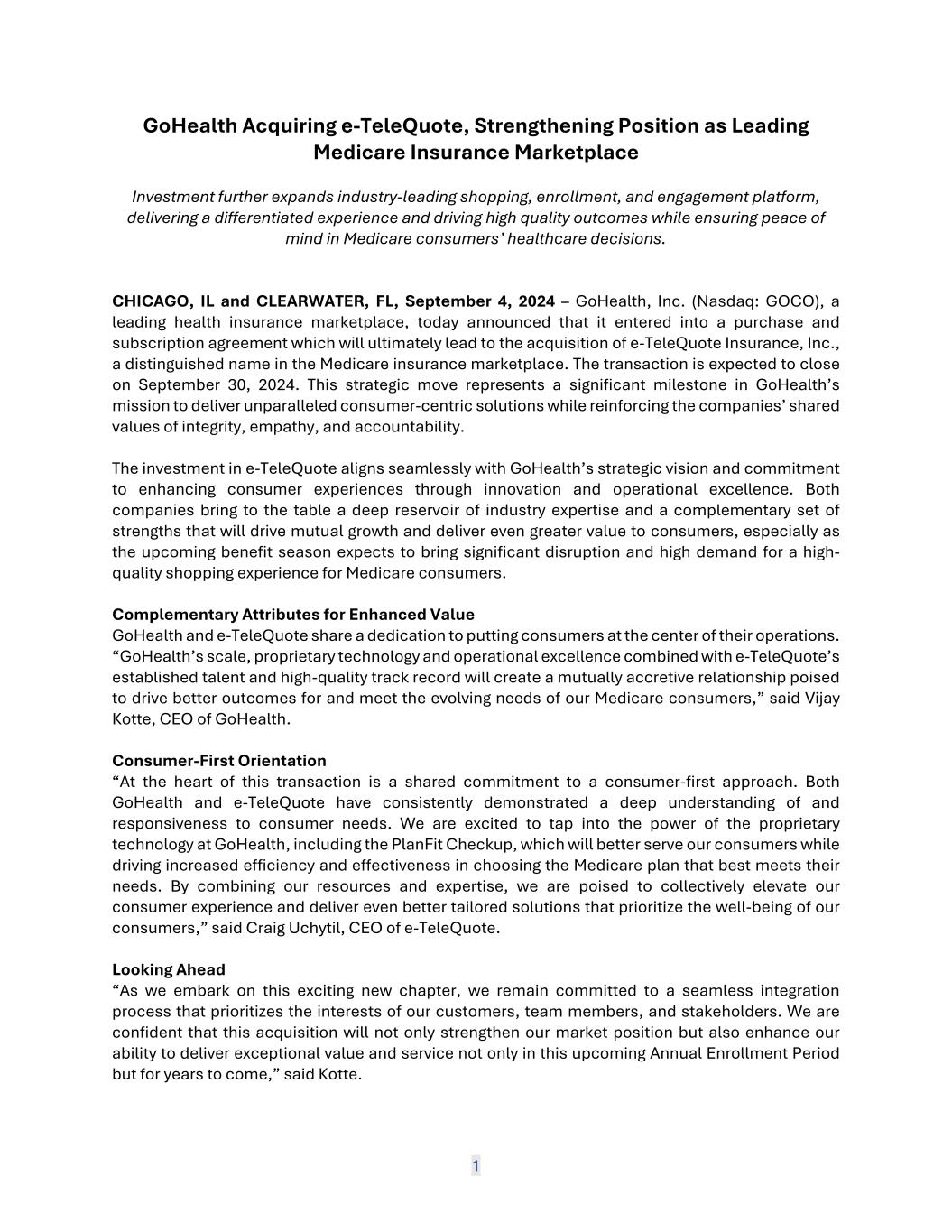 1 GoHealth Acquiring e-TeleQuote, Strengthening Position as Leading Medicare Insurance Marketplace Investment further expands industry-leading shopping, enrollment, and engagement platform, delivering a differentiated experience and driving high quality outcomes while ensuring peace of mind in Medicare consumers’ healthcare decisions. CHICAGO, IL and CLEARWATER, FL, September 4, 2024 – GoHealth, Inc. (Nasdaq: GOCO), a leading health insurance marketplace, today announced that it entered into a purchase and subscription agreement which will ultimately lead to the acquisition of e-TeleQuote Insurance, Inc., a distinguished name in the Medicare insurance marketplace. The transaction is expected to close on September 30, 2024. This strategic move represents a significant milestone in GoHealth’s mission to deliver unparalleled consumer-centric solutions while reinforcing the companies’ shared values of integrity, empathy, and accountability. The investment in e-TeleQuote aligns seamlessly with GoHealth’s strategic vision and commitment to enhancing consumer experiences through innovation and operational excellence. Both companies bring to the table a deep reservoir of industry expertise and a complementary set of strengths that will drive mutual growth and deliver even greater value to consumers, especially as the upcoming benefit season expects to bring significant disruption and high demand for a high- quality shopping experience for Medicare consumers. Complementary Attributes for Enhanced Value GoHealth and e-TeleQuote share a dedication to putting consumers at the center of their operations. “GoHealth’s scale, proprietary technology and operational excellence combined with e-TeleQuote’s established talent and high-quality track record will create a mutually accretive relationship poised to drive better outcomes for and meet the evolving needs of our Medicare consumers,” said Vijay Kotte, CEO of GoHealth. Consumer-First Orientation “At the heart of this transaction is a shared commitment to a consumer-first approach. Both GoHealth and e-TeleQuote have consistently demonstrated a deep understanding of and responsiveness to consumer needs. We are excited to tap into the power of the proprietary technology at GoHealth, including the PlanFit Checkup, which will better serve our consumers while driving increased efficiency and effectiveness in choosing the Medicare plan that best meets their needs. By combining our resources and expertise, we are poised to collectively elevate our consumer experience and deliver even better tailored solutions that prioritize the well-being of our consumers,” said Craig Uchytil, CEO of e-TeleQuote. Looking Ahead “As we embark on this exciting new chapter, we remain committed to a seamless integration process that prioritizes the interests of our customers, team members, and stakeholders. We are confident that this acquisition will not only strengthen our market position but also enhance our ability to deliver exceptional value and service not only in this upcoming Annual Enrollment Period but for years to come,” said Kotte.