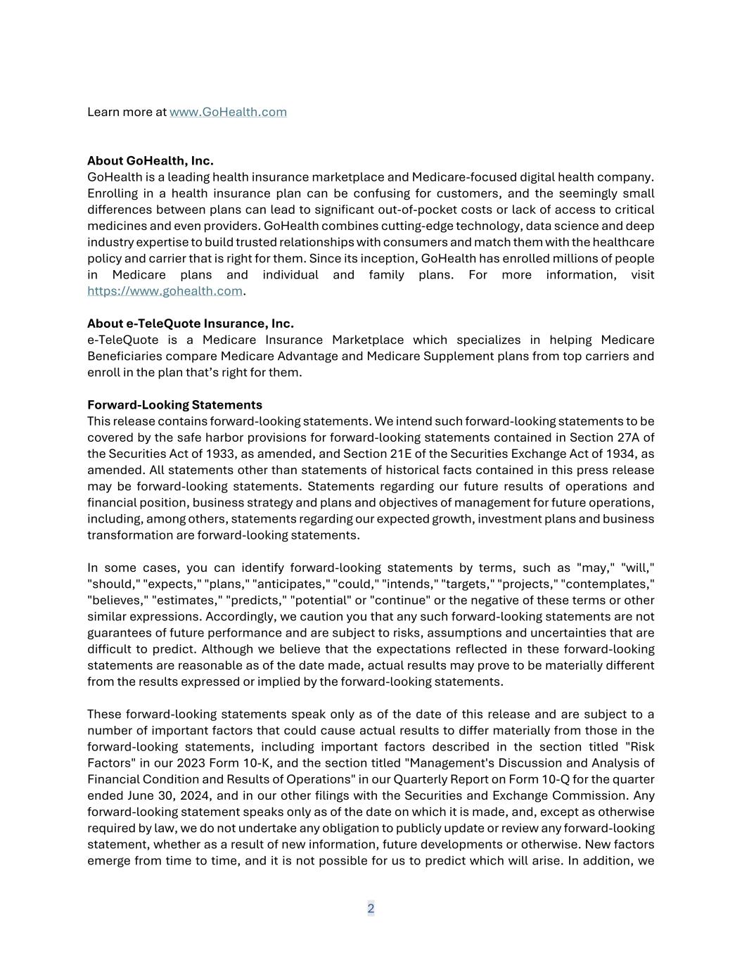 2 Learn more at www.GoHealth.com About GoHealth, Inc. GoHealth is a leading health insurance marketplace and Medicare-focused digital health company. Enrolling in a health insurance plan can be confusing for customers, and the seemingly small differences between plans can lead to significant out-of-pocket costs or lack of access to critical medicines and even providers. GoHealth combines cutting-edge technology, data science and deep industry expertise to build trusted relationships with consumers and match them with the healthcare policy and carrier that is right for them. Since its inception, GoHealth has enrolled millions of people in Medicare plans and individual and family plans. For more information, visit https://www.gohealth.com. About e-TeleQuote Insurance, Inc. e-TeleQuote is a Medicare Insurance Marketplace which specializes in helping Medicare Beneficiaries compare Medicare Advantage and Medicare Supplement plans from top carriers and enroll in the plan that’s right for them. Forward-Looking Statements This release contains forward-looking statements. We intend such forward-looking statements to be covered by the safe harbor provisions for forward-looking statements contained in Section 27A of the Securities Act of 1933, as amended, and Section 21E of the Securities Exchange Act of 1934, as amended. All statements other than statements of historical facts contained in this press release may be forward-looking statements. Statements regarding our future results of operations and financial position, business strategy and plans and objectives of management for future operations, including, among others, statements regarding our expected growth, investment plans and business transformation are forward-looking statements. In some cases, you can identify forward-looking statements by terms, such as "may," "will," "should," "expects," "plans," "anticipates," "could," "intends," "targets," "projects," "contemplates," "believes," "estimates," "predicts," "potential" or "continue" or the negative of these terms or other similar expressions. Accordingly, we caution you that any such forward-looking statements are not guarantees of future performance and are subject to risks, assumptions and uncertainties that are difficult to predict. Although we believe that the expectations reflected in these forward-looking statements are reasonable as of the date made, actual results may prove to be materially different from the results expressed or implied by the forward-looking statements. These forward-looking statements speak only as of the date of this release and are subject to a number of important factors that could cause actual results to differ materially from those in the forward-looking statements, including important factors described in the section titled "Risk Factors" in our 2023 Form 10-K, and the section titled "Management's Discussion and Analysis of Financial Condition and Results of Operations" in our Quarterly Report on Form 10-Q for the quarter ended June 30, 2024, and in our other filings with the Securities and Exchange Commission. Any forward-looking statement speaks only as of the date on which it is made, and, except as otherwise required by law, we do not undertake any obligation to publicly update or review any forward-looking statement, whether as a result of new information, future developments or otherwise. New factors emerge from time to time, and it is not possible for us to predict which will arise. In addition, we