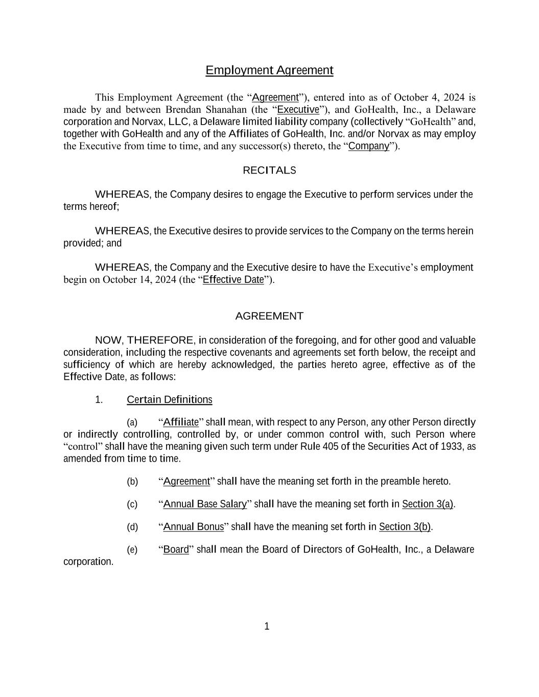 1 Employment Agreement This Employment Agreement (the “Agreement”), entered into as of October 4, 2024 is made by and between Brendan Shanahan (the “Executive”), and GoHealth, Inc., a Delaware corporation and Norvax, LLC, a Delaware limited liability company (collectively “GoHealth” and, together with GoHealth and any of the Affiliates of GoHealth, Inc. and/or Norvax as may employ the Executive from time to time, and any successor(s) thereto, the “Company”). RECITALS WHEREAS, the Company desires to engage the Executive to perform services under the terms hereof; WHEREAS, the Executive desires to provide services to the Company on the terms herein provided; and WHEREAS, the Company and the Executive desire to have the Executive’s employment begin on October 14, 2024 (the “Effective Date”). AGREEMENT NOW, THEREFORE, in consideration of the foregoing, and for other good and valuable consideration, including the respective covenants and agreements set forth below, the receipt and sufficiency of which are hereby acknowledged, the parties hereto agree, effective as of the Effective Date, as follows: 1. Certain Definitions (a) “Affiliate” shall mean, with respect to any Person, any other Person directly or indirectly controlling, controlled by, or under common control with, such Person where “control” shall have the meaning given such term under Rule 405 of the Securities Act of 1933, as amended from time to time. (b) “Agreement” shall have the meaning set forth in the preamble hereto. (c) “Annual Base Salary” shall have the meaning set forth in Section 3(a). (d) “Annual Bonus” shall have the meaning set forth in Section 3(b). (e) “Board” shall mean the Board of Directors of GoHealth, Inc., a Delaware corporation.