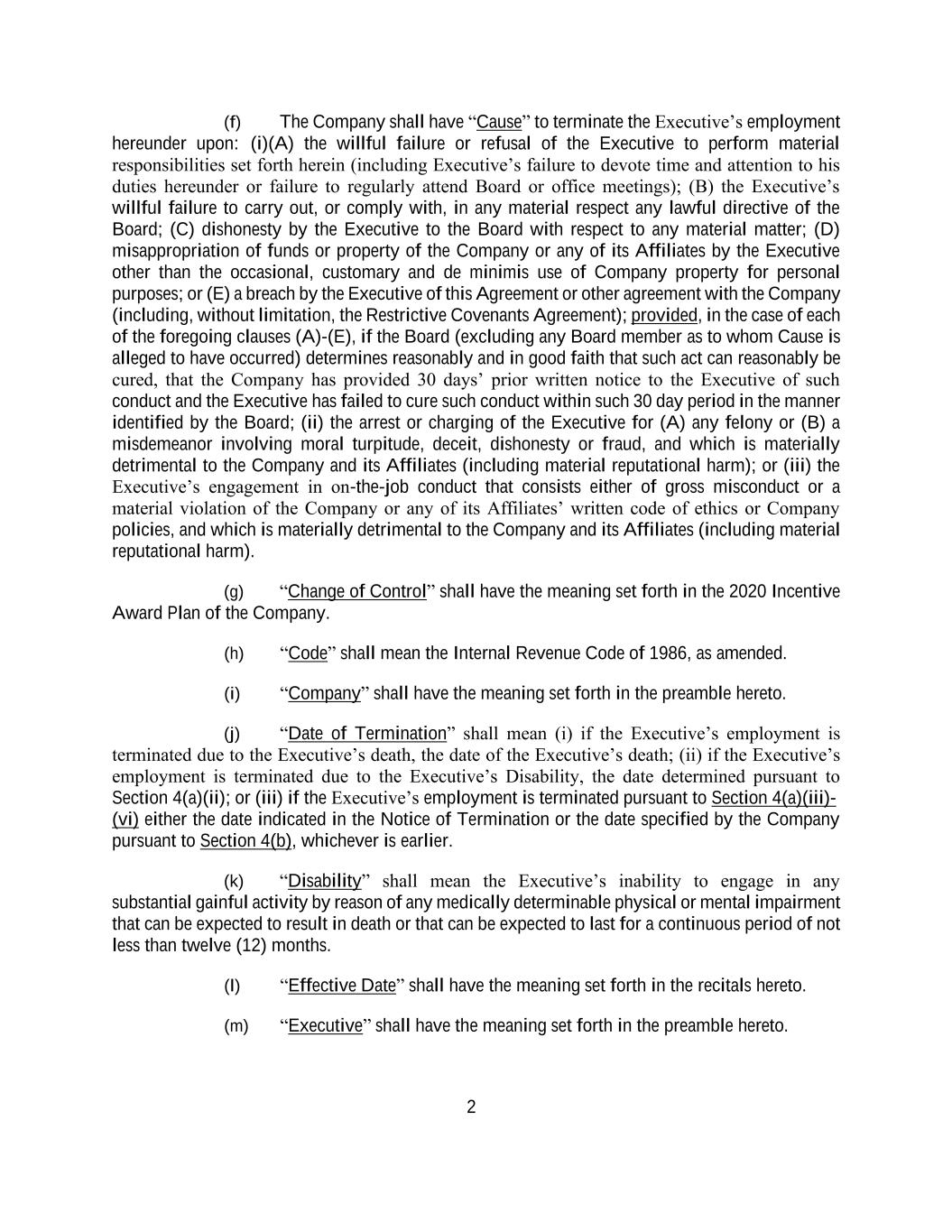 2 (f) The Company shall have “Cause” to terminate the Executive’s employment hereunder upon: (i)(A) the willful failure or refusal of the Executive to perform material responsibilities set forth herein (including Executive’s failure to devote time and attention to his duties hereunder or failure to regularly attend Board or office meetings); (B) the Executive’s willful failure to carry out, or comply with, in any material respect any lawful directive of the Board; (C) dishonesty by the Executive to the Board with respect to any material matter; (D) misappropriation of funds or property of the Company or any of its Affiliates by the Executive other than the occasional, customary and de minimis use of Company property for personal purposes; or (E) a breach by the Executive of this Agreement or other agreement with the Company (including, without limitation, the Restrictive Covenants Agreement); provided, in the case of each of the foregoing clauses (A)-(E), if the Board (excluding any Board member as to whom Cause is alleged to have occurred) determines reasonably and in good faith that such act can reasonably be cured, that the Company has provided 30 days’ prior written notice to the Executive of such conduct and the Executive has failed to cure such conduct within such 30 day period in the manner identified by the Board; (ii) the arrest or charging of the Executive for (A) any felony or (B) a misdemeanor involving moral turpitude, deceit, dishonesty or fraud, and which is materially detrimental to the Company and its Affiliates (including material reputational harm); or (iii) the Executive’s engagement in on-the-job conduct that consists either of gross misconduct or a material violation of the Company or any of its Affiliates’ written code of ethics or Company policies, and which is materially detrimental to the Company and its Affiliates (including material reputational harm). (g) “Change of Control” shall have the meaning set forth in the 2020 Incentive Award Plan of the Company. (h) “Code” shall mean the Internal Revenue Code of 1986, as amended. (i) “Company” shall have the meaning set forth in the preamble hereto. (j) “Date of Termination” shall mean (i) if the Executive’s employment is terminated due to the Executive’s death, the date of the Executive’s death; (ii) if the Executive’s employment is terminated due to the Executive’s Disability, the date determined pursuant to Section 4(a)(ii); or (iii) if the Executive’s employment is terminated pursuant to Section 4(a)(iii)- (vi) either the date indicated in the Notice of Termination or the date specified by the Company pursuant to Section 4(b), whichever is earlier. (k) “Disability” shall mean the Executive’s inability to engage in any substantial gainful activity by reason of any medically determinable physical or mental impairment that can be expected to result in death or that can be expected to last for a continuous period of not less than twelve (12) months. (l) “Effective Date” shall have the meaning set forth in the recitals hereto. (m) “Executive” shall have the meaning set forth in the preamble hereto.