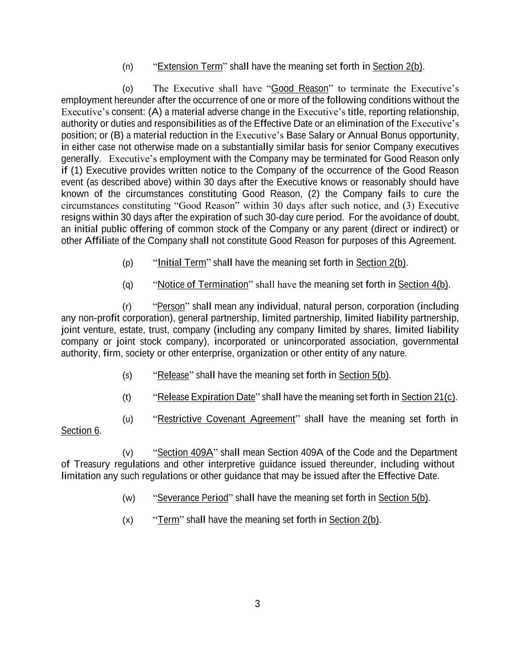 3 (n) “Extension Term” shall have the meaning set forth in Section 2(b). (o) The Executive shall have “Good Reason” to terminate the Executive’s employment hereunder after the occurrence of one or more of the following conditions without the Executive’s consent: (A) a material adverse change in the Executive’s title, reporting relationship, authority or duties and responsibilities as of the Effective Date or an elimination of the Executive’s position; or (B) a material reduction in the Executive’s Base Salary or Annual Bonus opportunity, in either case not otherwise made on a substantially similar basis for senior Company executives generally. Executive’s employment with the Company may be terminated for Good Reason only if (1) Executive provides written notice to the Company of the occurrence of the Good Reason event (as described above) within 30 days after the Executive knows or reasonably should have known of the circumstances constituting Good Reason, (2) the Company fails to cure the circumstances constituting “Good Reason” within 30 days after such notice, and (3) Executive resigns within 30 days after the expiration of such 30-day cure period. For the avoidance of doubt, an initial public offering of common stock of the Company or any parent (direct or indirect) or other Affiliate of the Company shall not constitute Good Reason for purposes of this Agreement. (p) “Initial Term” shall have the meaning set forth in Section 2(b). (q) “Notice of Termination” shall have the meaning set forth in Section 4(b). (r) “Person” shall mean any individual, natural person, corporation (including any non-profit corporation), general partnership, limited partnership, limited liability partnership, joint venture, estate, trust, company (including any company limited by shares, limited liability company or joint stock company), incorporated or unincorporated association, governmental authority, firm, society or other enterprise, organization or other entity of any nature. (s) “Release” shall have the meaning set forth in Section 5(b). (t) “Release Expiration Date” shall have the meaning set forth in Section 21(c). (u) “Restrictive Covenant Agreement” shall have the meaning set forth in Section 6. (v) “Section 409A” shall mean Section 409A of the Code and the Department of Treasury regulations and other interpretive guidance issued thereunder, including without limitation any such regulations or other guidance that may be issued after the Effective Date. (w) “Severance Period” shall have the meaning set forth in Section 5(b). (x) “Term” shall have the meaning set forth in Section 2(b).