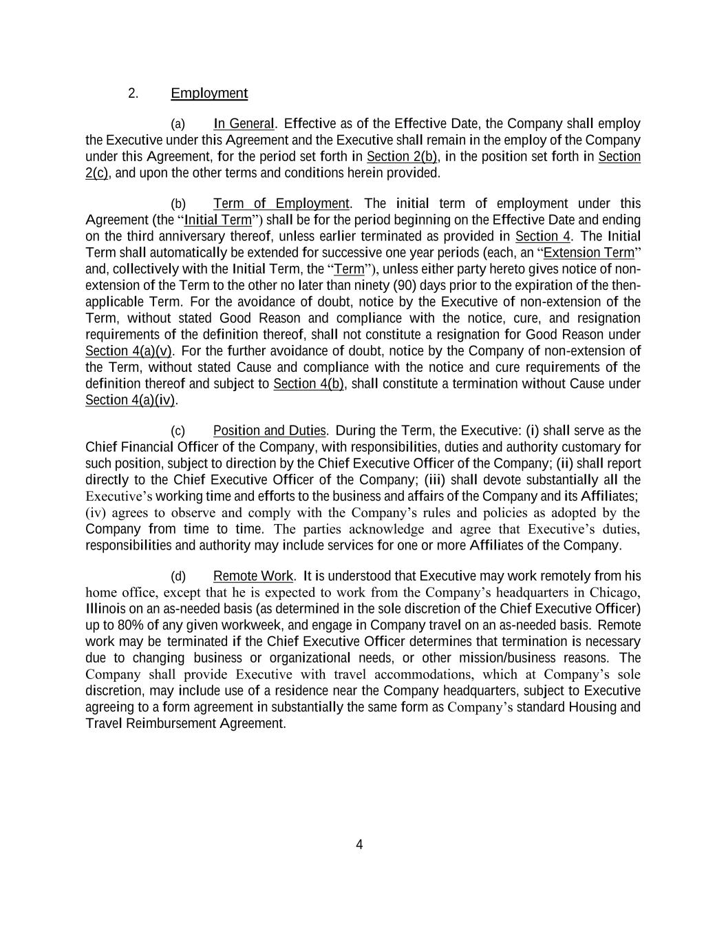 4 2. Employment (a) In General. Effective as of the Effective Date, the Company shall employ the Executive under this Agreement and the Executive shall remain in the employ of the Company under this Agreement, for the period set forth in Section 2(b), in the position set forth in Section 2(c), and upon the other terms and conditions herein provided. (b) Term of Employment. The initial term of employment under this Agreement (the “Initial Term”) shall be for the period beginning on the Effective Date and ending on the third anniversary thereof, unless earlier terminated as provided in Section 4. The Initial Term shall automatically be extended for successive one year periods (each, an “Extension Term” and, collectively with the Initial Term, the “Term”), unless either party hereto gives notice of non- extension of the Term to the other no later than ninety (90) days prior to the expiration of the then- applicable Term. For the avoidance of doubt, notice by the Executive of non-extension of the Term, without stated Good Reason and compliance with the notice, cure, and resignation requirements of the definition thereof, shall not constitute a resignation for Good Reason under Section 4(a)(v). For the further avoidance of doubt, notice by the Company of non-extension of the Term, without stated Cause and compliance with the notice and cure requirements of the definition thereof and subject to Section 4(b), shall constitute a termination without Cause under Section 4(a)(iv). (c) Position and Duties. During the Term, the Executive: (i) shall serve as the Chief Financial Officer of the Company, with responsibilities, duties and authority customary for such position, subject to direction by the Chief Executive Officer of the Company; (ii) shall report directly to the Chief Executive Officer of the Company; (iii) shall devote substantially all the Executive’s working time and efforts to the business and affairs of the Company and its Affiliates; (iv) agrees to observe and comply with the Company’s rules and policies as adopted by the Company from time to time. The parties acknowledge and agree that Executive’s duties, responsibilities and authority may include services for one or more Affiliates of the Company. (d) Remote Work. It is understood that Executive may work remotely from his home office, except that he is expected to work from the Company’s headquarters in Chicago, Illinois on an as-needed basis (as determined in the sole discretion of the Chief Executive Officer) up to 80% of any given workweek, and engage in Company travel on an as-needed basis. Remote work may be terminated if the Chief Executive Officer determines that termination is necessary due to changing business or organizational needs, or other mission/business reasons. The Company shall provide Executive with travel accommodations, which at Company’s sole discretion, may include use of a residence near the Company headquarters, subject to Executive agreeing to a form agreement in substantially the same form as Company’s standard Housing and Travel Reimbursement Agreement.