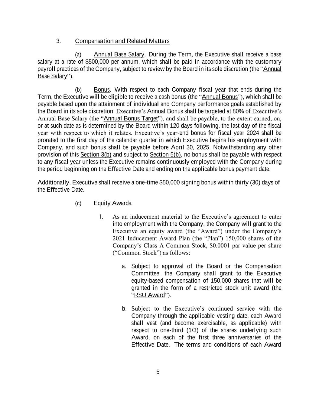 5 3. Compensation and Related Matters (a) Annual Base Salary. During the Term, the Executive shall receive a base salary at a rate of $500,000 per annum, which shall be paid in accordance with the customary payroll practices of the Company, subject to review by the Board in its sole discretion (the “Annual Base Salary”). (b) Bonus. With respect to each Company fiscal year that ends during the Term, the Executive will be eligible to receive a cash bonus (the “Annual Bonus”), which shall be payable based upon the attainment of individual and Company performance goals established by the Board in its sole discretion. Executive’s Annual Bonus shall be targeted at 80% of Executive’s Annual Base Salary (the “Annual Bonus Target”), and shall be payable, to the extent earned, on, or at such date as is determined by the Board within 120 days following, the last day of the fiscal year with respect to which it relates. Executive’s year-end bonus for fiscal year 2024 shall be prorated to the first day of the calendar quarter in which Executive begins his employment with Company, and such bonus shall be payable before April 30, 2025. Notwithstanding any other provision of this Section 3(b) and subject to Section 5(b), no bonus shall be payable with respect to any fiscal year unless the Executive remains continuously employed with the Company during the period beginning on the Effective Date and ending on the applicable bonus payment date. Additionally, Executive shall receive a one-time $50,000 signing bonus within thirty (30) days of the Effective Date. (c) Equity Awards. i. As an inducement material to the Executive’s agreement to enter into employment with the Company, the Company will grant to the Executive an equity award (the “Award”) under the Company’s 2021 Inducement Award Plan (the “Plan”) 150,000 shares of the Company’s Class A Common Stock, $0.0001 par value per share (“Common Stock”) as follows: a. Subject to approval of the Board or the Compensation Committee, the Company shall grant to the Executive equity-based compensation of 150,000 shares that will be granted in the form of a restricted stock unit award (the “RSU Award”). b. Subject to the Executive’s continued service with the Company through the applicable vesting date, each Award shall vest (and become exercisable, as applicable) with respect to one-third (1/3) of the shares underlying such Award, on each of the first three anniversaries of the Effective Date. The terms and conditions of each Award