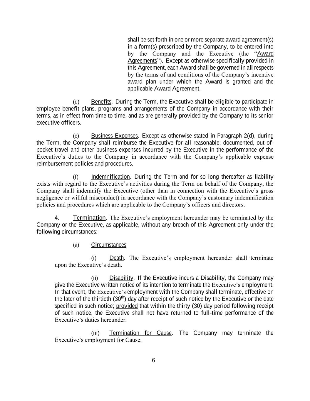 6 shall be set forth in one or more separate award agreement(s) in a form(s) prescribed by the Company, to be entered into by the Company and the Executive (the “Award Agreements”). Except as otherwise specifically provided in this Agreement, each Award shall be governed in all respects by the terms of and conditions of the Company’s incentive award plan under which the Award is granted and the applicable Award Agreement. (d) Benefits. During the Term, the Executive shall be eligible to participate in employee benefit plans, programs and arrangements of the Company in accordance with their terms, as in effect from time to time, and as are generally provided by the Company to its senior executive officers. (e) Business Expenses. Except as otherwise stated in Paragraph 2(d), during the Term, the Company shall reimburse the Executive for all reasonable, documented, out-of- pocket travel and other business expenses incurred by the Executive in the performance of the Executive’s duties to the Company in accordance with the Company’s applicable expense reimbursement policies and procedures. (f) Indemnification. During the Term and for so long thereafter as liability exists with regard to the Executive’s activities during the Term on behalf of the Company, the Company shall indemnify the Executive (other than in connection with the Executive’s gross negligence or willful misconduct) in accordance with the Company’s customary indemnification policies and procedures which are applicable to the Company’s officers and directors. 4. Termination. The Executive’s employment hereunder may be terminated by the Company or the Executive, as applicable, without any breach of this Agreement only under the following circumstances: (a) Circumstances (i) Death. The Executive’s employment hereunder shall terminate upon the Executive’s death. (ii) Disability. If the Executive incurs a Disability, the Company may give the Executive written notice of its intention to terminate the Executive’s employment. In that event, the Executive’s employment with the Company shall terminate, effective on the later of the thirtieth (30th) day after receipt of such notice by the Executive or the date specified in such notice; provided that within the thirty (30) day period following receipt of such notice, the Executive shall not have returned to full-time performance of the Executive’s duties hereunder. (iii) Termination for Cause. The Company may terminate the Executive’s employment for Cause.