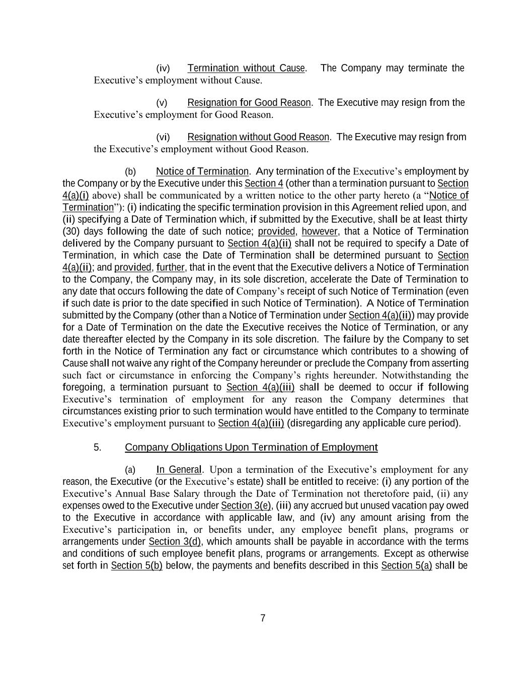 7 (iv) Termination without Cause. The Company may terminate the Executive’s employment without Cause. (v) Resignation for Good Reason. The Executive may resign from the Executive’s employment for Good Reason. (vi) Resignation without Good Reason. The Executive may resign from the Executive’s employment without Good Reason. (b) Notice of Termination. Any termination of the Executive’s employment by the Company or by the Executive under this Section 4 (other than a termination pursuant to Section 4(a)(i) above) shall be communicated by a written notice to the other party hereto (a “Notice of Termination”): (i) indicating the specific termination provision in this Agreement relied upon, and (ii) specifying a Date of Termination which, if submitted by the Executive, shall be at least thirty (30) days following the date of such notice; provided, however, that a Notice of Termination delivered by the Company pursuant to Section 4(a)(ii) shall not be required to specify a Date of Termination, in which case the Date of Termination shall be determined pursuant to Section 4(a)(ii); and provided, further, that in the event that the Executive delivers a Notice of Termination to the Company, the Company may, in its sole discretion, accelerate the Date of Termination to any date that occurs following the date of Company’s receipt of such Notice of Termination (even if such date is prior to the date specified in such Notice of Termination). A Notice of Termination submitted by the Company (other than a Notice of Termination under Section 4(a)(ii)) may provide for a Date of Termination on the date the Executive receives the Notice of Termination, or any date thereafter elected by the Company in its sole discretion. The failure by the Company to set forth in the Notice of Termination any fact or circumstance which contributes to a showing of Cause shall not waive any right of the Company hereunder or preclude the Company from asserting such fact or circumstance in enforcing the Company’s rights hereunder. Notwithstanding the foregoing, a termination pursuant to Section 4(a)(iii) shall be deemed to occur if following Executive’s termination of employment for any reason the Company determines that circumstances existing prior to such termination would have entitled to the Company to terminate Executive’s employment pursuant to Section 4(a)(iii) (disregarding any applicable cure period). 5. Company Obligations Upon Termination of Employment (a) In General. Upon a termination of the Executive’s employment for any reason, the Executive (or the Executive’s estate) shall be entitled to receive: (i) any portion of the Executive’s Annual Base Salary through the Date of Termination not theretofore paid, (ii) any expenses owed to the Executive under Section 3(e), (iii) any accrued but unused vacation pay owed to the Executive in accordance with applicable law, and (iv) any amount arising from the Executive’s participation in, or benefits under, any employee benefit plans, programs or arrangements under Section 3(d), which amounts shall be payable in accordance with the terms and conditions of such employee benefit plans, programs or arrangements. Except as otherwise set forth in Section 5(b) below, the payments and benefits described in this Section 5(a) shall be