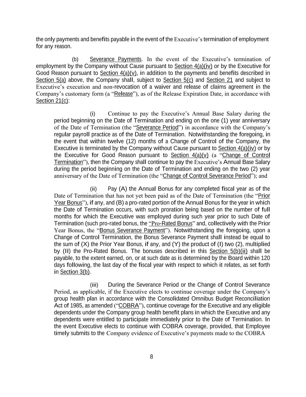 8 the only payments and benefits payable in the event of the Executive’s termination of employment for any reason. (b) Severance Payments. In the event of the Executive’s termination of employment by the Company without Cause pursuant to Section 4(a)(iv) or by the Executive for Good Reason pursuant to Section 4(a)(v), in addition to the payments and benefits described in Section 5(a) above, the Company shall, subject to Section 5(c) and Section 21 and subject to Executive’s execution and non-revocation of a waiver and release of claims agreement in the Company’s customary form (a “Release”), as of the Release Expiration Date, in accordance with Section 21(c): (i) Continue to pay the Executive’s Annual Base Salary during the period beginning on the Date of Termination and ending on the one (1) year anniversary of the Date of Termination (the “Severance Period”) in accordance with the Company’s regular payroll practice as of the Date of Termination. Notwithstanding the foregoing, in the event that within twelve (12) months of a Change of Control of the Company, the Executive is terminated by the Company without Cause pursuant to Section 4(a)(iv) or by the Executive for Good Reason pursuant to Section 4(a)(v) (a “Change of Control Termination”), then the Company shall continue to pay the Executive’s Annual Base Salary during the period beginning on the Date of Termination and ending on the two (2) year anniversary of the Date of Termination (the “Change of Control Severance Period”); and (ii) Pay (A) the Annual Bonus for any completed fiscal year as of the Date of Termination that has not yet been paid as of the Date of Termination (the “Prior Year Bonus”), if any, and (B) a pro-rated portion of the Annual Bonus for the year in which the Date of Termination occurs, with such proration being based on the number of full months for which the Executive was employed during such year prior to such Date of Termination (such pro-rated bonus, the “Pro-Rated Bonus” and, collectively with the Prior Year Bonus, the “Bonus Severance Payment”). Notwithstanding the foregoing, upon a Change of Control Termination, the Bonus Severance Payment shall instead be equal to the sum of (X) the Prior Year Bonus, if any, and (Y) the product of (I) two (2), multiplied by (II) the Pro-Rated Bonus. The bonuses described in this Section 5(b)(ii) shall be payable, to the extent earned, on, or at such date as is determined by the Board within 120 days following, the last day of the fiscal year with respect to which it relates, as set forth in Section 3(b). (iii) During the Severance Period or the Change of Control Severance Period, as applicable, if the Executive elects to continue coverage under the Company’s group health plan in accordance with the Consolidated Omnibus Budget Reconciliation Act of 1985, as amended (“COBRA”), continue coverage for the Executive and any eligible dependents under the Company group health benefit plans in which the Executive and any dependents were entitled to participate immediately prior to the Date of Termination. In the event Executive elects to continue with COBRA coverage, provided, that Employee timely submits to the Company evidence of Executive’s payments made to the COBRA