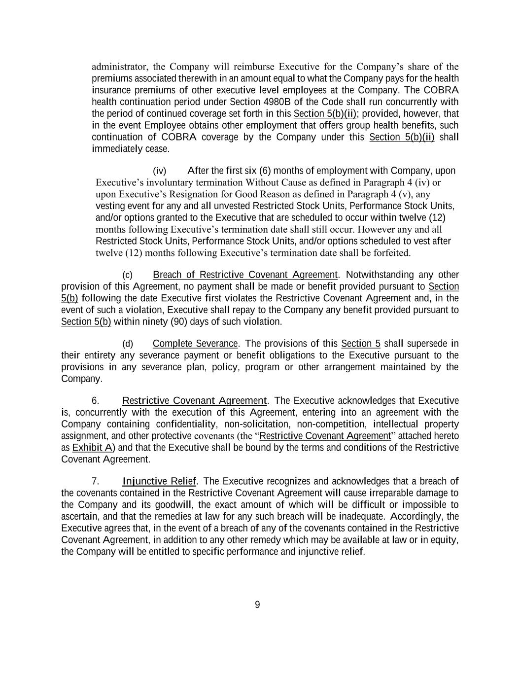 9 administrator, the Company will reimburse Executive for the Company’s share of the premiums associated therewith in an amount equal to what the Company pays for the health insurance premiums of other executive level employees at the Company. The COBRA health continuation period under Section 4980B of the Code shall run concurrently with the period of continued coverage set forth in this Section 5(b)(ii); provided, however, that in the event Employee obtains other employment that offers group health benefits, such continuation of COBRA coverage by the Company under this Section 5(b)(ii) shall immediately cease. (iv) After the first six (6) months of employment with Company, upon Executive’s involuntary termination Without Cause as defined in Paragraph 4 (iv) or upon Executive’s Resignation for Good Reason as defined in Paragraph 4 (v), any vesting event for any and all unvested Restricted Stock Units, Performance Stock Units, and/or options granted to the Executive that are scheduled to occur within twelve (12) months following Executive’s termination date shall still occur. However any and all Restricted Stock Units, Performance Stock Units, and/or options scheduled to vest after twelve (12) months following Executive’s termination date shall be forfeited. (c) Breach of Restrictive Covenant Agreement. Notwithstanding any other provision of this Agreement, no payment shall be made or benefit provided pursuant to Section 5(b) following the date Executive first violates the Restrictive Covenant Agreement and, in the event of such a violation, Executive shall repay to the Company any benefit provided pursuant to Section 5(b) within ninety (90) days of such violation. (d) Complete Severance. The provisions of this Section 5 shall supersede in their entirety any severance payment or benefit obligations to the Executive pursuant to the provisions in any severance plan, policy, program or other arrangement maintained by the Company. 6. Restrictive Covenant Agreement. The Executive acknowledges that Executive is, concurrently with the execution of this Agreement, entering into an agreement with the Company containing confidentiality, non-solicitation, non-competition, intellectual property assignment, and other protective covenants (the “Restrictive Covenant Agreement” attached hereto as Exhibit A) and that the Executive shall be bound by the terms and conditions of the Restrictive Covenant Agreement. 7. Injunctive Relief. The Executive recognizes and acknowledges that a breach of the covenants contained in the Restrictive Covenant Agreement will cause irreparable damage to the Company and its goodwill, the exact amount of which will be difficult or impossible to ascertain, and that the remedies at law for any such breach will be inadequate. Accordingly, the Executive agrees that, in the event of a breach of any of the covenants contained in the Restrictive Covenant Agreement, in addition to any other remedy which may be available at law or in equity, the Company will be entitled to specific performance and injunctive relief.