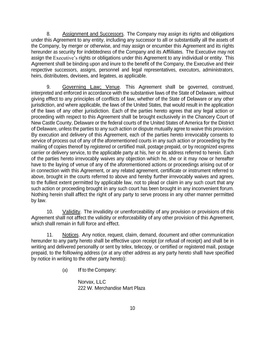 10 8. Assignment and Successors. The Company may assign its rights and obligations under this Agreement to any entity, including any successor to all or substantially all the assets of the Company, by merger or otherwise, and may assign or encumber this Agreement and its rights hereunder as security for indebtedness of the Company and its Affiliates. The Executive may not assign the Executive’s rights or obligations under this Agreement to any individual or entity. This Agreement shall be binding upon and inure to the benefit of the Company, the Executive and their respective successors, assigns, personnel and legal representatives, executors, administrators, heirs, distributees, devisees, and legatees, as applicable. 9. Governing Law; Venue. This Agreement shall be governed, construed, interpreted and enforced in accordance with the substantive laws of the State of Delaware, without giving effect to any principles of conflicts of law, whether of the State of Delaware or any other jurisdiction, and where applicable, the laws of the United States, that would result in the application of the laws of any other jurisdiction. Each of the parties hereto agrees that any legal action or proceeding with respect to this Agreement shall be brought exclusively in the Chancery Court of New Castle County, Delaware or the federal courts of the United States of America for the District of Delaware, unless the parties to any such action or dispute mutually agree to waive this provision. By execution and delivery of this Agreement, each of the parties hereto irrevocably consents to service of process out of any of the aforementioned courts in any such action or proceeding by the mailing of copies thereof by registered or certified mail, postage prepaid, or by recognized express carrier or delivery service, to the applicable party at his, her or its address referred to herein. Each of the parties hereto irrevocably waives any objection which he, she or it may now or hereafter have to the laying of venue of any of the aforementioned actions or proceedings arising out of or in connection with this Agreement, or any related agreement, certificate or instrument referred to above, brought in the courts referred to above and hereby further irrevocably waives and agrees, to the fullest extent permitted by applicable law, not to plead or claim in any such court that any such action or proceeding brought in any such court has been brought in any inconvenient forum. Nothing herein shall affect the right of any party to serve process in any other manner permitted by law. 10. Validity. The invalidity or unenforceability of any provision or provisions of this Agreement shall not affect the validity or enforceability of any other provision of this Agreement, which shall remain in full force and effect. 11. Notices. Any notice, request, claim, demand, document and other communication hereunder to any party hereto shall be effective upon receipt (or refusal of receipt) and shall be in writing and delivered personally or sent by telex, telecopy, or certified or registered mail, postage prepaid, to the following address (or at any other address as any party hereto shall have specified by notice in writing to the other party hereto): (a) If to the Company: Norvax, LLC 222 W. Merchandise Mart Plaza