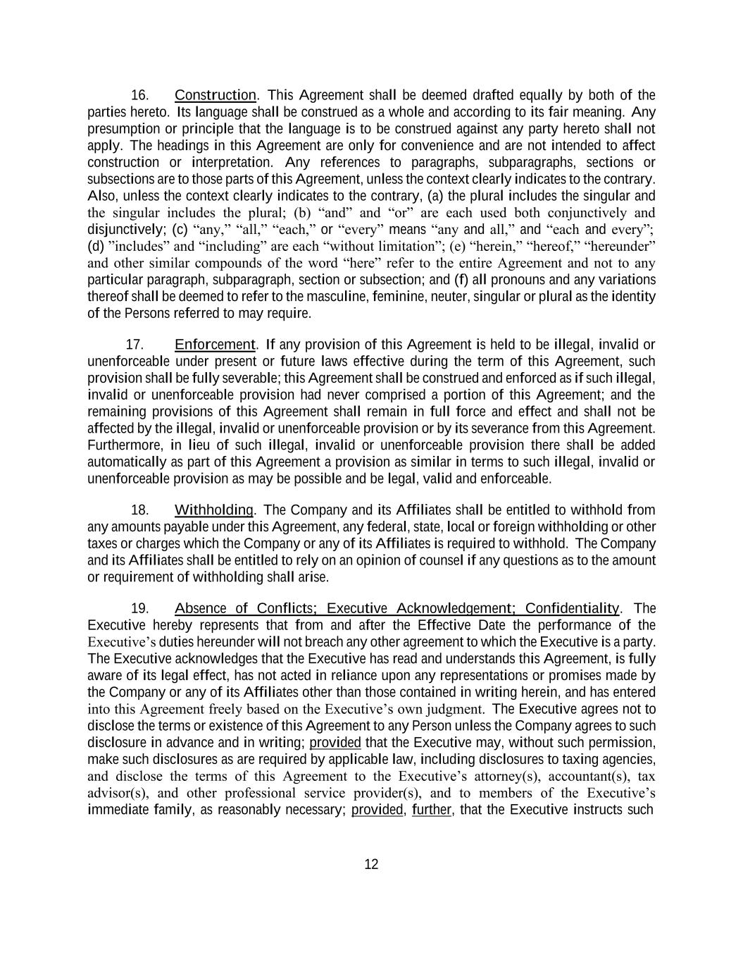 12 16. Construction. This Agreement shall be deemed drafted equally by both of the parties hereto. Its language shall be construed as a whole and according to its fair meaning. Any presumption or principle that the language is to be construed against any party hereto shall not apply. The headings in this Agreement are only for convenience and are not intended to affect construction or interpretation. Any references to paragraphs, subparagraphs, sections or subsections are to those parts of this Agreement, unless the context clearly indicates to the contrary. Also, unless the context clearly indicates to the contrary, (a) the plural includes the singular and the singular includes the plural; (b) “and” and “or” are each used both conjunctively and disjunctively; (c) “any,” “all,” “each,” or “every” means “any and all,” and “each and every”; (d) ”includes” and “including” are each “without limitation”; (e) “herein,” “hereof,” “hereunder” and other similar compounds of the word “here” refer to the entire Agreement and not to any particular paragraph, subparagraph, section or subsection; and (f) all pronouns and any variations thereof shall be deemed to refer to the masculine, feminine, neuter, singular or plural as the identity of the Persons referred to may require. 17. Enforcement. If any provision of this Agreement is held to be illegal, invalid or unenforceable under present or future laws effective during the term of this Agreement, such provision shall be fully severable; this Agreement shall be construed and enforced as if such illegal, invalid or unenforceable provision had never comprised a portion of this Agreement; and the remaining provisions of this Agreement shall remain in full force and effect and shall not be affected by the illegal, invalid or unenforceable provision or by its severance from this Agreement. Furthermore, in lieu of such illegal, invalid or unenforceable provision there shall be added automatically as part of this Agreement a provision as similar in terms to such illegal, invalid or unenforceable provision as may be possible and be legal, valid and enforceable. 18. Withholding. The Company and its Affiliates shall be entitled to withhold from any amounts payable under this Agreement, any federal, state, local or foreign withholding or other taxes or charges which the Company or any of its Affiliates is required to withhold. The Company and its Affiliates shall be entitled to rely on an opinion of counsel if any questions as to the amount or requirement of withholding shall arise. 19. Absence of Conflicts; Executive Acknowledgement; Confidentiality. The Executive hereby represents that from and after the Effective Date the performance of the Executive’s duties hereunder will not breach any other agreement to which the Executive is a party. The Executive acknowledges that the Executive has read and understands this Agreement, is fully aware of its legal effect, has not acted in reliance upon any representations or promises made by the Company or any of its Affiliates other than those contained in writing herein, and has entered into this Agreement freely based on the Executive’s own judgment. The Executive agrees not to disclose the terms or existence of this Agreement to any Person unless the Company agrees to such disclosure in advance and in writing; provided that the Executive may, without such permission, make such disclosures as are required by applicable law, including disclosures to taxing agencies, and disclose the terms of this Agreement to the Executive’s attorney(s), accountant(s), tax advisor(s), and other professional service provider(s), and to members of the Executive’s immediate family, as reasonably necessary; provided, further, that the Executive instructs such