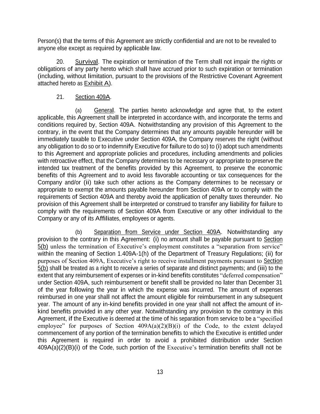 13 Person(s) that the terms of this Agreement are strictly confidential and are not to be revealed to anyone else except as required by applicable law. 20. Survival. The expiration or termination of the Term shall not impair the rights or obligations of any party hereto which shall have accrued prior to such expiration or termination (including, without limitation, pursuant to the provisions of the Restrictive Covenant Agreement attached hereto as Exhibit A). 21. Section 409A. (a) General. The parties hereto acknowledge and agree that, to the extent applicable, this Agreement shall be interpreted in accordance with, and incorporate the terms and conditions required by, Section 409A. Notwithstanding any provision of this Agreement to the contrary, in the event that the Company determines that any amounts payable hereunder will be immediately taxable to Executive under Section 409A, the Company reserves the right (without any obligation to do so or to indemnify Executive for failure to do so) to (i) adopt such amendments to this Agreement and appropriate policies and procedures, including amendments and policies with retroactive effect, that the Company determines to be necessary or appropriate to preserve the intended tax treatment of the benefits provided by this Agreement, to preserve the economic benefits of this Agreement and to avoid less favorable accounting or tax consequences for the Company and/or (ii) take such other actions as the Company determines to be necessary or appropriate to exempt the amounts payable hereunder from Section 409A or to comply with the requirements of Section 409A and thereby avoid the application of penalty taxes thereunder. No provision of this Agreement shall be interpreted or construed to transfer any liability for failure to comply with the requirements of Section 409A from Executive or any other individual to the Company or any of its Affiliates, employees or agents. (b) Separation from Service under Section 409A. Notwithstanding any provision to the contrary in this Agreement: (i) no amount shall be payable pursuant to Section 5(b) unless the termination of Executive’s employment constitutes a “separation from service” within the meaning of Section 1.409A-1(h) of the Department of Treasury Regulations; (ii) for purposes of Section 409A, Executive’s right to receive installment payments pursuant to Section 5(b) shall be treated as a right to receive a series of separate and distinct payments; and (iii) to the extent that any reimbursement of expenses or in-kind benefits constitutes “deferred compensation” under Section 409A, such reimbursement or benefit shall be provided no later than December 31 of the year following the year in which the expense was incurred. The amount of expenses reimbursed in one year shall not affect the amount eligible for reimbursement in any subsequent year. The amount of any in-kind benefits provided in one year shall not affect the amount of in- kind benefits provided in any other year. Notwithstanding any provision to the contrary in this Agreement, if the Executive is deemed at the time of his separation from service to be a “specified employee” for purposes of Section 409A(a)(2)(B)(i) of the Code, to the extent delayed commencement of any portion of the termination benefits to which the Executive is entitled under this Agreement is required in order to avoid a prohibited distribution under Section 409A(a)(2)(B)(i) of the Code, such portion of the Executive’s termination benefits shall not be