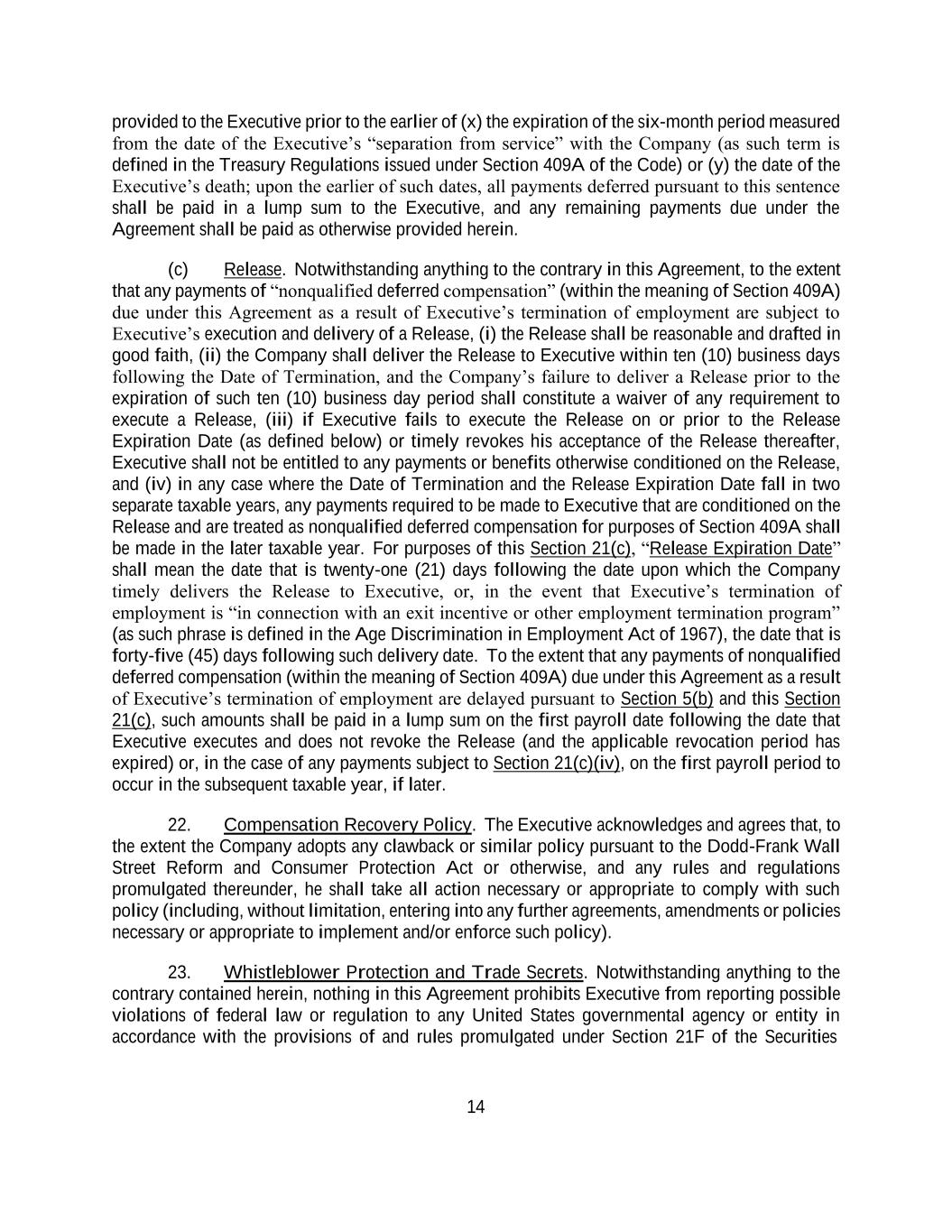 14 provided to the Executive prior to the earlier of (x) the expiration of the six-month period measured from the date of the Executive’s “separation from service” with the Company (as such term is defined in the Treasury Regulations issued under Section 409A of the Code) or (y) the date of the Executive’s death; upon the earlier of such dates, all payments deferred pursuant to this sentence shall be paid in a lump sum to the Executive, and any remaining payments due under the Agreement shall be paid as otherwise provided herein. (c) Release. Notwithstanding anything to the contrary in this Agreement, to the extent that any payments of “nonqualified deferred compensation” (within the meaning of Section 409A) due under this Agreement as a result of Executive’s termination of employment are subject to Executive’s execution and delivery of a Release, (i) the Release shall be reasonable and drafted in good faith, (ii) the Company shall deliver the Release to Executive within ten (10) business days following the Date of Termination, and the Company’s failure to deliver a Release prior to the expiration of such ten (10) business day period shall constitute a waiver of any requirement to execute a Release, (iii) if Executive fails to execute the Release on or prior to the Release Expiration Date (as defined below) or timely revokes his acceptance of the Release thereafter, Executive shall not be entitled to any payments or benefits otherwise conditioned on the Release, and (iv) in any case where the Date of Termination and the Release Expiration Date fall in two separate taxable years, any payments required to be made to Executive that are conditioned on the Release and are treated as nonqualified deferred compensation for purposes of Section 409A shall be made in the later taxable year. For purposes of this Section 21(c), “Release Expiration Date” shall mean the date that is twenty-one (21) days following the date upon which the Company timely delivers the Release to Executive, or, in the event that Executive’s termination of employment is “in connection with an exit incentive or other employment termination program” (as such phrase is defined in the Age Discrimination in Employment Act of 1967), the date that is forty-five (45) days following such delivery date. To the extent that any payments of nonqualified deferred compensation (within the meaning of Section 409A) due under this Agreement as a result of Executive’s termination of employment are delayed pursuant to Section 5(b) and this Section 21(c), such amounts shall be paid in a lump sum on the first payroll date following the date that Executive executes and does not revoke the Release (and the applicable revocation period has expired) or, in the case of any payments subject to Section 21(c)(iv), on the first payroll period to occur in the subsequent taxable year, if later. 22. Compensation Recovery Policy. The Executive acknowledges and agrees that, to the extent the Company adopts any clawback or similar policy pursuant to the Dodd-Frank Wall Street Reform and Consumer Protection Act or otherwise, and any rules and regulations promulgated thereunder, he shall take all action necessary or appropriate to comply with such policy (including, without limitation, entering into any further agreements, amendments or policies necessary or appropriate to implement and/or enforce such policy). 23. Whistleblower Protection and Trade Secrets. Notwithstanding anything to the contrary contained herein, nothing in this Agreement prohibits Executive from reporting possible violations of federal law or regulation to any United States governmental agency or entity in accordance with the provisions of and rules promulgated under Section 21F of the Securities
