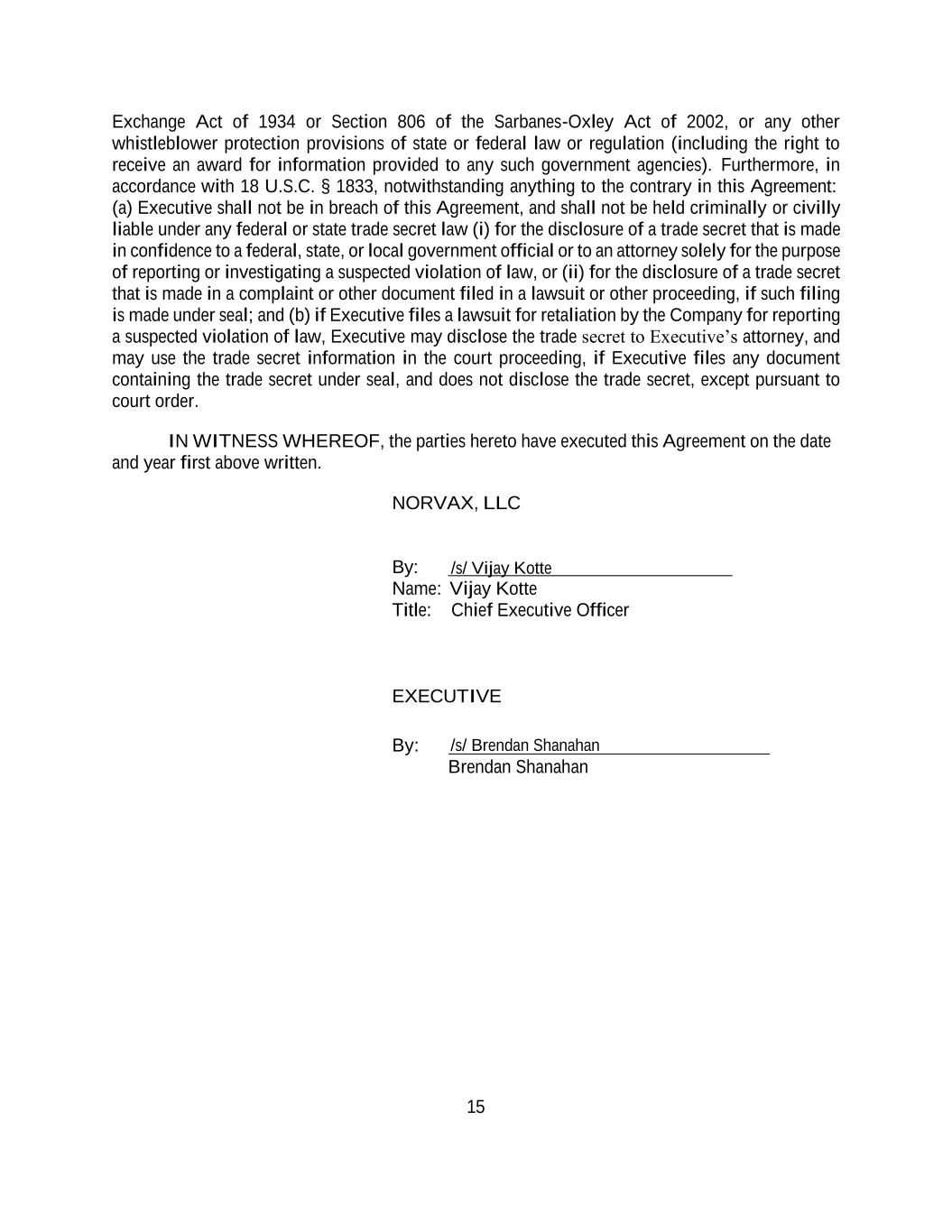 15 Exchange Act of 1934 or Section 806 of the Sarbanes-Oxley Act of 2002, or any other whistleblower protection provisions of state or federal law or regulation (including the right to receive an award for information provided to any such government agencies). Furthermore, in accordance with 18 U.S.C. § 1833, notwithstanding anything to the contrary in this Agreement: (a) Executive shall not be in breach of this Agreement, and shall not be held criminally or civilly liable under any federal or state trade secret law (i) for the disclosure of a trade secret that is made in confidence to a federal, state, or local government official or to an attorney solely for the purpose of reporting or investigating a suspected violation of law, or (ii) for the disclosure of a trade secret that is made in a complaint or other document filed in a lawsuit or other proceeding, if such filing is made under seal; and (b) if Executive files a lawsuit for retaliation by the Company for reporting a suspected violation of law, Executive may disclose the trade secret to Executive’s attorney, and may use the trade secret information in the court proceeding, if Executive files any document containing the trade secret under seal, and does not disclose the trade secret, except pursuant to court order. IN WITNESS WHEREOF, the parties hereto have executed this Agreement on the date and year first above written. NORVAX, LLC By: Name: Vijay Kotte Title: Chief Executive Officer EXECUTIVE By: Brendan Shanahan /s/ Vijay Kotte /s/ Brendan Shanahan
