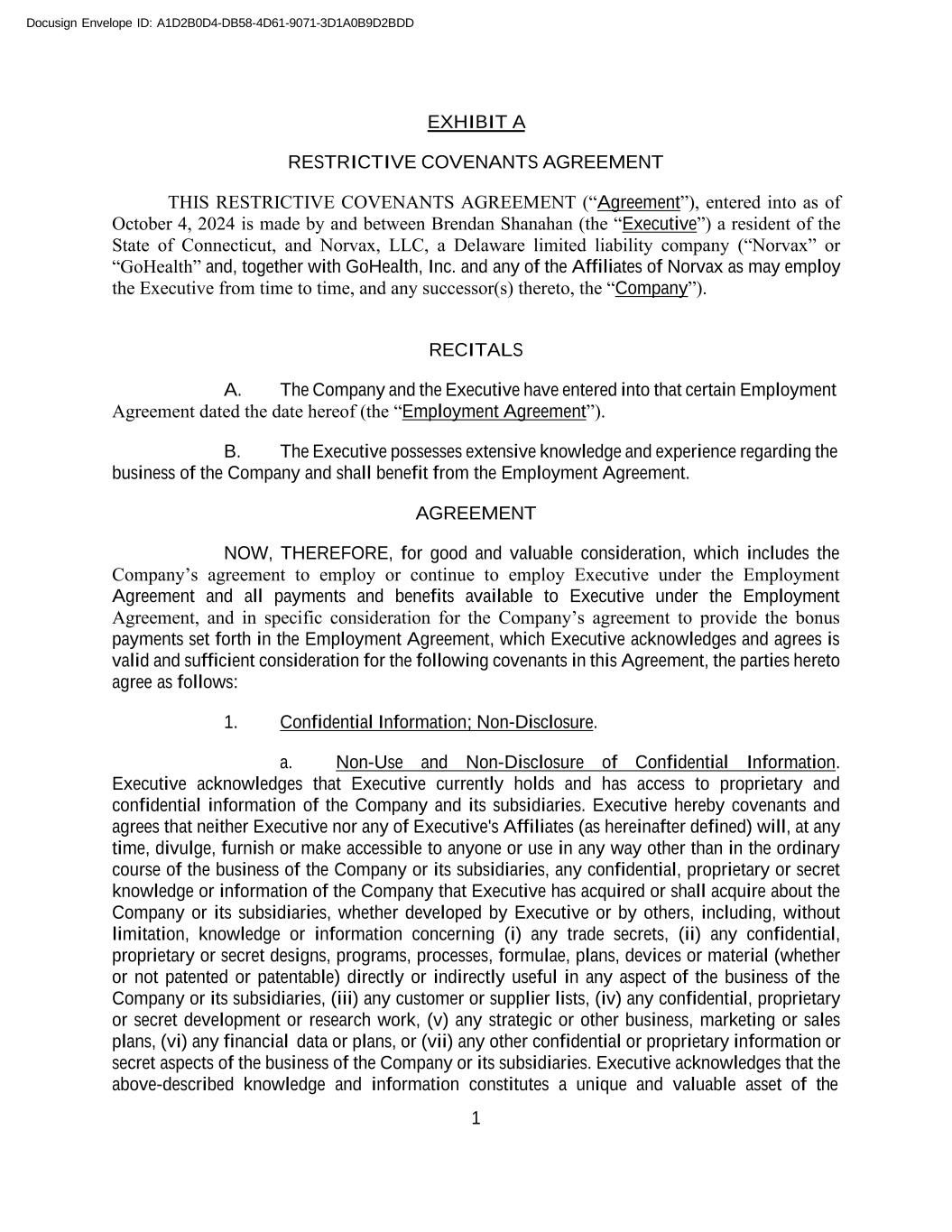 Docusign Envelope ID: A1D2B0D4-DB58-4D61-9071-3D1A0B9D2BDD 1 EXHIBIT A RESTRICTIVE COVENANTS AGREEMENT THIS RESTRICTIVE COVENANTS AGREEMENT (“Agreement”), entered into as of October 4, 2024 is made by and between Brendan Shanahan (the “Executive”) a resident of the State of Connecticut, and Norvax, LLC, a Delaware limited liability company (“Norvax” or “GoHealth” and, together with GoHealth, Inc. and any of the Affiliates of Norvax as may employ the Executive from time to time, and any successor(s) thereto, the “Company”). RECITALS A. The Company and the Executive have entered into that certain Employment Agreement dated the date hereof (the “Employment Agreement”). B. The Executive possesses extensive knowledge and experience regarding the business of the Company and shall benefit from the Employment Agreement. AGREEMENT NOW, THEREFORE, for good and valuable consideration, which includes the Company’s agreement to employ or continue to employ Executive under the Employment Agreement and all payments and benefits available to Executive under the Employment Agreement, and in specific consideration for the Company’s agreement to provide the bonus payments set forth in the Employment Agreement, which Executive acknowledges and agrees is valid and sufficient consideration for the following covenants in this Agreement, the parties hereto agree as follows: 1. Confidential Information; Non-Disclosure. a. Non-Use and Non-Disclosure of Confidential Information. Executive acknowledges that Executive currently holds and has access to proprietary and confidential information of the Company and its subsidiaries. Executive hereby covenants and agrees that neither Executive nor any of Executive's Affiliates (as hereinafter defined) will, at any time, divulge, furnish or make accessible to anyone or use in any way other than in the ordinary course of the business of the Company or its subsidiaries, any confidential, proprietary or secret knowledge or information of the Company that Executive has acquired or shall acquire about the Company or its subsidiaries, whether developed by Executive or by others, including, without limitation, knowledge or information concerning (i) any trade secrets, (ii) any confidential, proprietary or secret designs, programs, processes, formulae, plans, devices or material (whether or not patented or patentable) directly or indirectly useful in any aspect of the business of the Company or its subsidiaries, (iii) any customer or supplier lists, (iv) any confidential, proprietary or secret development or research work, (v) any strategic or other business, marketing or sales plans, (vi) any financial data or plans, or (vii) any other confidential or proprietary information or secret aspects of the business of the Company or its subsidiaries. Executive acknowledges that the above-described knowledge and information constitutes a unique and valuable asset of the