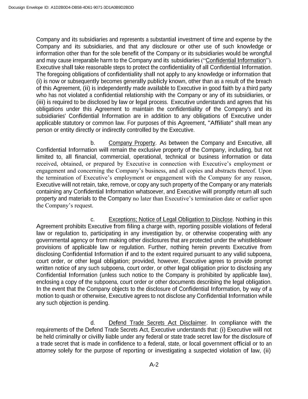 Docusign Envelope ID: A1D2B0D4-DB58-4D61-9071-3D1A0B9D2BDD A-2 Company and its subsidiaries and represents a substantial investment of time and expense by the Company and its subsidiaries, and that any disclosure or other use of such knowledge or information other than for the sole benefit of the Company or its subsidiaries would be wrongful and may cause irreparable harm to the Company and its subsidiaries (“Confidential Information”). Executive shall take reasonable steps to protect the confidentiality of all Confidential Information. The foregoing obligations of confidentiality shall not apply to any knowledge or information that (i) is now or subsequently becomes generally publicly known, other than as a result of the breach of this Agreement, (ii) is independently made available to Executive in good faith by a third party who has not violated a confidential relationship with the Company or any of its subsidiaries, or (iii) is required to be disclosed by law or legal process. Executive understands and agrees that his obligations under this Agreement to maintain the confidentiality of the Company's and its subsidiaries' Confidential Information are in addition to any obligations of Executive under applicable statutory or common law. For purposes of this Agreement, "Affiliate" shall mean any person or entity directly or indirectly controlled by the Executive. b. Company Property. As between the Company and Executive, all Confidential Information will remain the exclusive property of the Company, including, but not limited to, all financial, commercial, operational, technical or business information or data received, obtained, or prepared by Executive in connection with Executive’s employment or engagement and concerning the Company’s business, and all copies and abstracts thereof. Upon the termination of Executive’s employment or engagement with the Company for any reason, Executive will not retain, take, remove, or copy any such property of the Company or any materials containing any Confidential Information whatsoever, and Executive will promptly return all such property and materials to the Company no later than Executive’s termination date or earlier upon the Company’s request. c. Exceptions; Notice of Legal Obligation to Disclose. Nothing in this Agreement prohibits Executive from filing a charge with, reporting possible violations of federal law or regulation to, participating in any investigation by, or otherwise cooperating with any governmental agency or from making other disclosures that are protected under the whistleblower provisions of applicable law or regulation. Further, nothing herein prevents Executive from disclosing Confidential Information if and to the extent required pursuant to any valid subpoena, court order, or other legal obligation; provided, however, Executive agrees to provide prompt written notice of any such subpoena, court order, or other legal obligation prior to disclosing any Confidential Information (unless such notice to the Company is prohibited by applicable law), enclosing a copy of the subpoena, court order or other documents describing the legal obligation. In the event that the Company objects to the disclosure of Confidential Information, by way of a motion to quash or otherwise, Executive agrees to not disclose any Confidential Information while any such objection is pending. d. Defend Trade Secrets Act Disclaimer. In compliance with the requirements of the Defend Trade Secrets Act, Executive understands that: (i) Executive will not be held criminally or civilly liable under any federal or state trade secret law for the disclosure of a trade secret that is made in confidence to a federal, state, or local government official or to an attorney solely for the purpose of reporting or investigating a suspected violation of law, (ii)