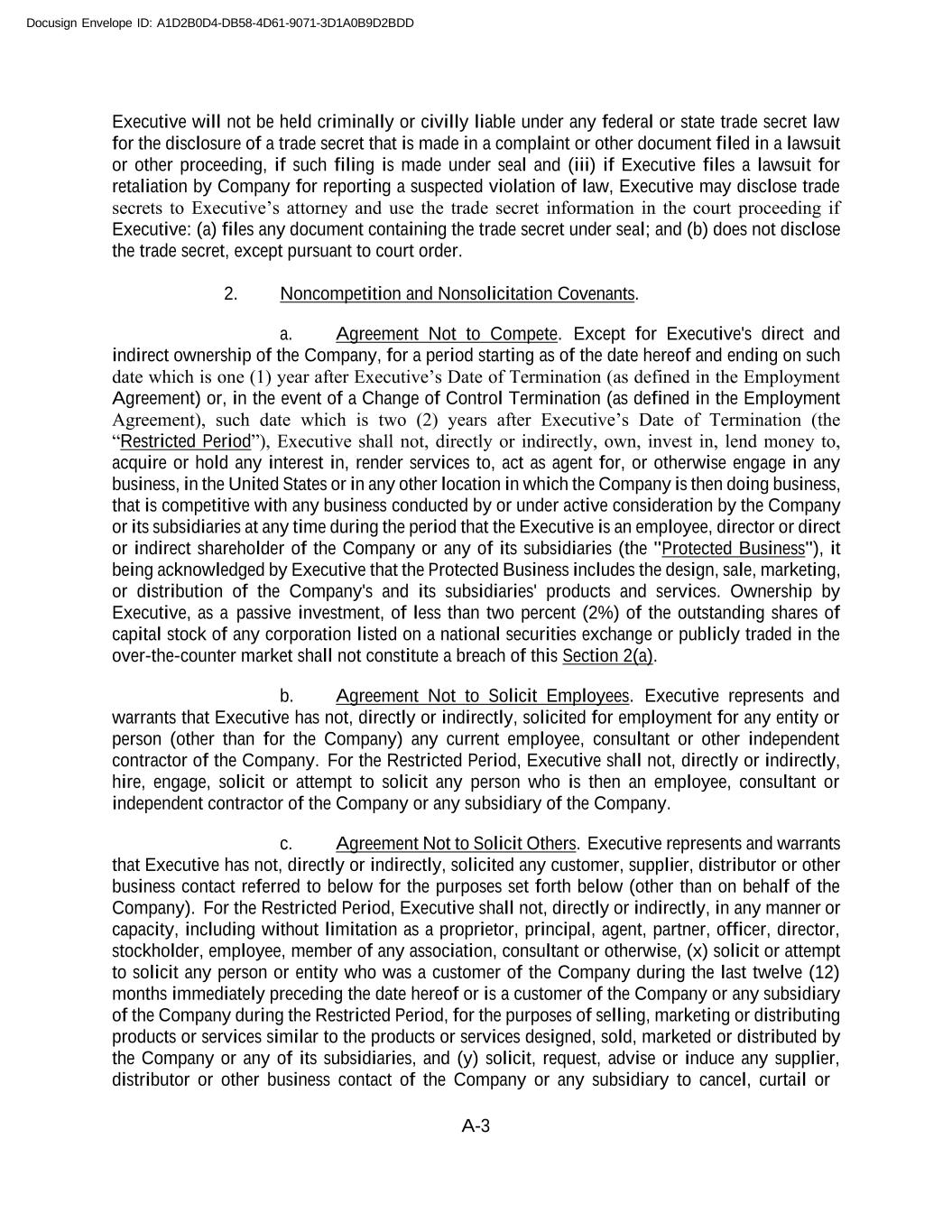 Docusign Envelope ID: A1D2B0D4-DB58-4D61-9071-3D1A0B9D2BDD A-3 Executive will not be held criminally or civilly liable under any federal or state trade secret law for the disclosure of a trade secret that is made in a complaint or other document filed in a lawsuit or other proceeding, if such filing is made under seal and (iii) if Executive files a lawsuit for retaliation by Company for reporting a suspected violation of law, Executive may disclose trade secrets to Executive’s attorney and use the trade secret information in the court proceeding if Executive: (a) files any document containing the trade secret under seal; and (b) does not disclose the trade secret, except pursuant to court order. 2. Noncompetition and Nonsolicitation Covenants. a. Agreement Not to Compete. Except for Executive's direct and indirect ownership of the Company, for a period starting as of the date hereof and ending on such date which is one (1) year after Executive’s Date of Termination (as defined in the Employment Agreement) or, in the event of a Change of Control Termination (as defined in the Employment Agreement), such date which is two (2) years after Executive’s Date of Termination (the “Restricted Period”), Executive shall not, directly or indirectly, own, invest in, lend money to, acquire or hold any interest in, render services to, act as agent for, or otherwise engage in any business, in the United States or in any other location in which the Company is then doing business, that is competitive with any business conducted by or under active consideration by the Company or its subsidiaries at any time during the period that the Executive is an employee, director or direct or indirect shareholder of the Company or any of its subsidiaries (the "Protected Business"), it being acknowledged by Executive that the Protected Business includes the design, sale, marketing, or distribution of the Company's and its subsidiaries' products and services. Ownership by Executive, as a passive investment, of less than two percent (2%) of the outstanding shares of capital stock of any corporation listed on a national securities exchange or publicly traded in the over-the-counter market shall not constitute a breach of this Section 2(a). b. Agreement Not to Solicit Employees. Executive represents and warrants that Executive has not, directly or indirectly, solicited for employment for any entity or person (other than for the Company) any current employee, consultant or other independent contractor of the Company. For the Restricted Period, Executive shall not, directly or indirectly, hire, engage, solicit or attempt to solicit any person who is then an employee, consultant or independent contractor of the Company or any subsidiary of the Company. c. Agreement Not to Solicit Others. Executive represents and warrants that Executive has not, directly or indirectly, solicited any customer, supplier, distributor or other business contact referred to below for the purposes set forth below (other than on behalf of the Company). For the Restricted Period, Executive shall not, directly or indirectly, in any manner or capacity, including without limitation as a proprietor, principal, agent, partner, officer, director, stockholder, employee, member of any association, consultant or otherwise, (x) solicit or attempt to solicit any person or entity who was a customer of the Company during the last twelve (12) months immediately preceding the date hereof or is a customer of the Company or any subsidiary of the Company during the Restricted Period, for the purposes of selling, marketing or distributing products or services similar to the products or services designed, sold, marketed or distributed by the Company or any of its subsidiaries, and (y) solicit, request, advise or induce any supplier, distributor or other business contact of the Company or any subsidiary to cancel, curtail or