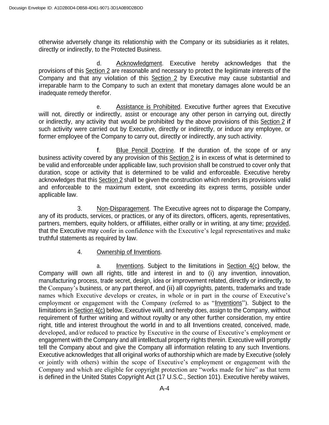 Docusign Envelope ID: A1D2B0D4-DB58-4D61-9071-3D1A0B9D2BDD A-4 otherwise adversely change its relationship with the Company or its subsidiaries as it relates, directly or indirectly, to the Protected Business. d. Acknowledgment. Executive hereby acknowledges that the provisions of this Section 2 are reasonable and necessary to protect the legitimate interests of the Company and that any violation of this Section 2 by Executive may cause substantial and irreparable harm to the Company to such an extent that monetary damages alone would be an inadequate remedy therefor. e. Assistance is Prohibited. Executive further agrees that Executive will not, directly or indirectly, assist or encourage any other person in carrying out, directly or indirectly, any activity that would be prohibited by the above provisions of this Section 2 if such activity were carried out by Executive, directly or indirectly, or induce any employee, or former employee of the Company to carry out, directly or indirectly, any such activity. f. Blue Pencil Doctrine. If the duration of, the scope of or any business activity covered by any provision of this Section 2 is in excess of what is determined to be valid and enforceable under applicable law, such provision shall be construed to cover only that duration, scope or activity that is determined to be valid and enforceable. Executive hereby acknowledges that this Section 2 shall be given the construction which renders its provisions valid and enforceable to the maximum extent, snot exceeding its express terms, possible under applicable law. 3. Non-Disparagement. The Executive agrees not to disparage the Company, any of its products, services, or practices, or any of its directors, officers, agents, representatives, partners, members, equity holders, or affiliates, either orally or in writing, at any time; provided, that the Executive may confer in confidence with the Executive’s legal representatives and make truthful statements as required by law. 4. Ownership of Inventions. a. Inventions. Subject to the limitations in Section 4(c) below, the Company will own all rights, title and interest in and to (i) any invention, innovation, manufacturing process, trade secret, design, idea or improvement related, directly or indirectly, to the Company’s business, or any part thereof, and (ii) all copyrights, patents, trademarks and trade names which Executive develops or creates, in whole or in part in the course of Executive’s employment or engagement with the Company (referred to as “Inventions”). Subject to the limitations in Section 4(c) below, Executive will, and hereby does, assign to the Company, without requirement of further writing and without royalty or any other further consideration, my entire right, title and interest throughout the world in and to all Inventions created, conceived, made, developed, and/or reduced to practice by Executive in the course of Executive’s employment or engagement with the Company and all intellectual property rights therein. Executive will promptly tell the Company about and give the Company all information relating to any such Inventions. Executive acknowledges that all original works of authorship which are made by Executive (solely or jointly with others) within the scope of Executive’s employment or engagement with the Company and which are eligible for copyright protection are “works made for hire” as that term is defined in the United States Copyright Act (17 U.S.C., Section 101). Executive hereby waives,