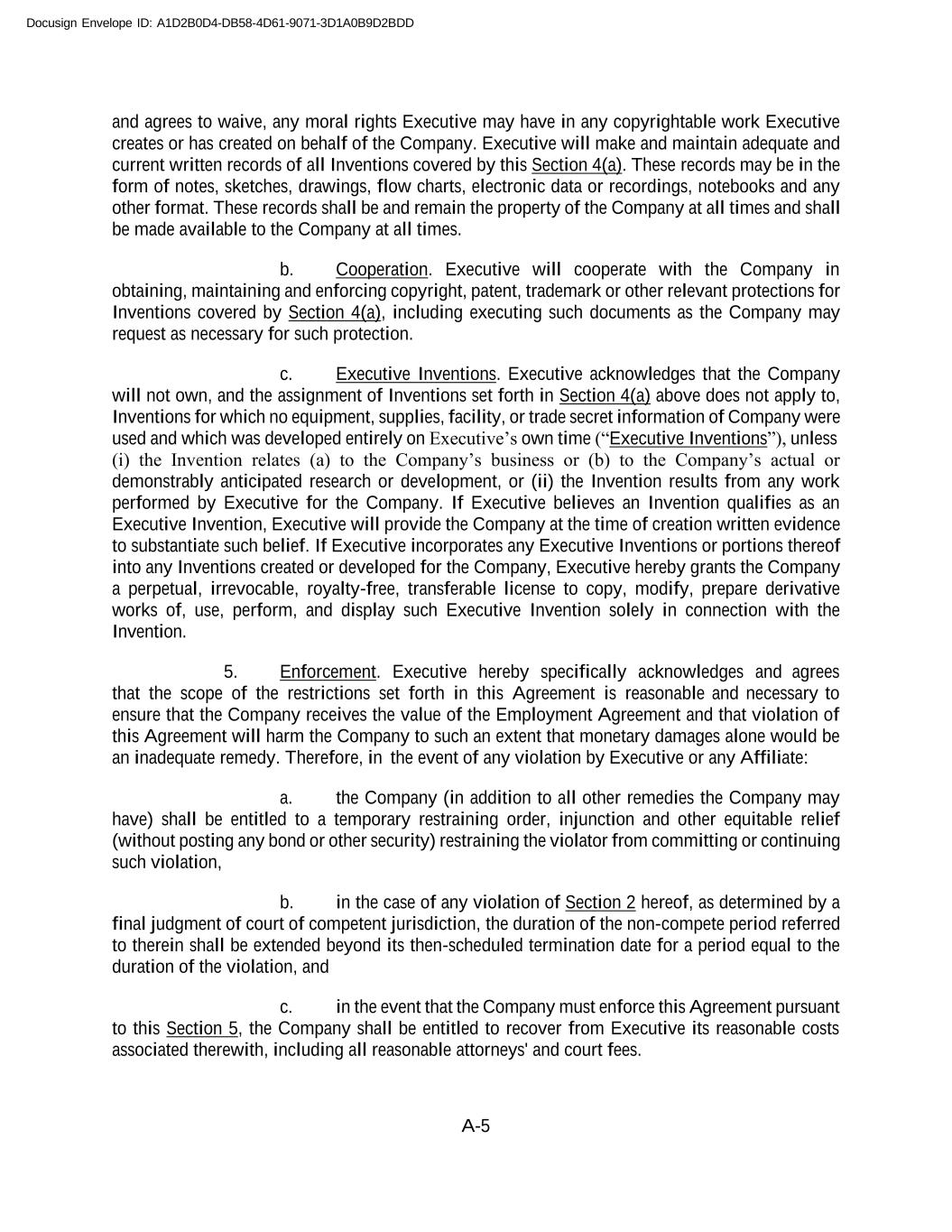Docusign Envelope ID: A1D2B0D4-DB58-4D61-9071-3D1A0B9D2BDD A-5 and agrees to waive, any moral rights Executive may have in any copyrightable work Executive creates or has created on behalf of the Company. Executive will make and maintain adequate and current written records of all Inventions covered by this Section 4(a). These records may be in the form of notes, sketches, drawings, flow charts, electronic data or recordings, notebooks and any other format. These records shall be and remain the property of the Company at all times and shall be made available to the Company at all times. b. Cooperation. Executive will cooperate with the Company in obtaining, maintaining and enforcing copyright, patent, trademark or other relevant protections for Inventions covered by Section 4(a), including executing such documents as the Company may request as necessary for such protection. c. Executive Inventions. Executive acknowledges that the Company will not own, and the assignment of Inventions set forth in Section 4(a) above does not apply to, Inventions for which no equipment, supplies, facility, or trade secret information of Company were used and which was developed entirely on Executive’s own time (“Executive Inventions”), unless (i) the Invention relates (a) to the Company’s business or (b) to the Company’s actual or demonstrably anticipated research or development, or (ii) the Invention results from any work performed by Executive for the Company. If Executive believes an Invention qualifies as an Executive Invention, Executive will provide the Company at the time of creation written evidence to substantiate such belief. If Executive incorporates any Executive Inventions or portions thereof into any Inventions created or developed for the Company, Executive hereby grants the Company a perpetual, irrevocable, royalty-free, transferable license to copy, modify, prepare derivative works of, use, perform, and display such Executive Invention solely in connection with the Invention. 5. Enforcement. Executive hereby specifically acknowledges and agrees that the scope of the restrictions set forth in this Agreement is reasonable and necessary to ensure that the Company receives the value of the Employment Agreement and that violation of this Agreement will harm the Company to such an extent that monetary damages alone would be an inadequate remedy. Therefore, in the event of any violation by Executive or any Affiliate: a. the Company (in addition to all other remedies the Company may have) shall be entitled to a temporary restraining order, injunction and other equitable relief (without posting any bond or other security) restraining the violator from committing or continuing such violation, b. in the case of any violation of Section 2 hereof, as determined by a final judgment of court of competent jurisdiction, the duration of the non-compete period referred to therein shall be extended beyond its then-scheduled termination date for a period equal to the duration of the violation, and c. in the event that the Company must enforce this Agreement pursuant to this Section 5, the Company shall be entitled to recover from Executive its reasonable costs associated therewith, including all reasonable attorneys' and court fees.