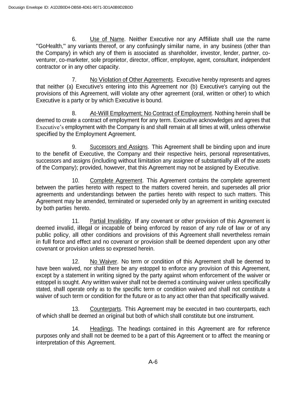 Docusign Envelope ID: A1D2B0D4-DB58-4D61-9071-3D1A0B9D2BDD A-6 6. Use of Name. Neither Executive nor any Affiliate shall use the name "GoHealth," any variants thereof, or any confusingly similar name, in any business (other than the Company) in which any of them is associated as shareholder, investor, lender, partner, co- venturer, co-marketer, sole proprietor, director, officer, employee, agent, consultant, independent contractor or in any other capacity. 7. No Violation of Other Agreements. Executive hereby represents and agrees that neither (a) Executive's entering into this Agreement nor (b) Executive's carrying out the provisions of this Agreement, will violate any other agreement (oral, written or other) to which Executive is a party or by which Executive is bound. 8. At-Will Employment; No Contract of Employment. Nothing herein shall be deemed to create a contract of employment for any term. Executive acknowledges and agrees that Executive’s employment with the Company is and shall remain at all times at will, unless otherwise specified by the Employment Agreement. 9. Successors and Assigns. This Agreement shall be binding upon and inure to the benefit of Executive, the Company and their respective heirs, personal representatives, successors and assigns (including without limitation any assignee of substantially all of the assets of the Company); provided, however, that this Agreement may not be assigned by Executive. 10. Complete Agreement. This Agreement contains the complete agreement between the parties hereto with respect to the matters covered herein, and supersedes all prior agreements and understandings between the parties hereto with respect to such matters. This Agreement may be amended, terminated or superseded only by an agreement in writing executed by both parties hereto. 11. Partial Invalidity. If any covenant or other provision of this Agreement is deemed invalid, illegal or incapable of being enforced by reason of any rule of law or of any public policy, all other conditions and provisions of this Agreement shall nevertheless remain in full force and effect and no covenant or provision shall be deemed dependent upon any other covenant or provision unless so expressed herein. 12. No Waiver. No term or condition of this Agreement shall be deemed to have been waived, nor shall there be any estoppel to enforce any provision of this Agreement, except by a statement in writing signed by the party against whom enforcement of the waiver or estoppel is sought. Any written waiver shall not be deemed a continuing waiver unless specifically stated, shall operate only as to the specific term or condition waived and shall not constitute a waiver of such term or condition for the future or as to any act other than that specifically waived. 13. Counterparts. This Agreement may be executed in two counterparts, each of which shall be deemed an original but both of which shall constitute but one instrument. 14. Headings. The headings contained in this Agreement are for reference purposes only and shall not be deemed to be a part of this Agreement or to affect the meaning or interpretation of this Agreement.
