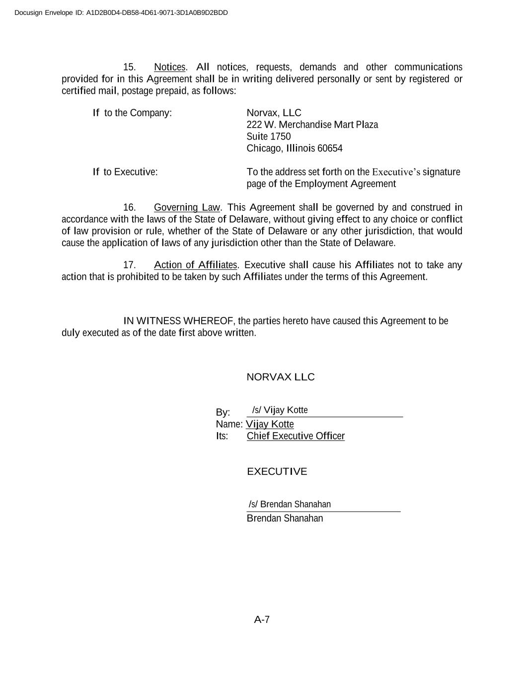 Docusign Envelope ID: A1D2B0D4-DB58-4D61-9071-3D1A0B9D2BDD A-7 15. Notices. All notices, requests, demands and other communications provided for in this Agreement shall be in writing delivered personally or sent by registered or certified mail, postage prepaid, as follows: If to the Company: Norvax, LLC 222 W. Merchandise Mart Plaza Suite 1750 Chicago, Illinois 60654 If to Executive: To the address set forth on the Executive’s signature page of the Employment Agreement 16. Governing Law. This Agreement shall be governed by and construed in accordance with the laws of the State of Delaware, without giving effect to any choice or conflict of law provision or rule, whether of the State of Delaware or any other jurisdiction, that would cause the application of laws of any jurisdiction other than the State of Delaware. 17. Action of Affiliates. Executive shall cause his Affiliates not to take any action that is prohibited to be taken by such Affiliates under the terms of this Agreement. IN WITNESS WHEREOF, the parties hereto have caused this Agreement to be duly executed as of the date first above written. NORVAX LLC By: Name: Vijay Kotte Its: Chief Executive Officer EXECUTIVE Brendan Shanahan /s/ Vijay Kotte /s/ Brendan Shanahan