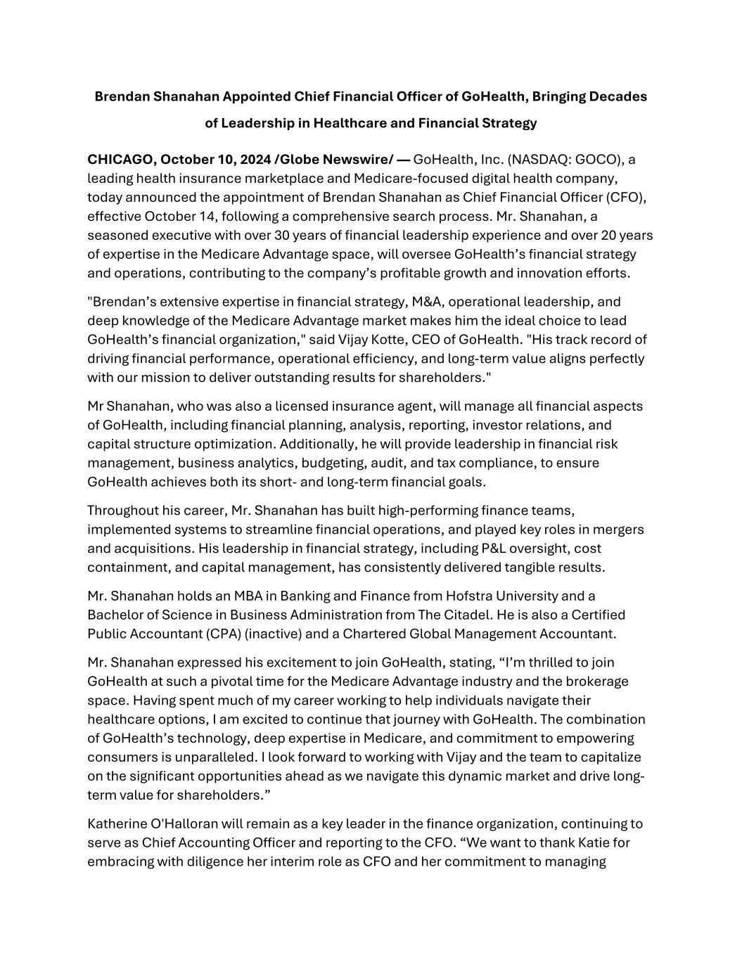 Brendan Shanahan Appointed Chief Financial Officer of GoHealth, Bringing Decades of Leadership in Healthcare and Financial Strategy CHICAGO, October 10, 2024 /Globe Newswire/ — GoHealth, Inc. (NASDAQ: GOCO), a leading health insurance marketplace and Medicare-focused digital health company, today announced the appointment of Brendan Shanahan as Chief Financial Officer (CFO), effective October 14, following a comprehensive search process. Mr. Shanahan, a seasoned executive with over 30 years of financial leadership experience and over 20 years of expertise in the Medicare Advantage space, will oversee GoHealth’s financial strategy and operations, contributing to the company’s profitable growth and innovation efforts. "Brendan’s extensive expertise in financial strategy, M&A, operational leadership, and deep knowledge of the Medicare Advantage market makes him the ideal choice to lead GoHealth’s financial organization," said Vijay Kotte, CEO of GoHealth. "His track record of driving financial performance, operational efficiency, and long-term value aligns perfectly with our mission to deliver outstanding results for shareholders." Mr Shanahan, who was also a licensed insurance agent, will manage all financial aspects of GoHealth, including financial planning, analysis, reporting, investor relations, and capital structure optimization. Additionally, he will provide leadership in financial risk management, business analytics, budgeting, audit, and tax compliance, to ensure GoHealth achieves both its short- and long-term financial goals. Throughout his career, Mr. Shanahan has built high-performing finance teams, implemented systems to streamline financial operations, and played key roles in mergers and acquisitions. His leadership in financial strategy, including P&L oversight, cost containment, and capital management, has consistently delivered tangible results. Mr. Shanahan holds an MBA in Banking and Finance from Hofstra University and a Bachelor of Science in Business Administration from The Citadel. He is also a Certified Public Accountant (CPA) (inactive) and a Chartered Global Management Accountant. Mr. Shanahan expressed his excitement to join GoHealth, stating, “I’m thrilled to join GoHealth at such a pivotal time for the Medicare Advantage industry and the brokerage space. Having spent much of my career working to help individuals navigate their healthcare options, I am excited to continue that journey with GoHealth. The combination of GoHealth’s technology, deep expertise in Medicare, and commitment to empowering consumers is unparalleled. I look forward to working with Vijay and the team to capitalize on the significant opportunities ahead as we navigate this dynamic market and drive long- term value for shareholders.” Katherine O'Halloran will remain as a key leader in the finance organization, continuing to serve as Chief Accounting Officer and reporting to the CFO. “We want to thank Katie for embracing with diligence her interim role as CFO and her commitment to managing