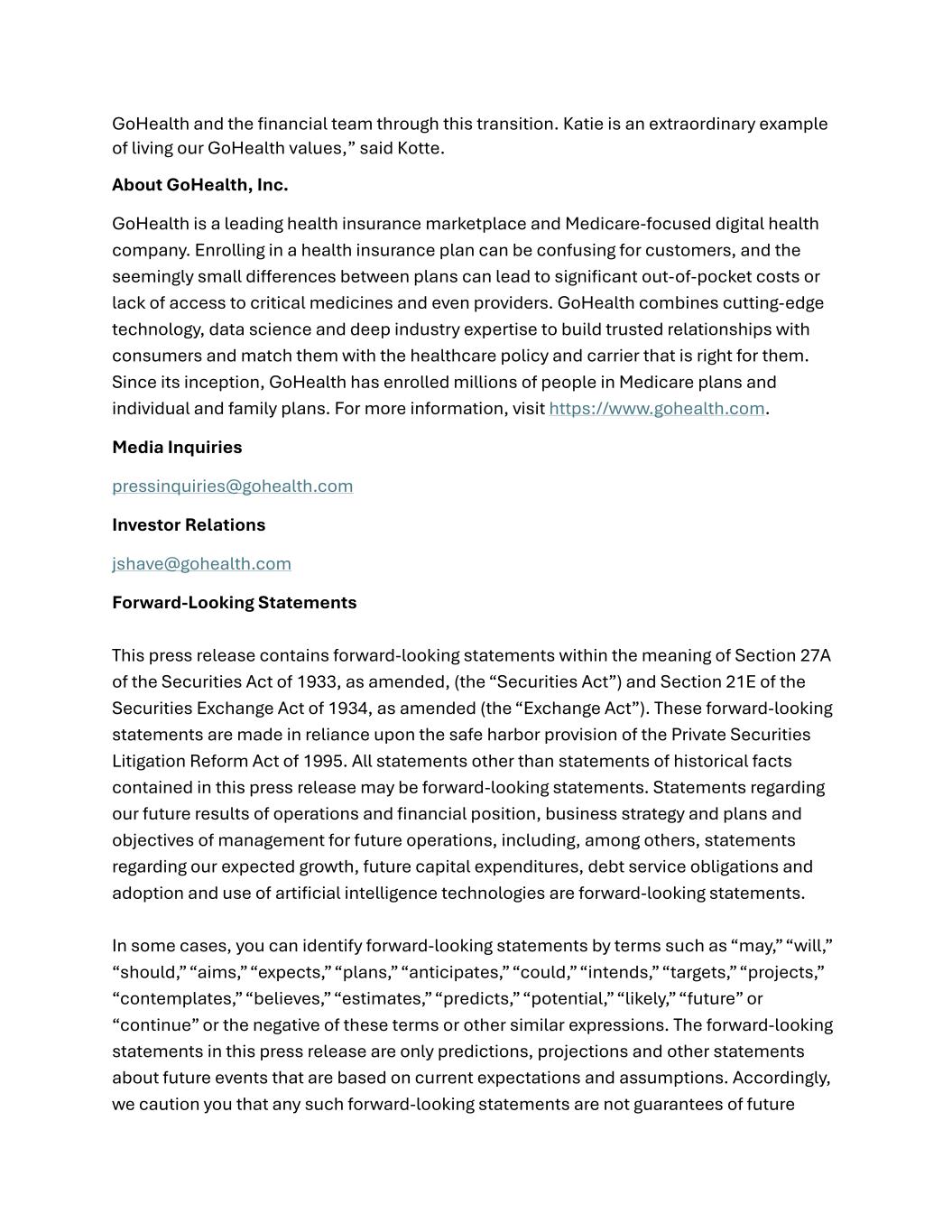 GoHealth and the financial team through this transition. Katie is an extraordinary example of living our GoHealth values,” said Kotte. About GoHealth, Inc. GoHealth is a leading health insurance marketplace and Medicare-focused digital health company. Enrolling in a health insurance plan can be confusing for customers, and the seemingly small differences between plans can lead to significant out-of-pocket costs or lack of access to critical medicines and even providers. GoHealth combines cutting-edge technology, data science and deep industry expertise to build trusted relationships with consumers and match them with the healthcare policy and carrier that is right for them. Since its inception, GoHealth has enrolled millions of people in Medicare plans and individual and family plans. For more information, visit https://www.gohealth.com. Media Inquiries pressinquiries@gohealth.com Investor Relations jshave@gohealth.com Forward-Looking Statements This press release contains forward-looking statements within the meaning of Section 27A of the Securities Act of 1933, as amended, (the “Securities Act”) and Section 21E of the Securities Exchange Act of 1934, as amended (the “Exchange Act”). These forward-looking statements are made in reliance upon the safe harbor provision of the Private Securities Litigation Reform Act of 1995. All statements other than statements of historical facts contained in this press release may be forward-looking statements. Statements regarding our future results of operations and financial position, business strategy and plans and objectives of management for future operations, including, among others, statements regarding our expected growth, future capital expenditures, debt service obligations and adoption and use of artificial intelligence technologies are forward-looking statements. In some cases, you can identify forward-looking statements by terms such as “may,” “will,” “should,” “aims,” “expects,” “plans,” “anticipates,” “could,” “intends,” “targets,” “projects,” “contemplates,” “believes,” “estimates,” “predicts,” “potential,” “likely,” “future” or “continue” or the negative of these terms or other similar expressions. The forward-looking statements in this press release are only predictions, projections and other statements about future events that are based on current expectations and assumptions. Accordingly, we caution you that any such forward-looking statements are not guarantees of future